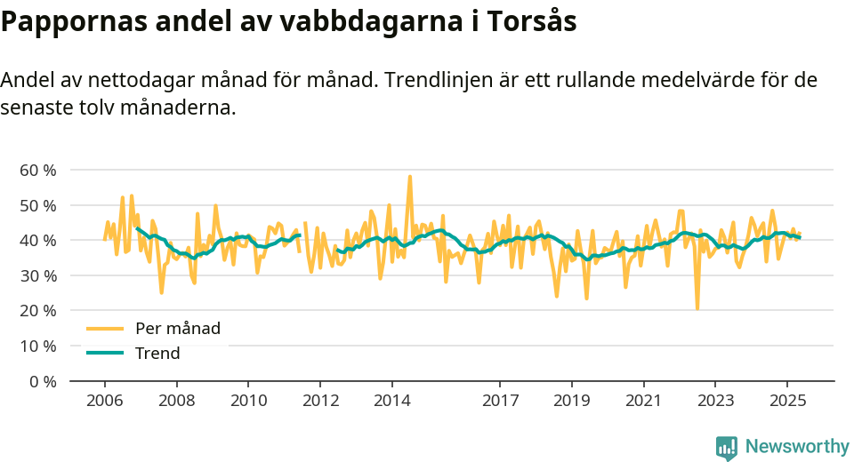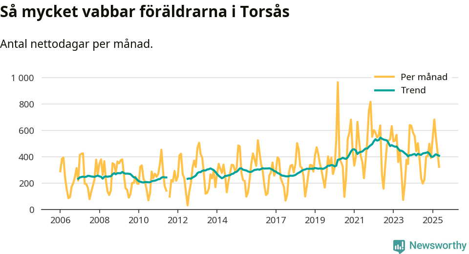 Torsås ligger en bit från ett jämställt uttag. Under de senaste tolv månaderna har männen stått för 41 procent av all vabb i kommunen. Pappornas uttag peakade vintern 2006 då kommunens fäder var uppe i 43 procent av vabbdagarna 1.