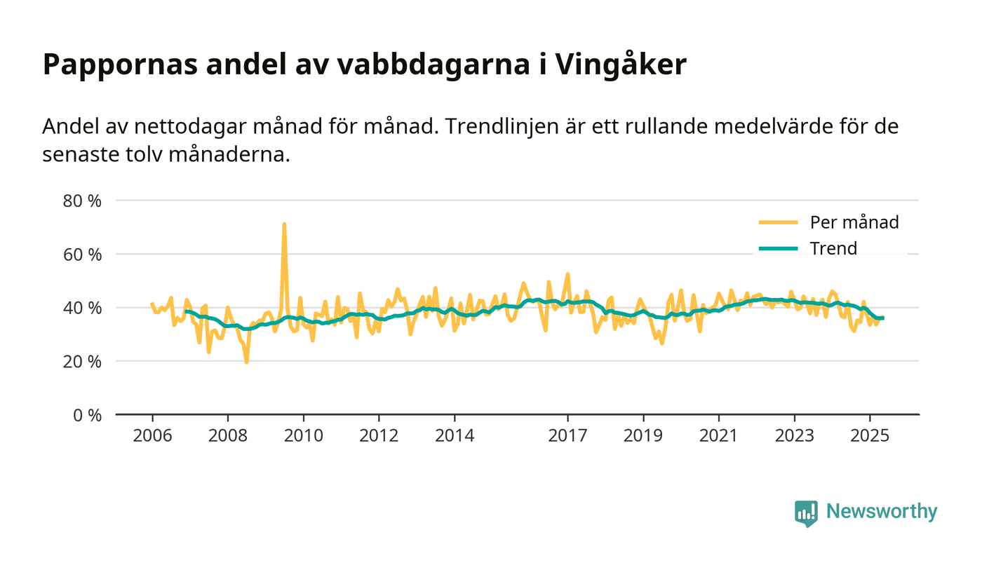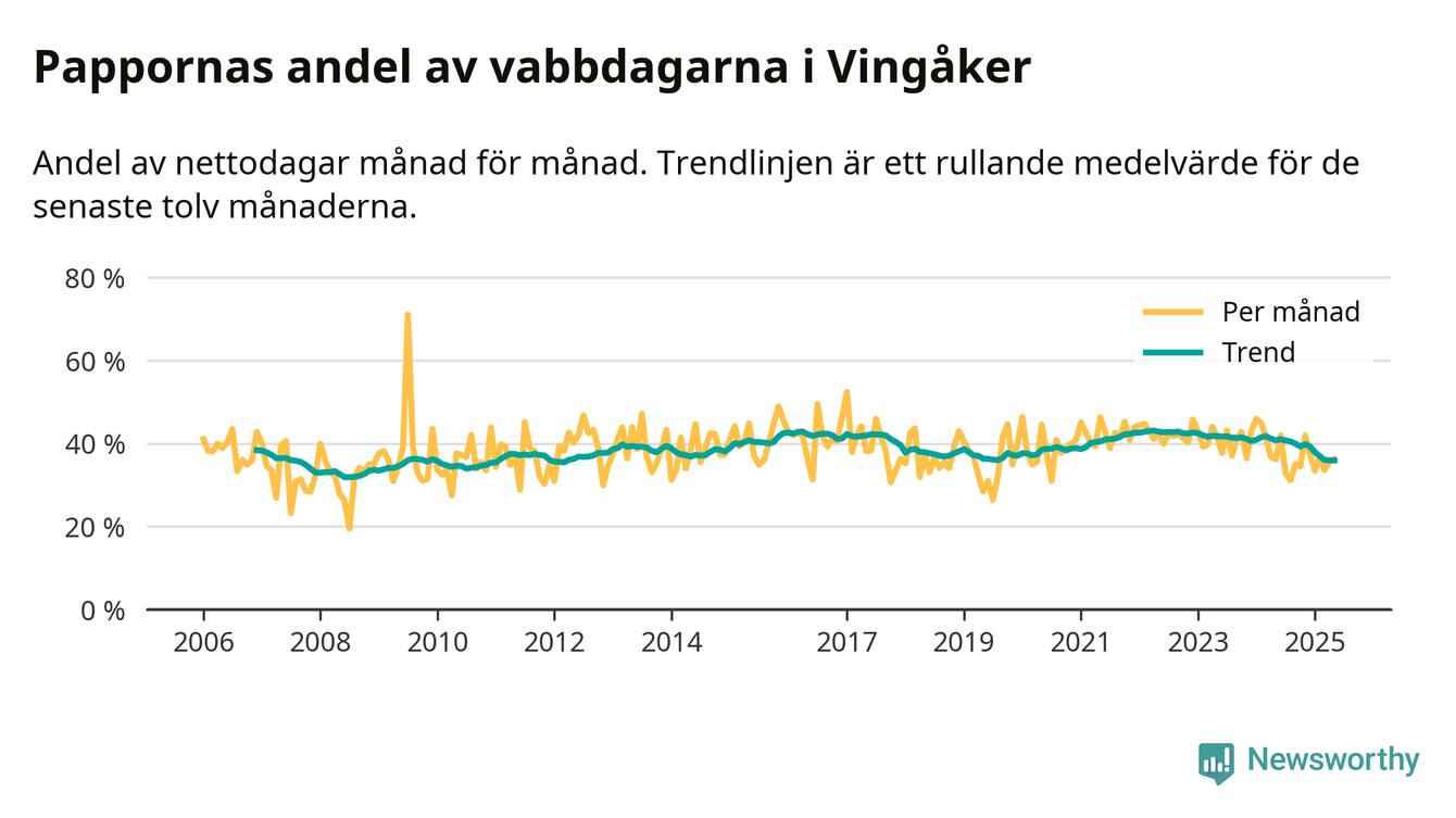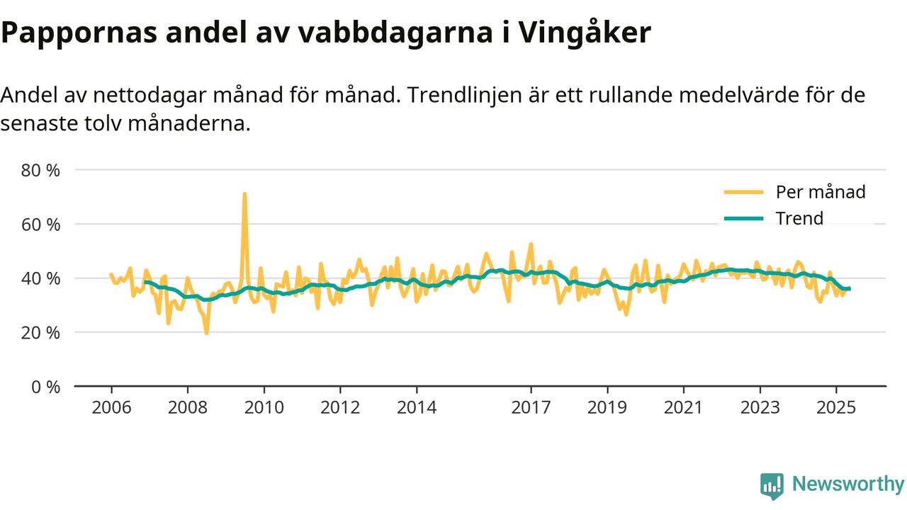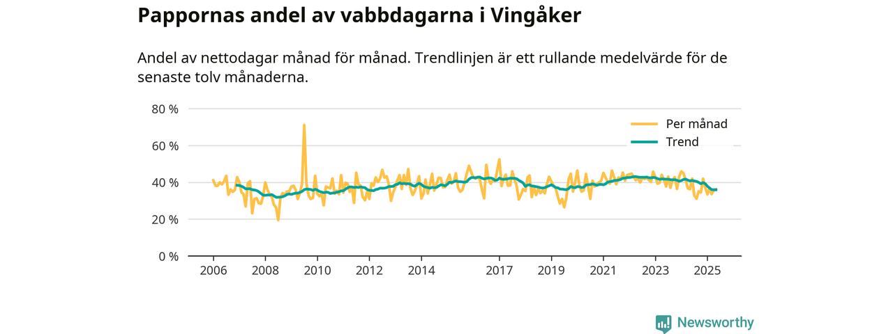 Vingåker ligger en bit från ett jämställt uttag. Under de senaste tolv månaderna har männen stått för 36 procent av all vabb i kommunen. Det är en lägre andel än på över 13 år.