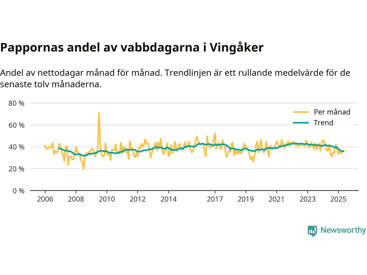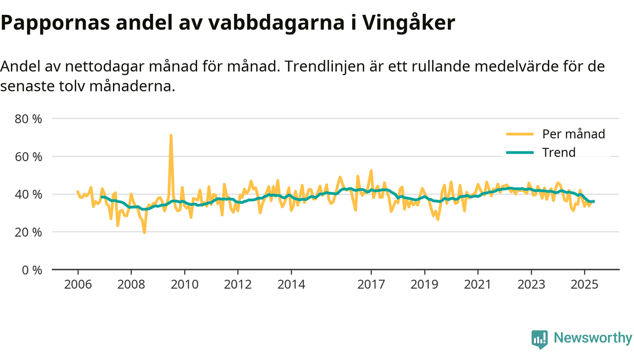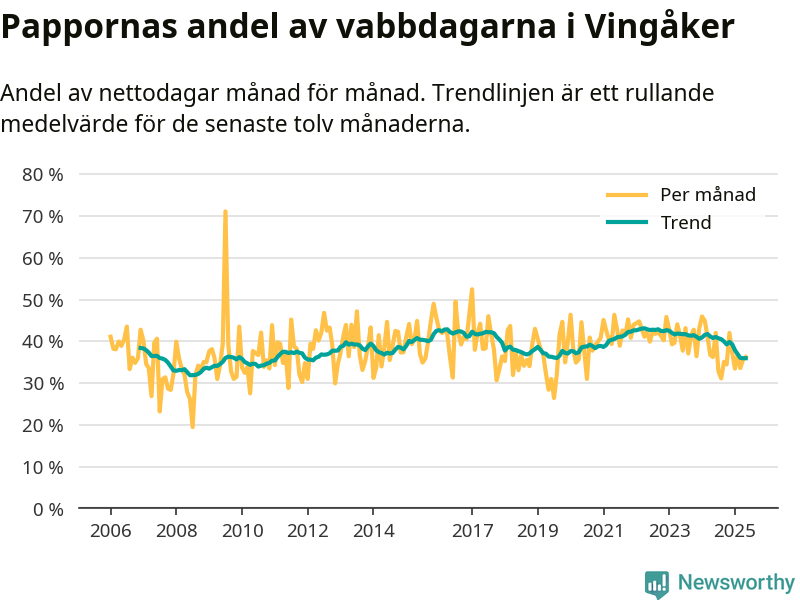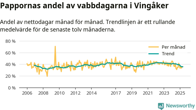 Vingåker ligger en bit från ett jämställt uttag. Under de senaste tolv månaderna har männen stått för 36 procent av all vabb i kommunen. Det är en lägre andel än på över 13 år.