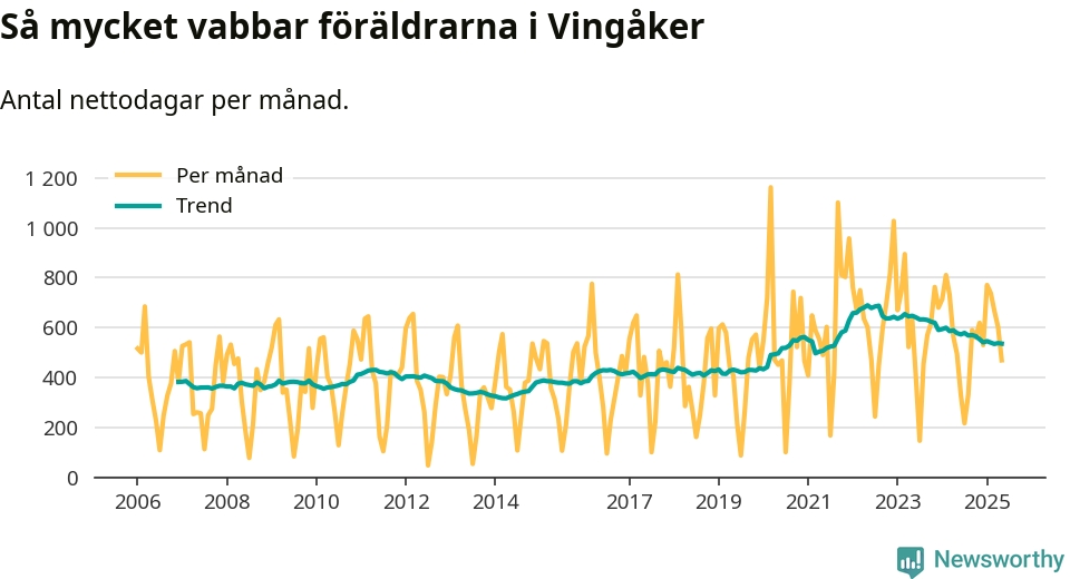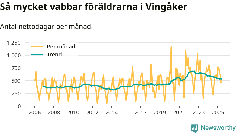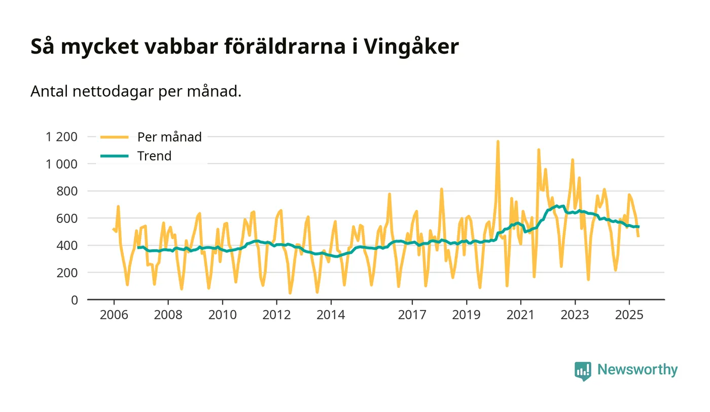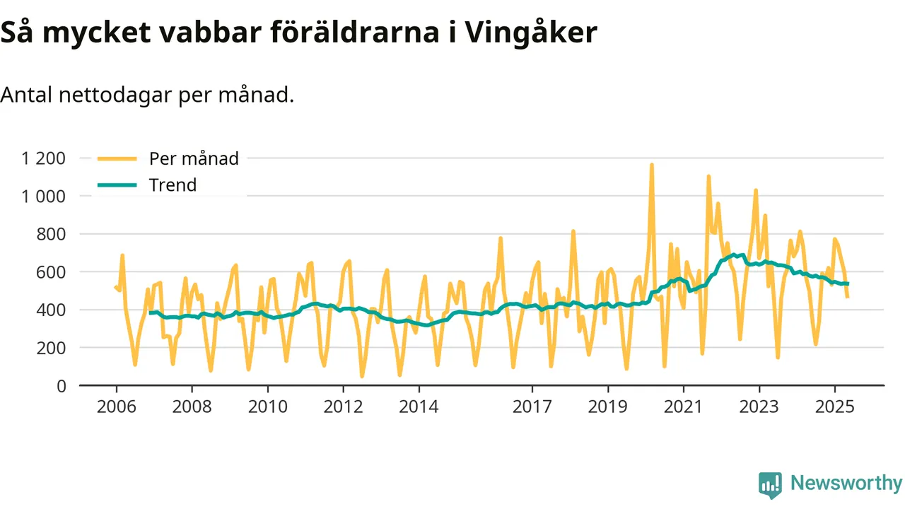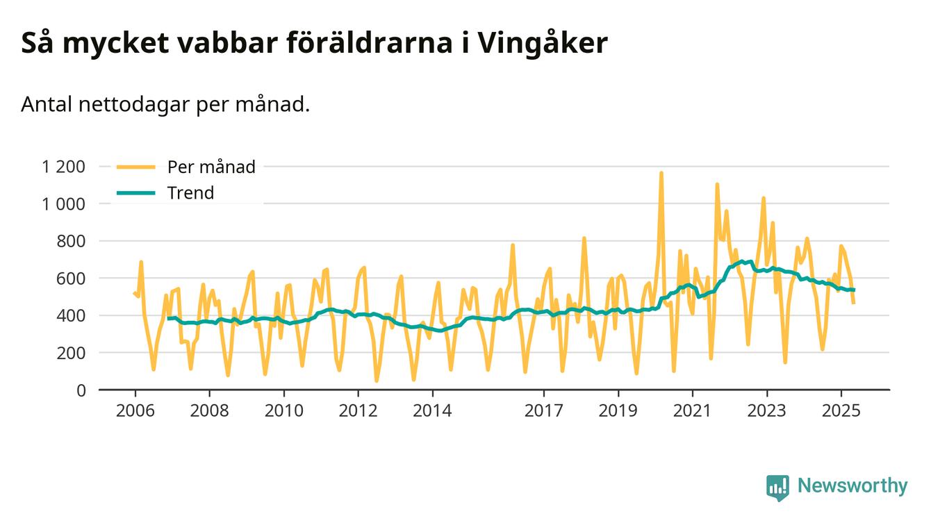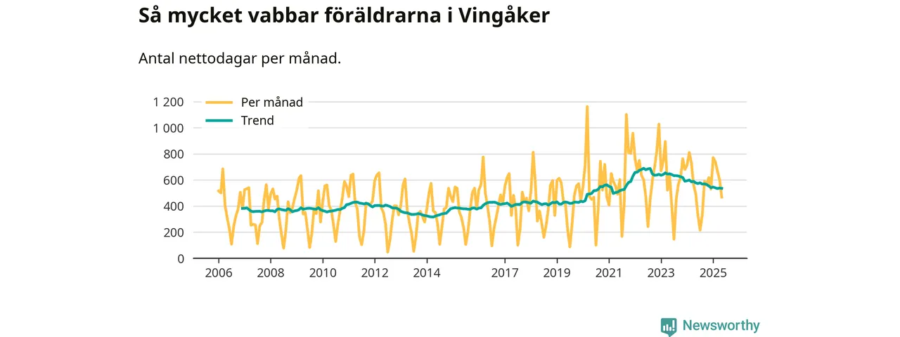 När coronapandemin drog in i mars 2020 peakade antalet vabbdagar både i Vingåkers kommun och i riket som helhet. Under de senaste två åren har vabbuttaget börjat minska igen.