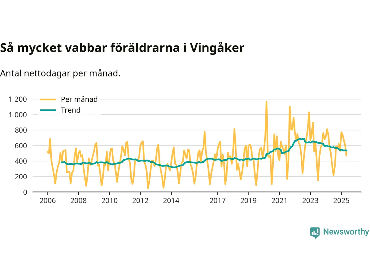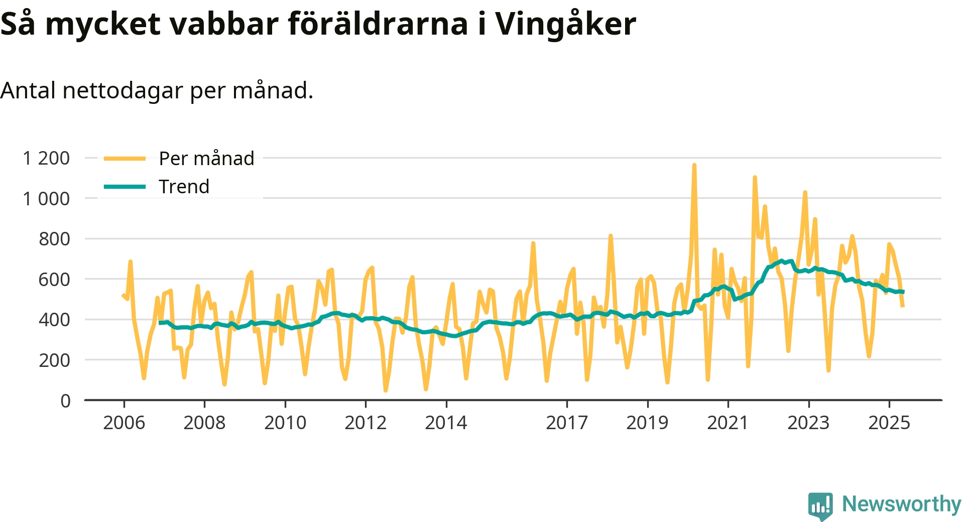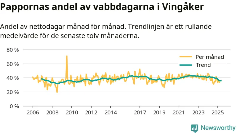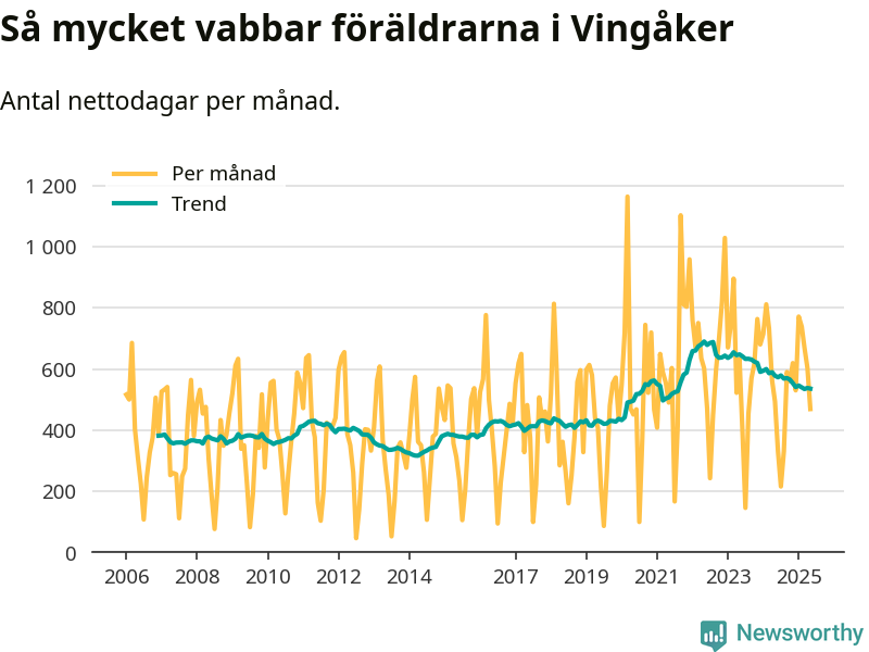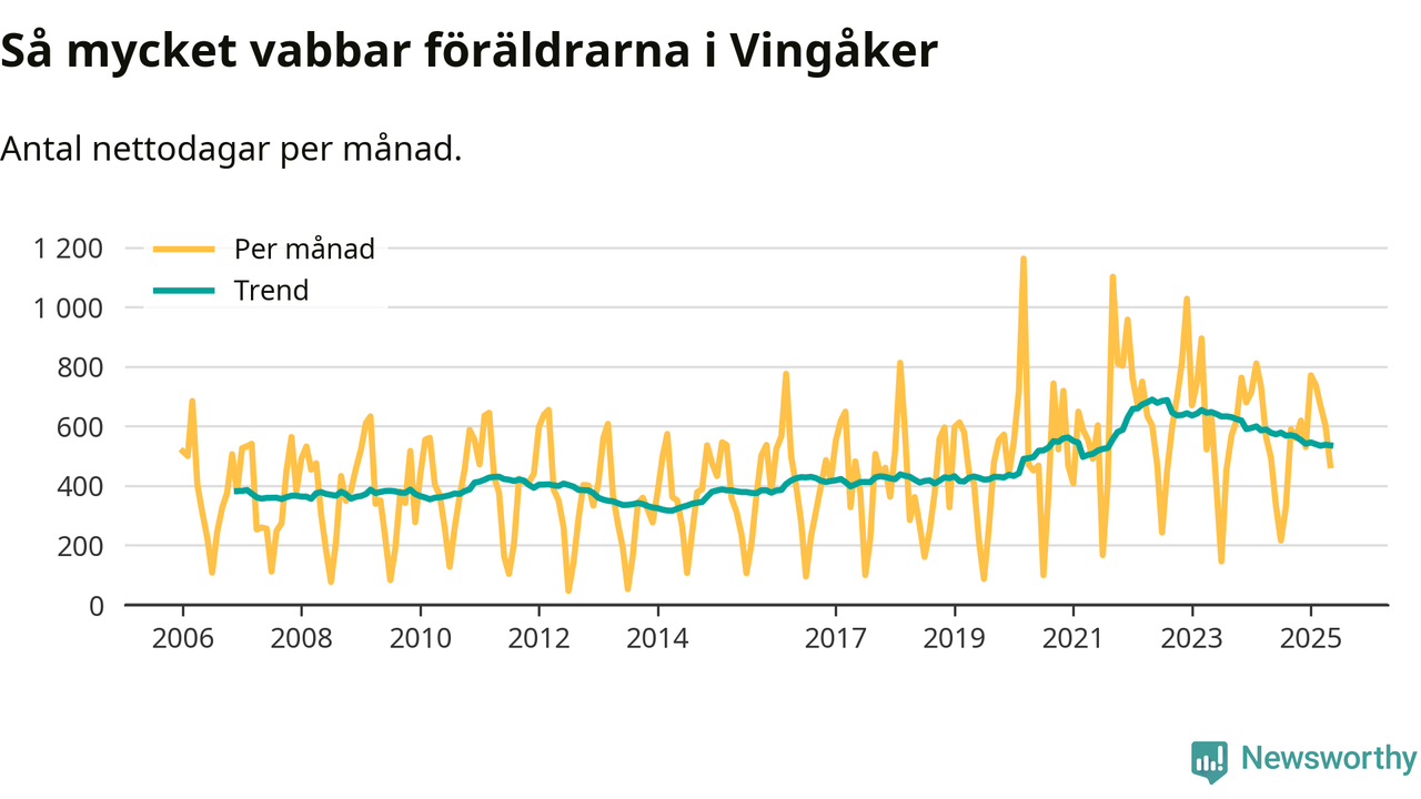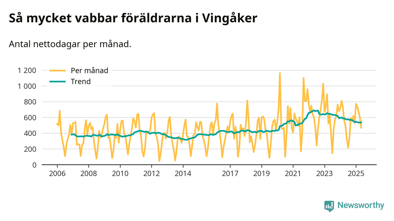 När coronapandemin drog in i mars 2020 peakade antalet vabbdagar både i Vingåkers kommun och i riket som helhet. Under de senaste två åren har vabbuttaget börjat minska igen.