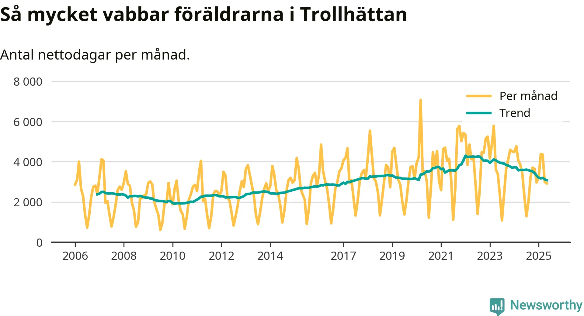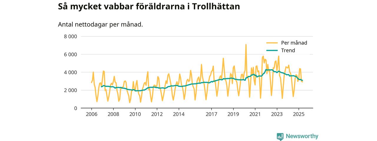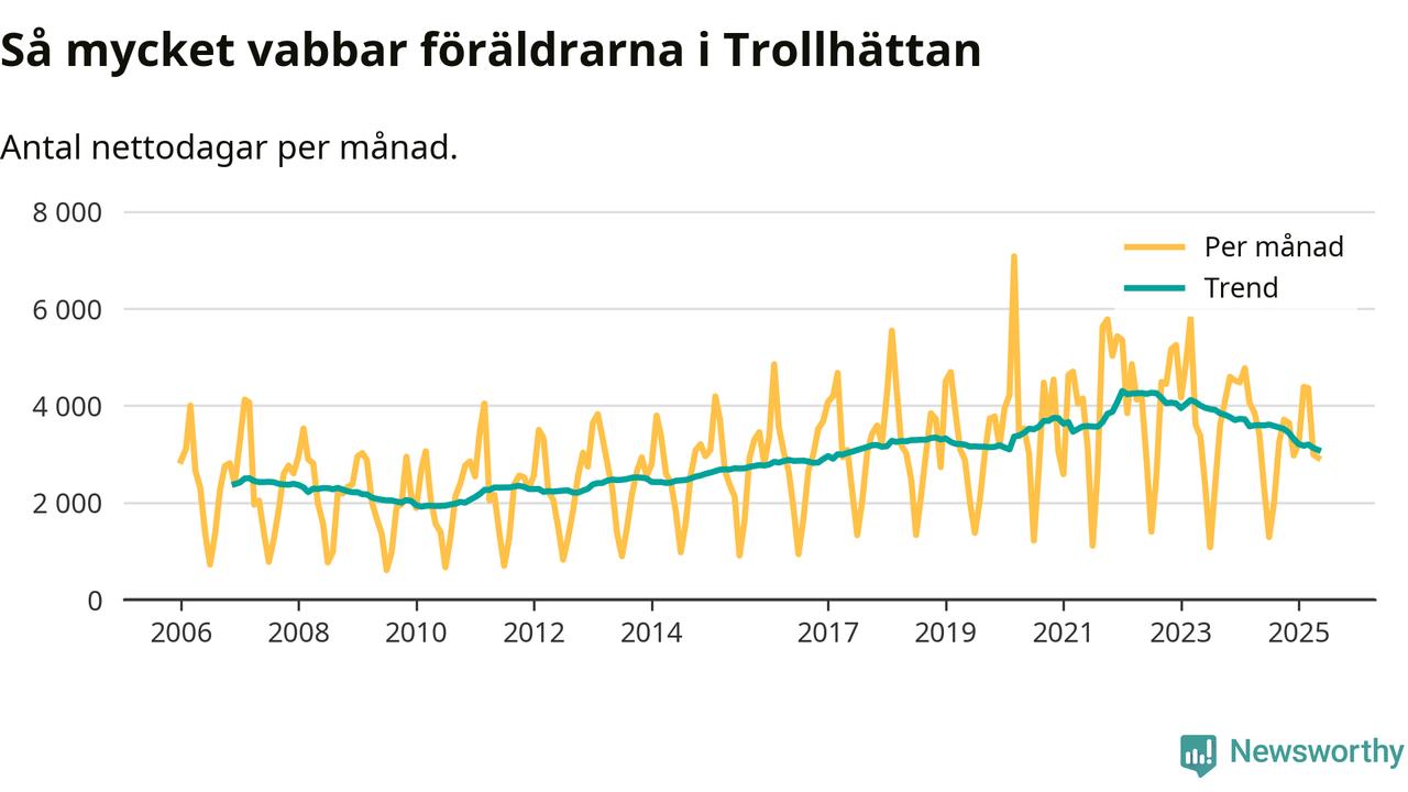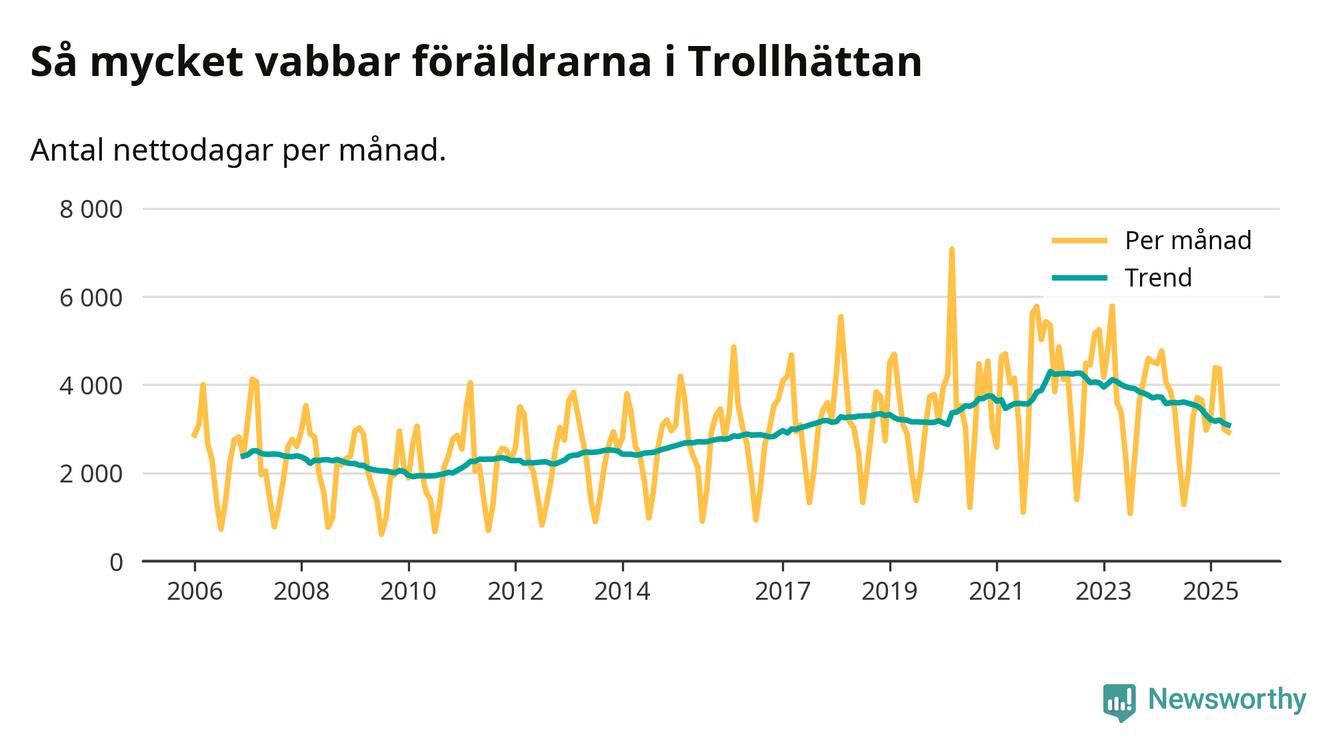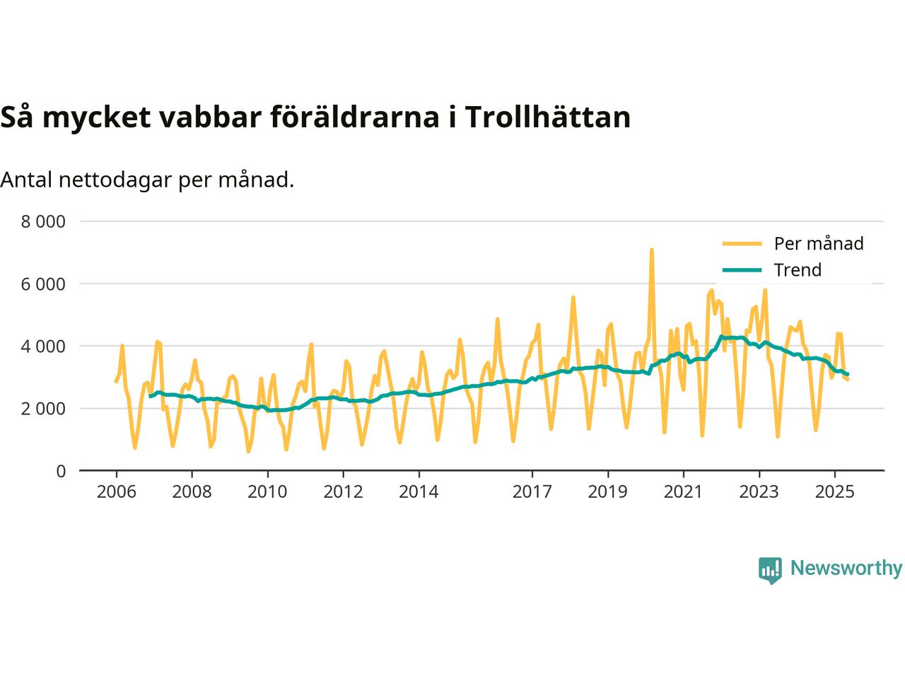 När coronapandemin drog in i mars 2020 peakade antalet vabbdagar både i Trollhättans kommun och i riket som helhet. Under de senaste två åren har vabbuttaget börjat minska igen.