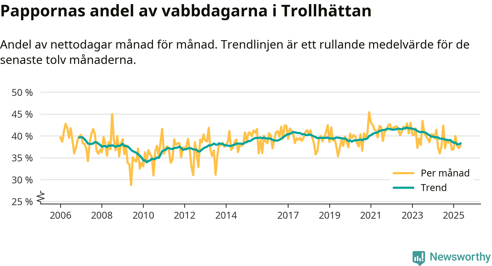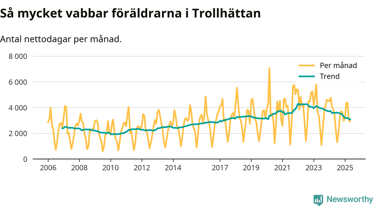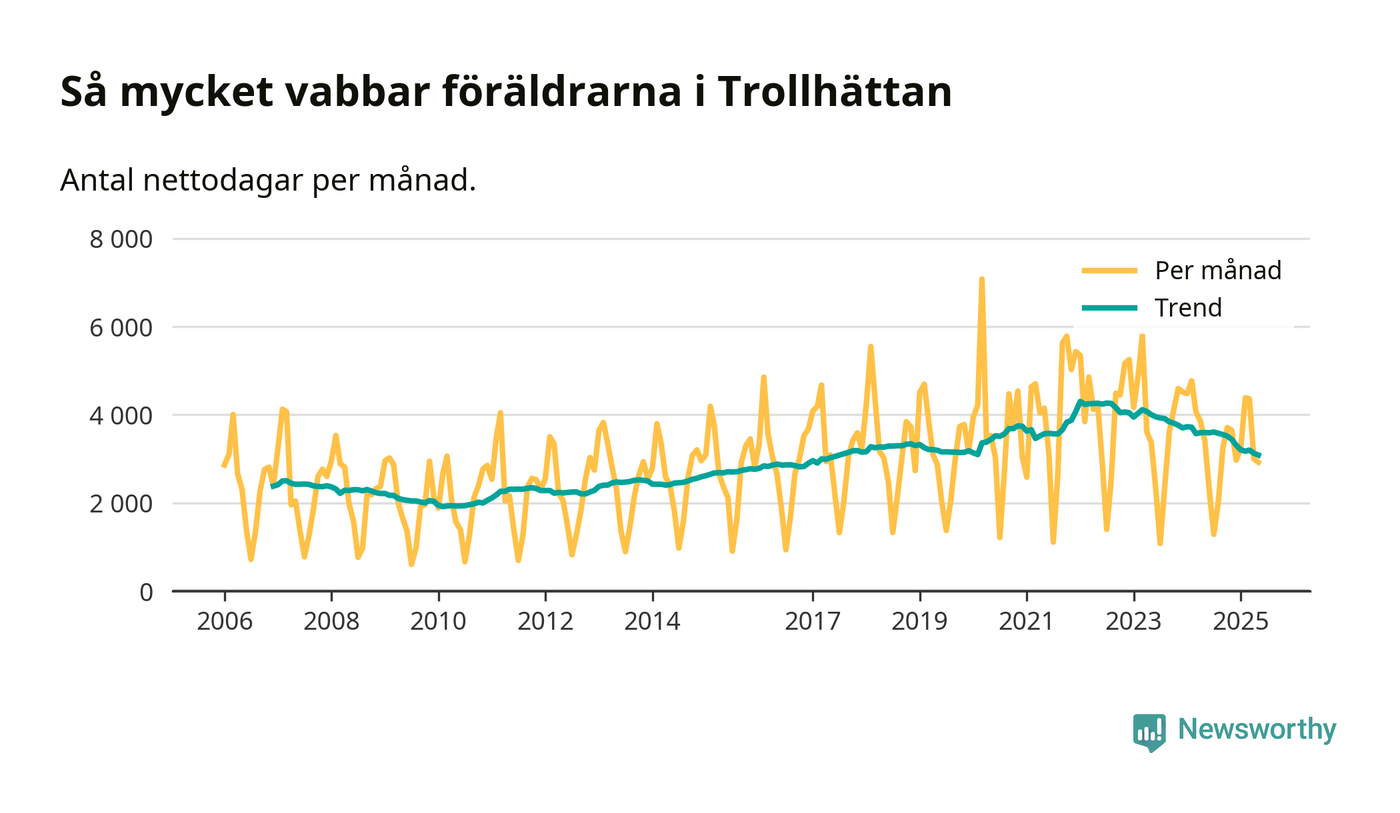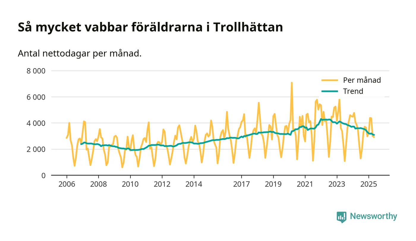 När coronapandemin drog in i mars 2020 peakade antalet vabbdagar både i Trollhättans kommun och i riket som helhet. Under de senaste två åren har vabbuttaget börjat minska igen.