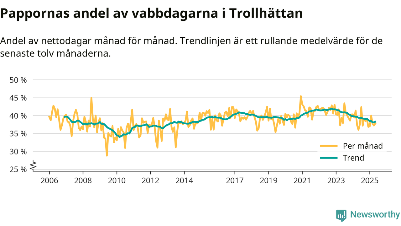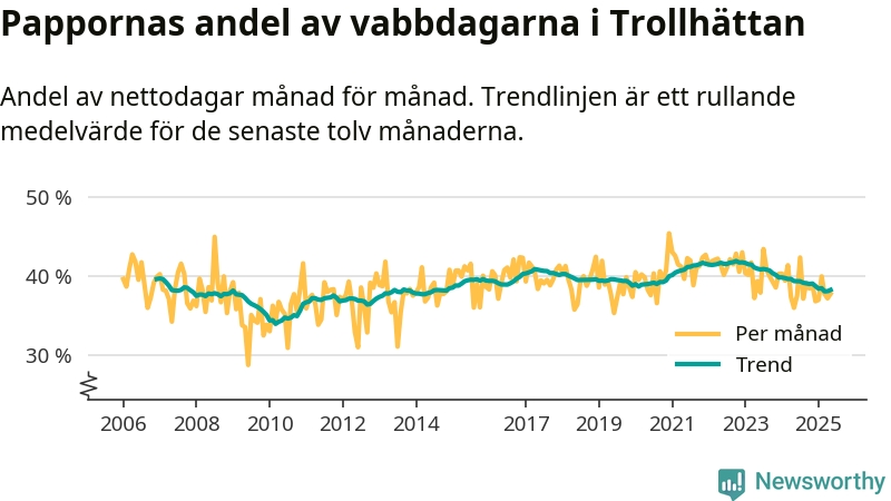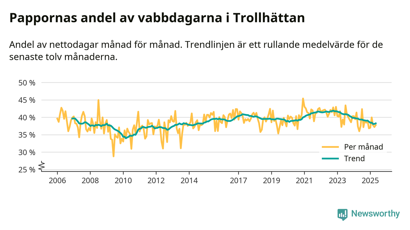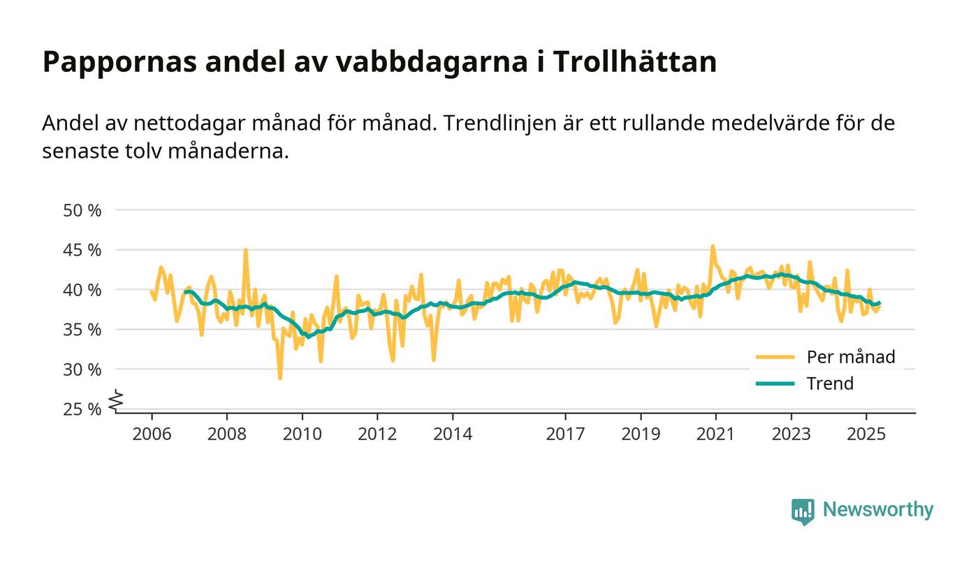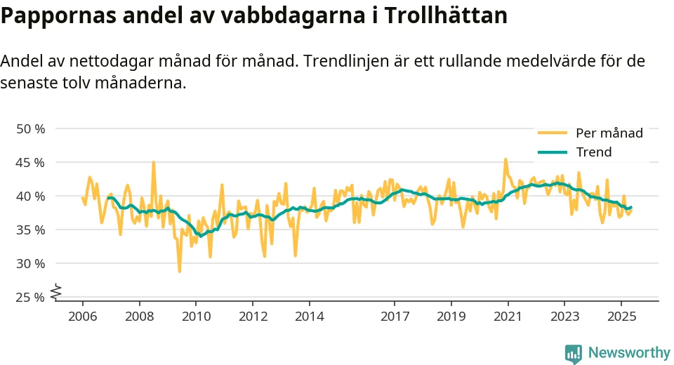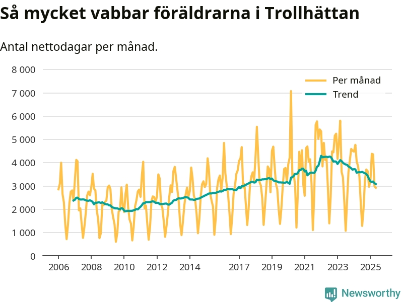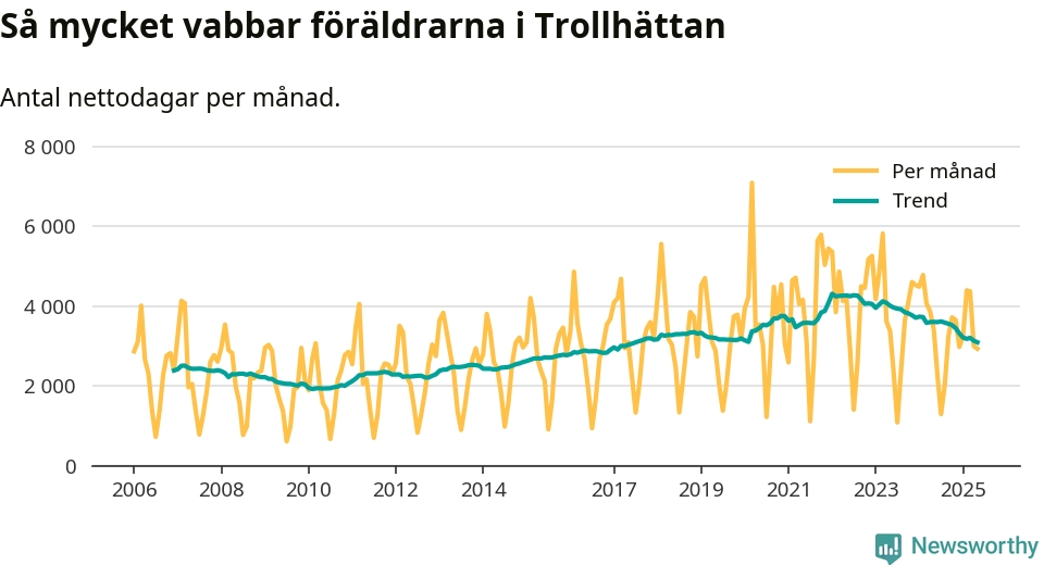 När coronapandemin drog in i mars 2020 peakade antalet vabbdagar både i Trollhättans kommun och i riket som helhet. Under de senaste två åren har vabbuttaget börjat minska igen.