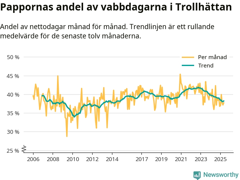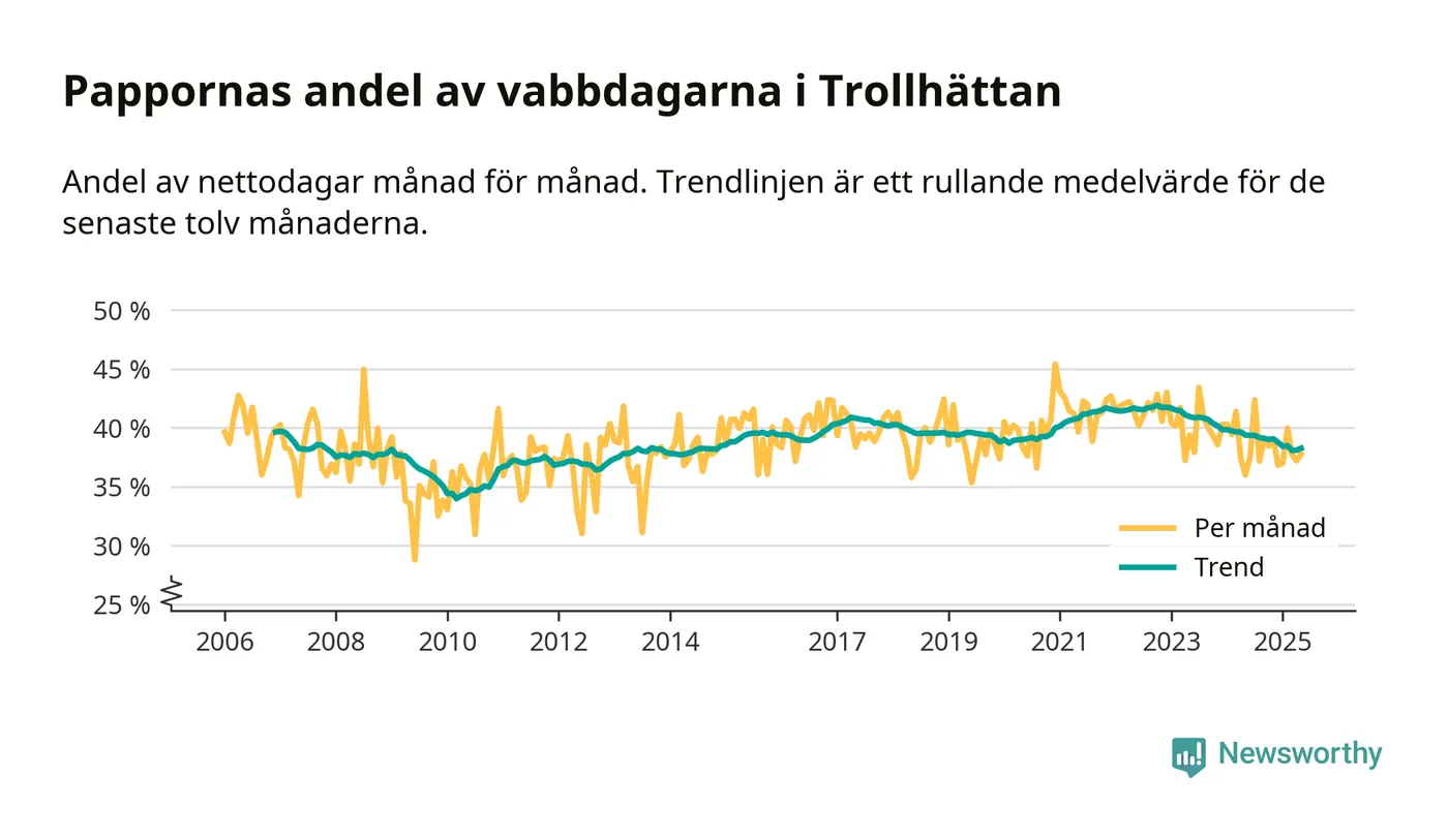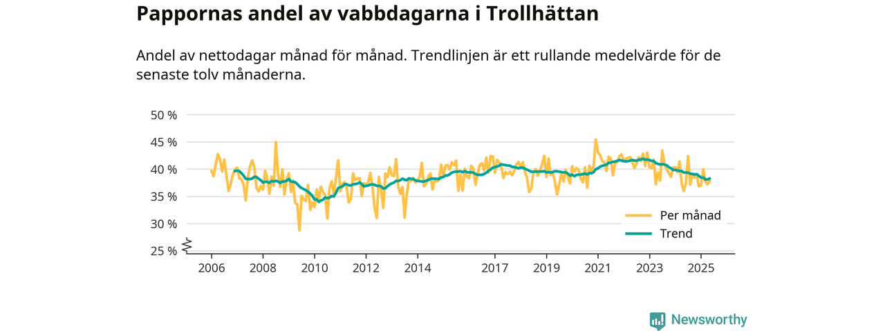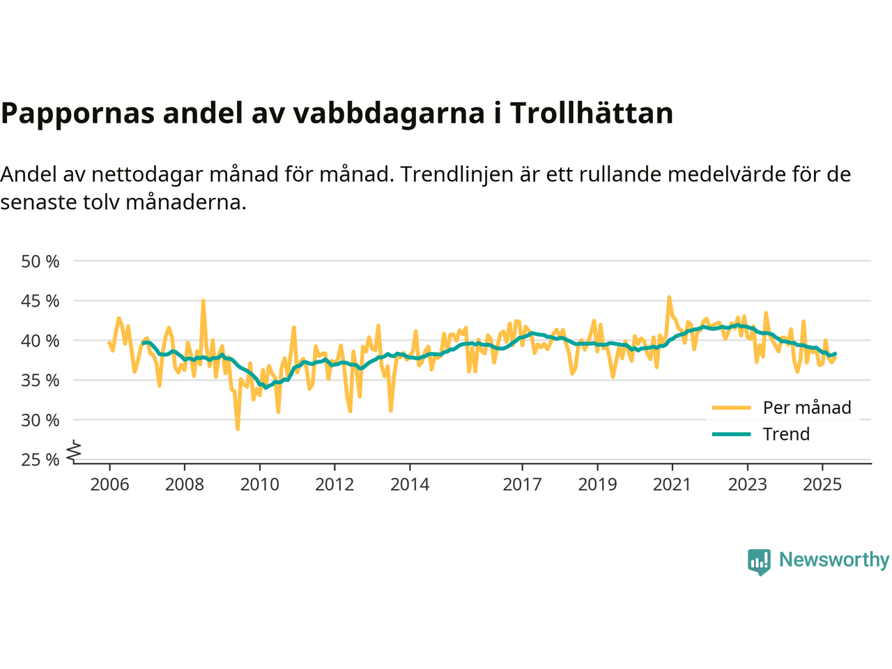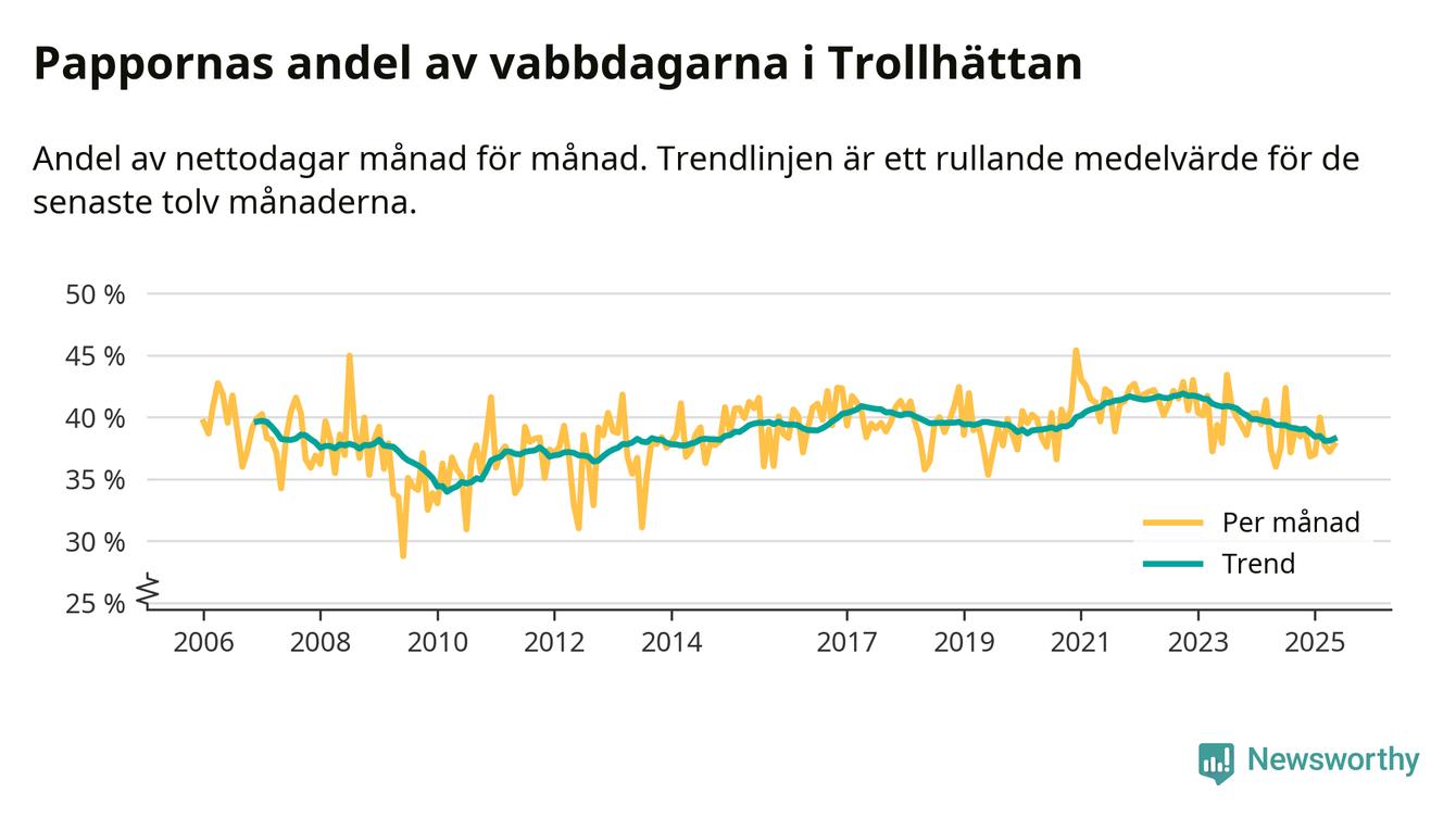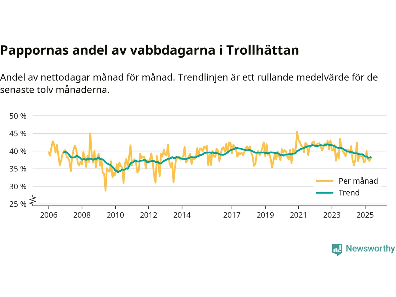 Trollhättan ligger en bit från ett jämställt uttag. Under de senaste tolv månaderna har männen stått för 38 procent av all vabb i kommunen. I år har andelen varit lägre än på över tio år.