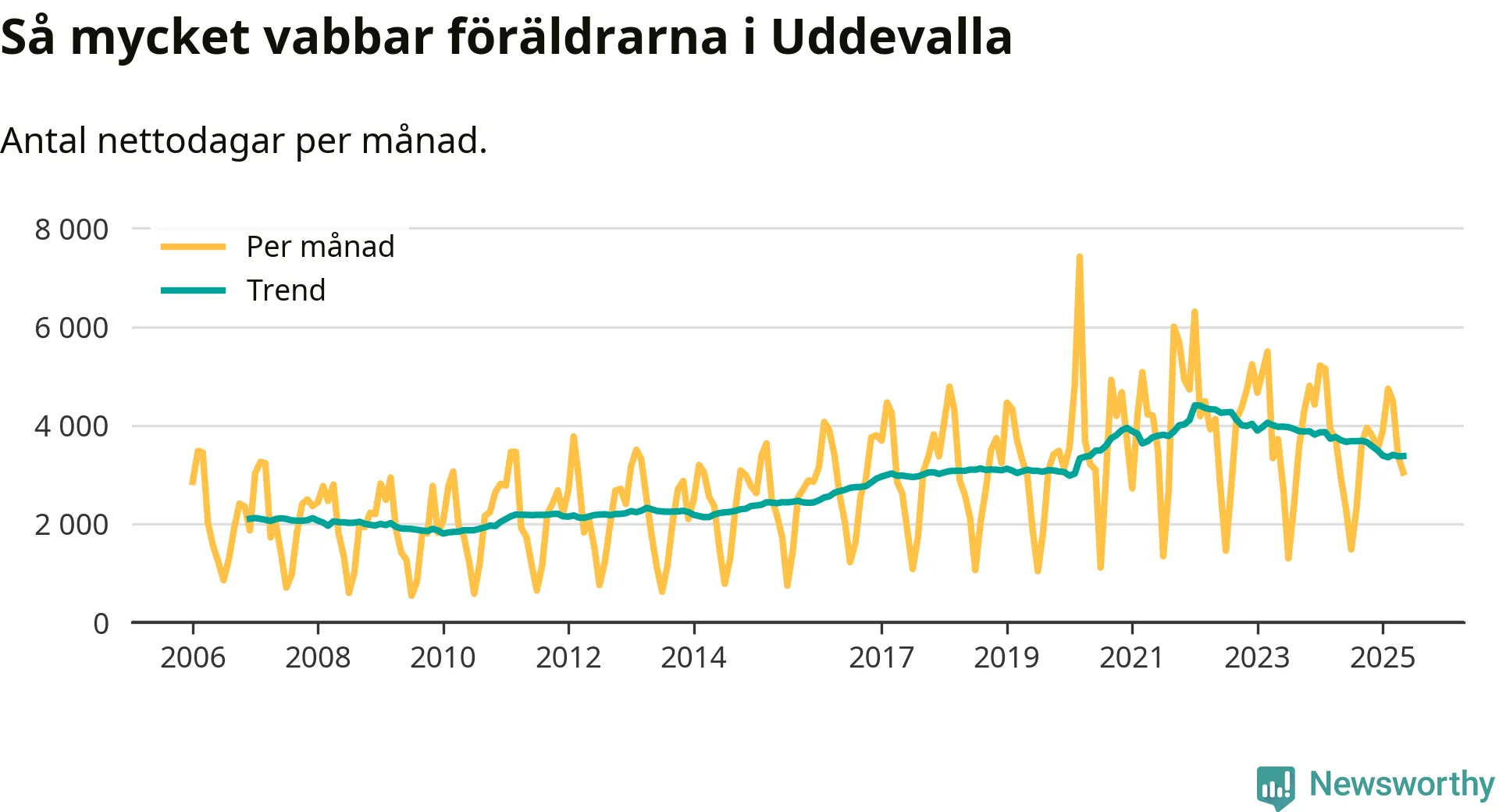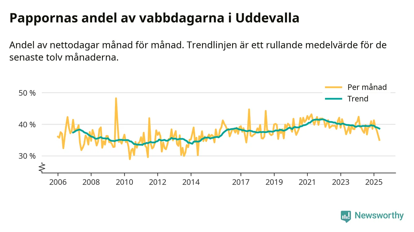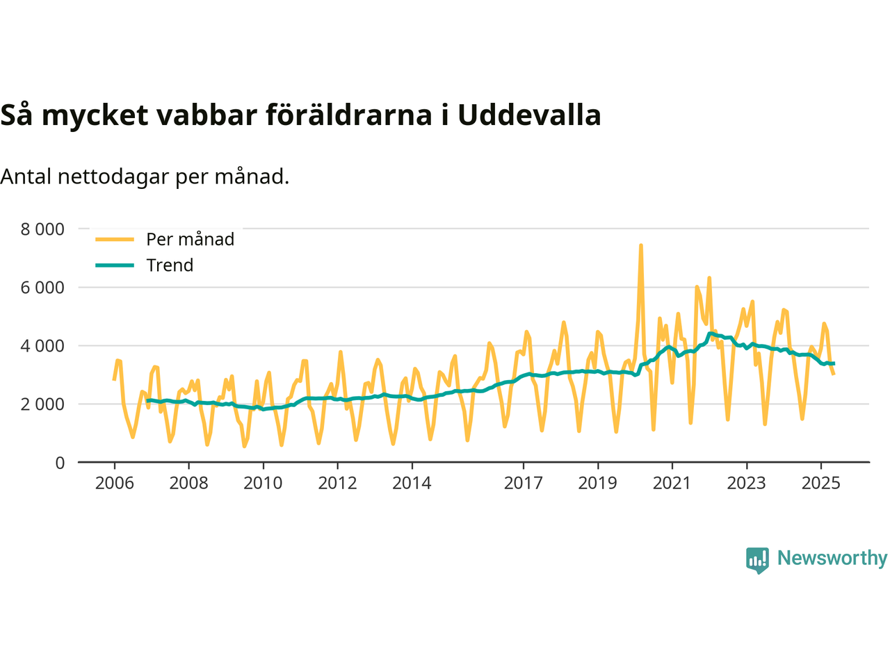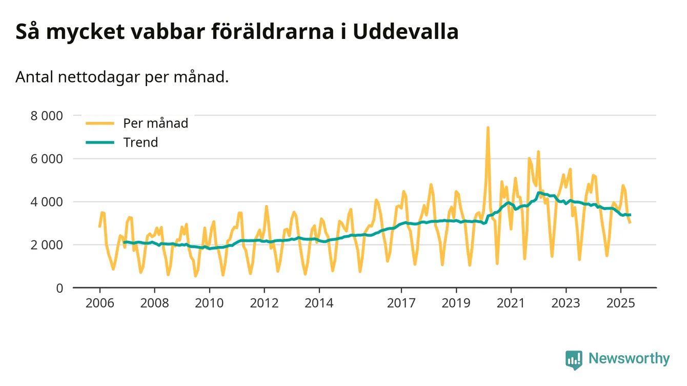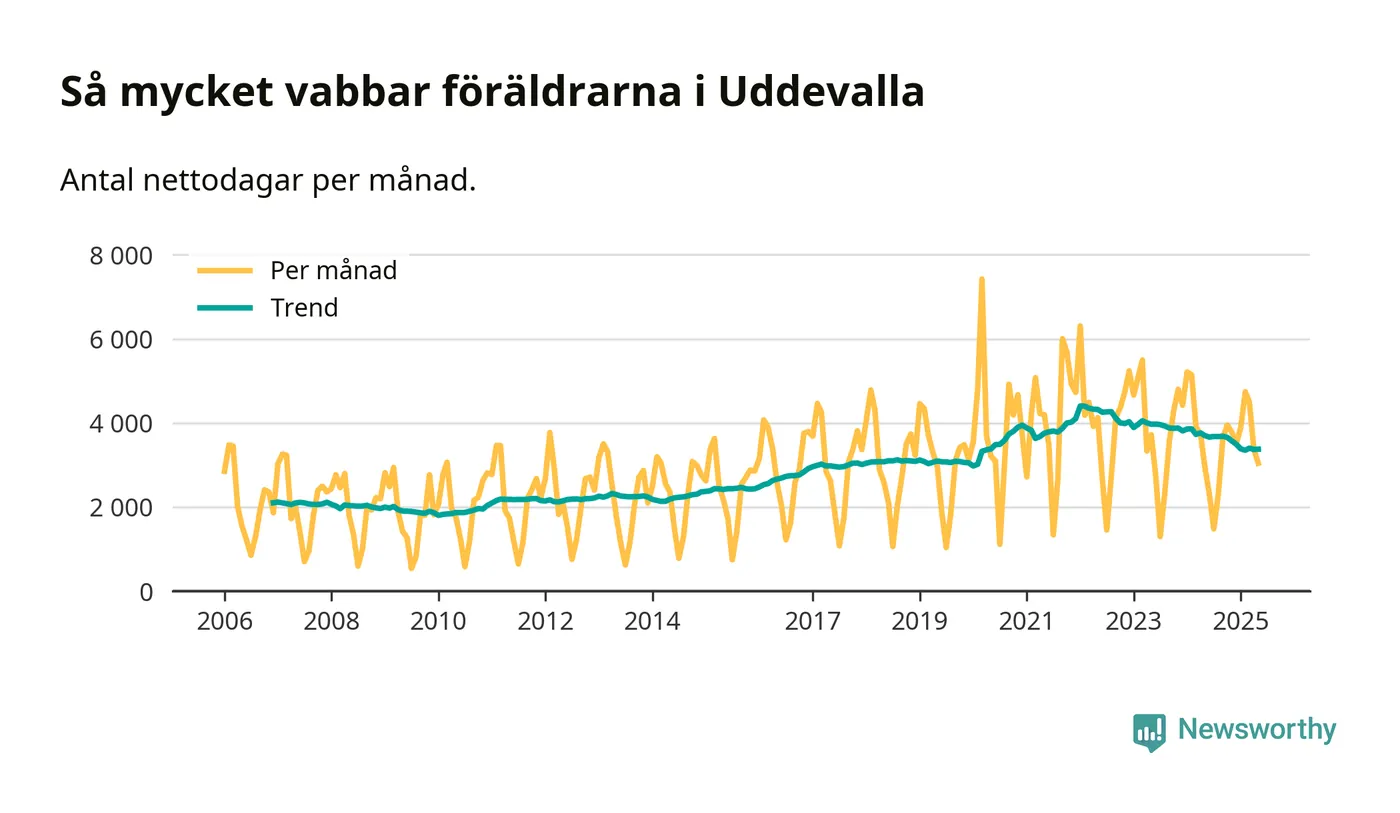 När coronapandemin drog in i mars 2020 peakade antalet vabbdagar både i Uddevalla kommun och i riket som helhet. Under de senaste två åren har vabbuttaget börjat minska igen.