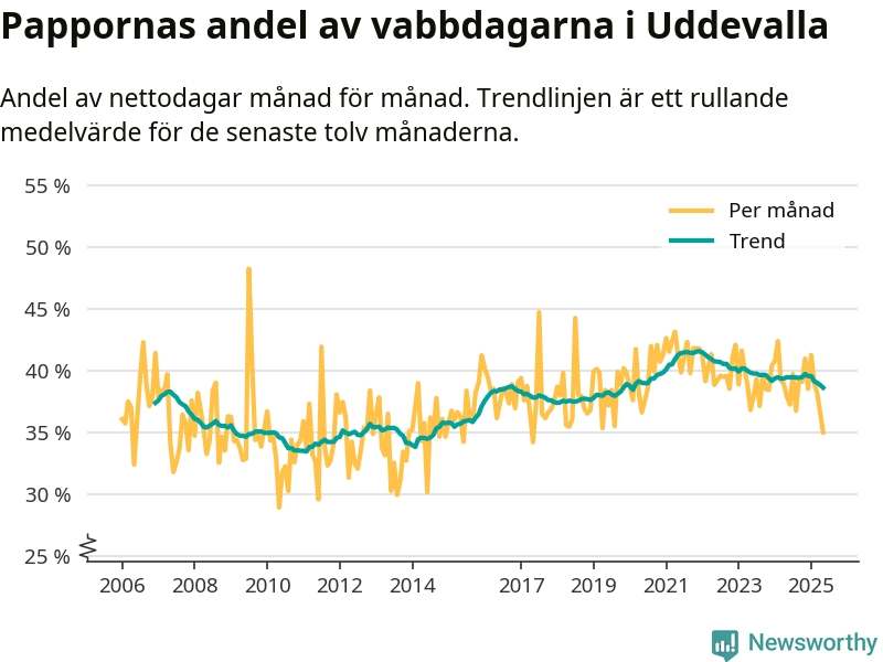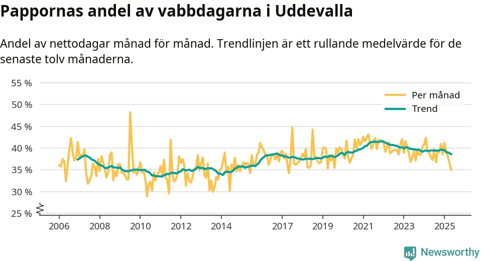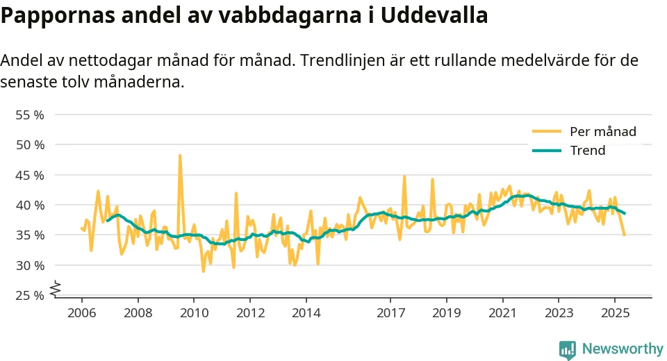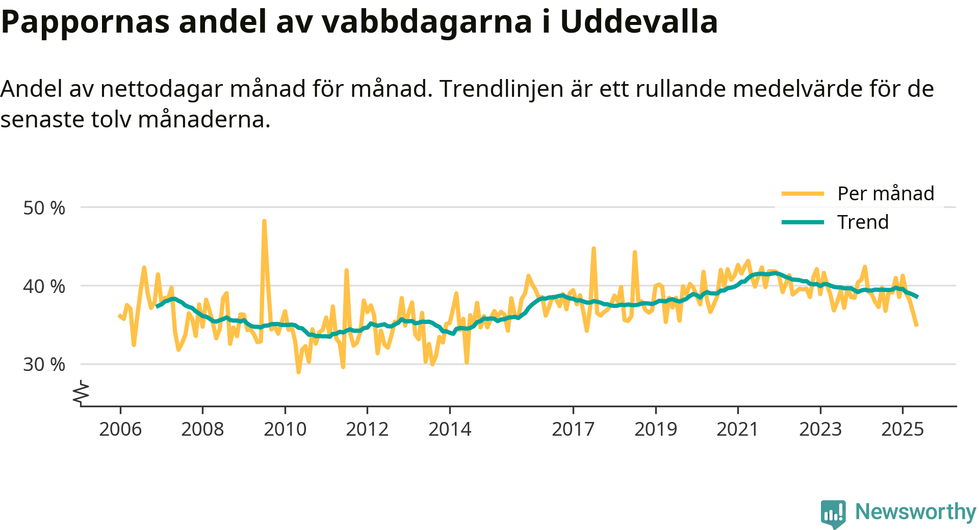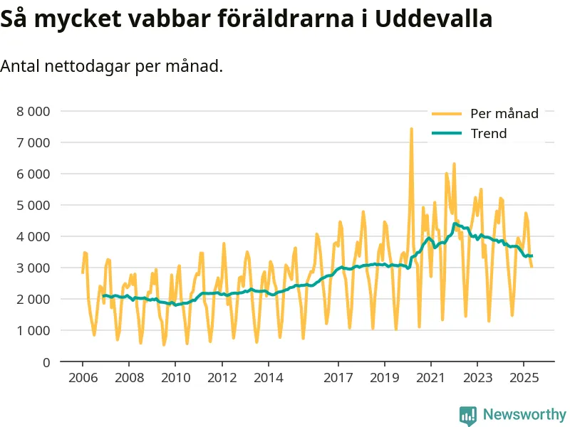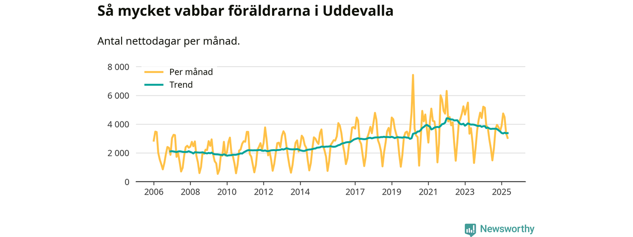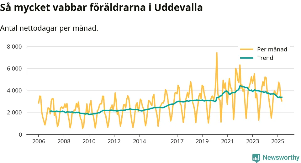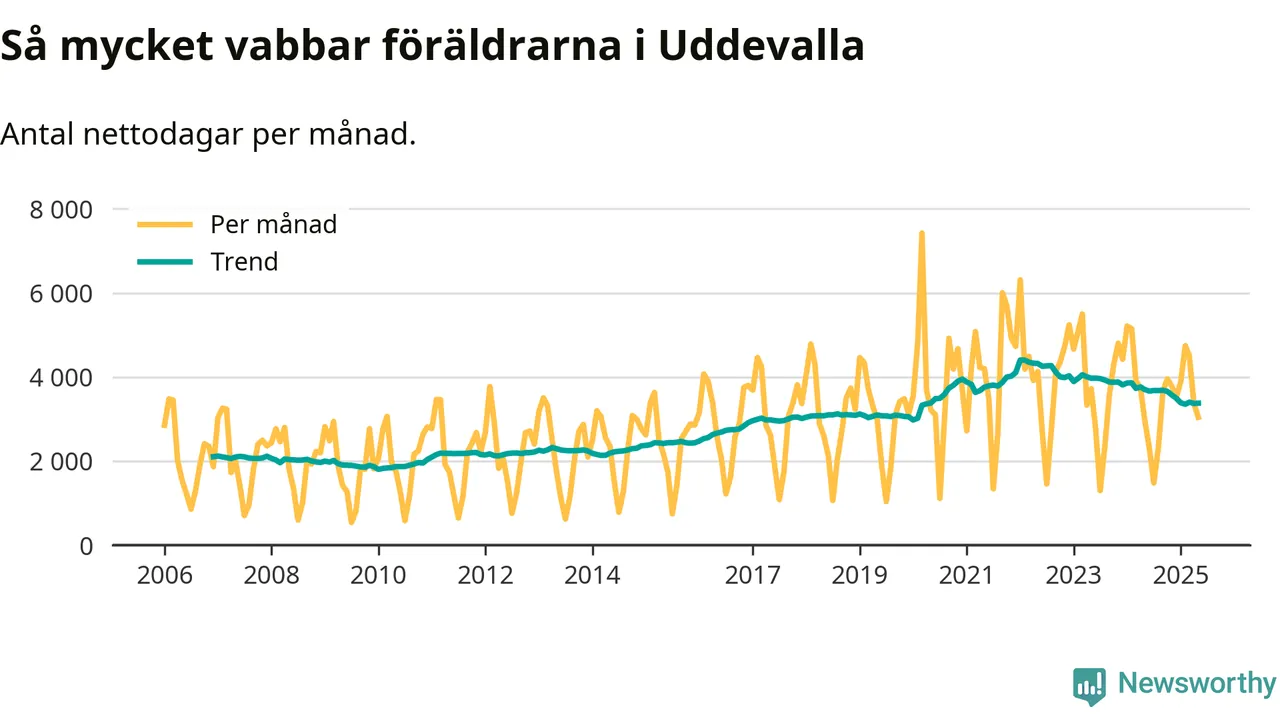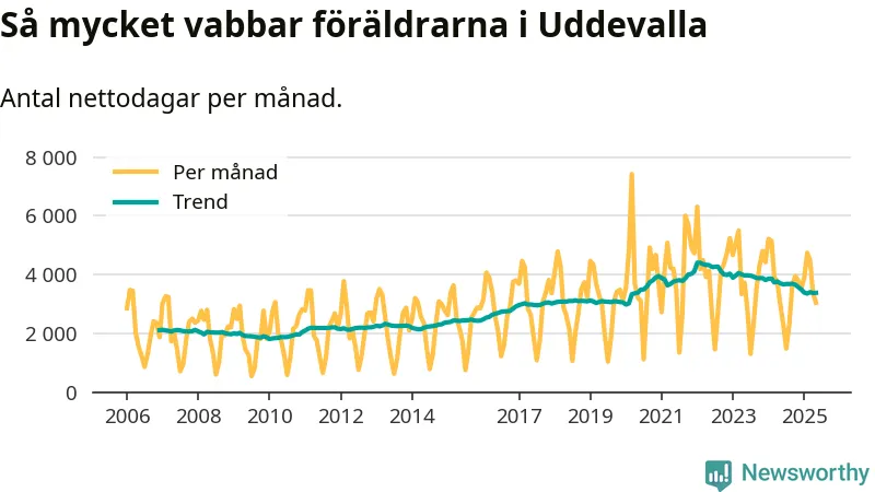 När coronapandemin drog in i mars 2020 peakade antalet vabbdagar både i Uddevalla kommun och i riket som helhet. Under de senaste två åren har vabbuttaget börjat minska igen.