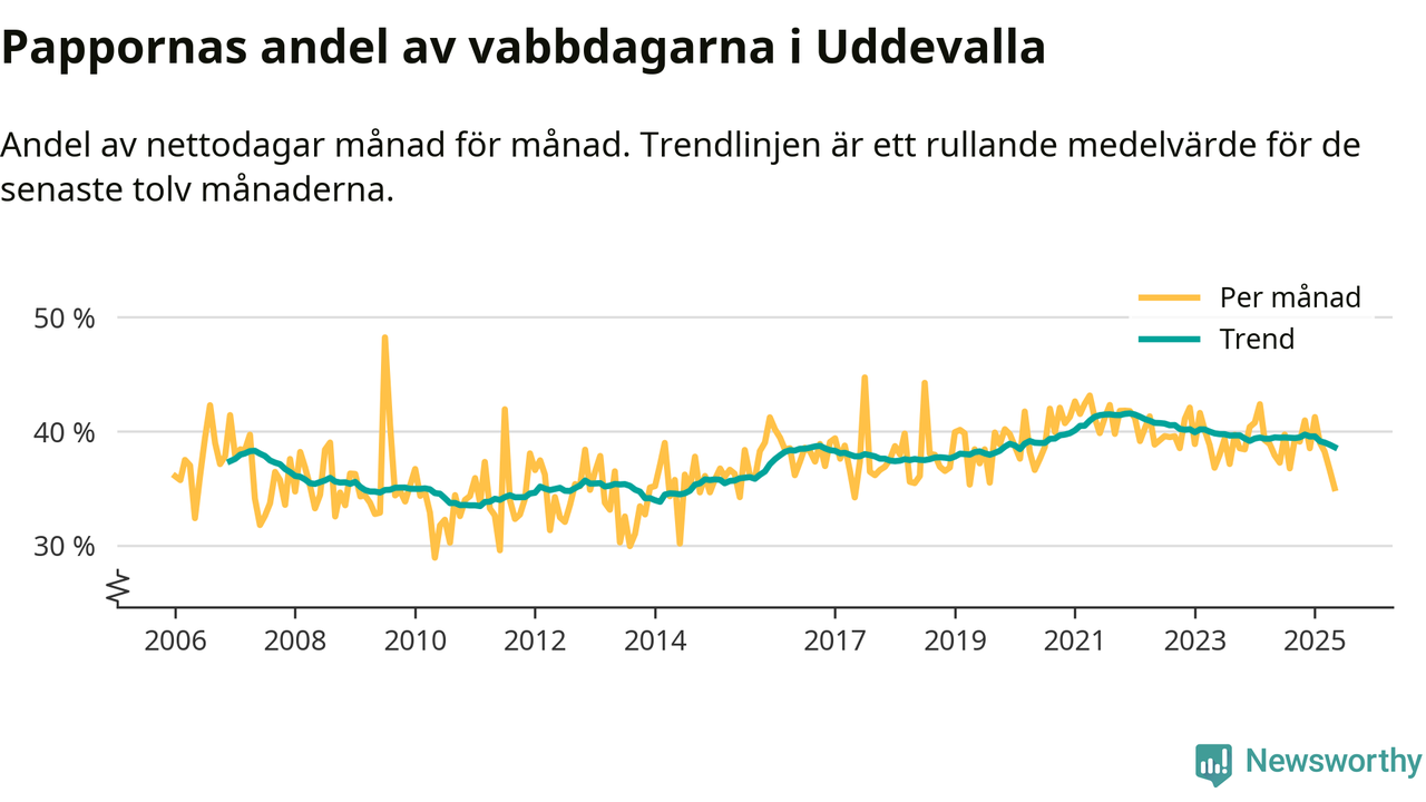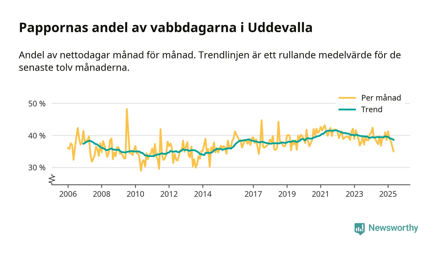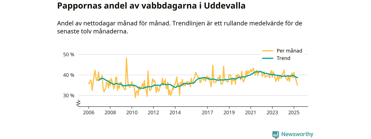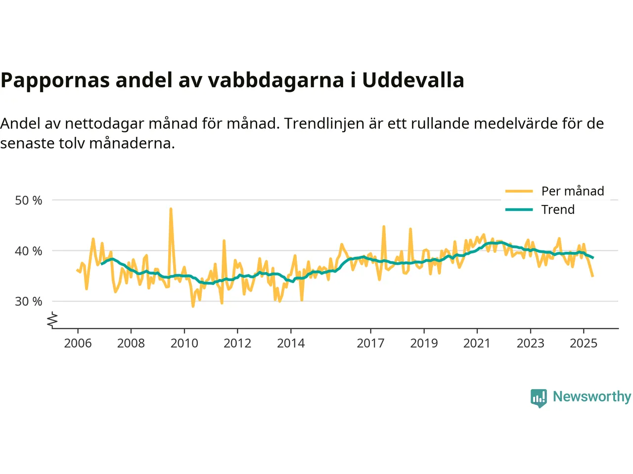 Uddevalla ligger en bit från ett jämställt uttag. Under de senaste tolv månaderna har männen stått för 39 procent av all vabb i kommunen. Det är en lägre andel än på över fem år.