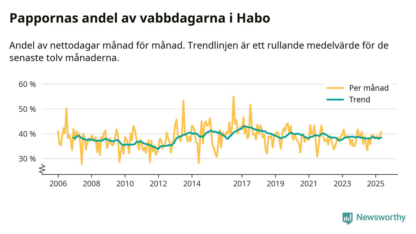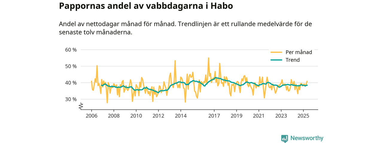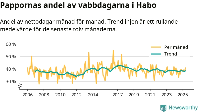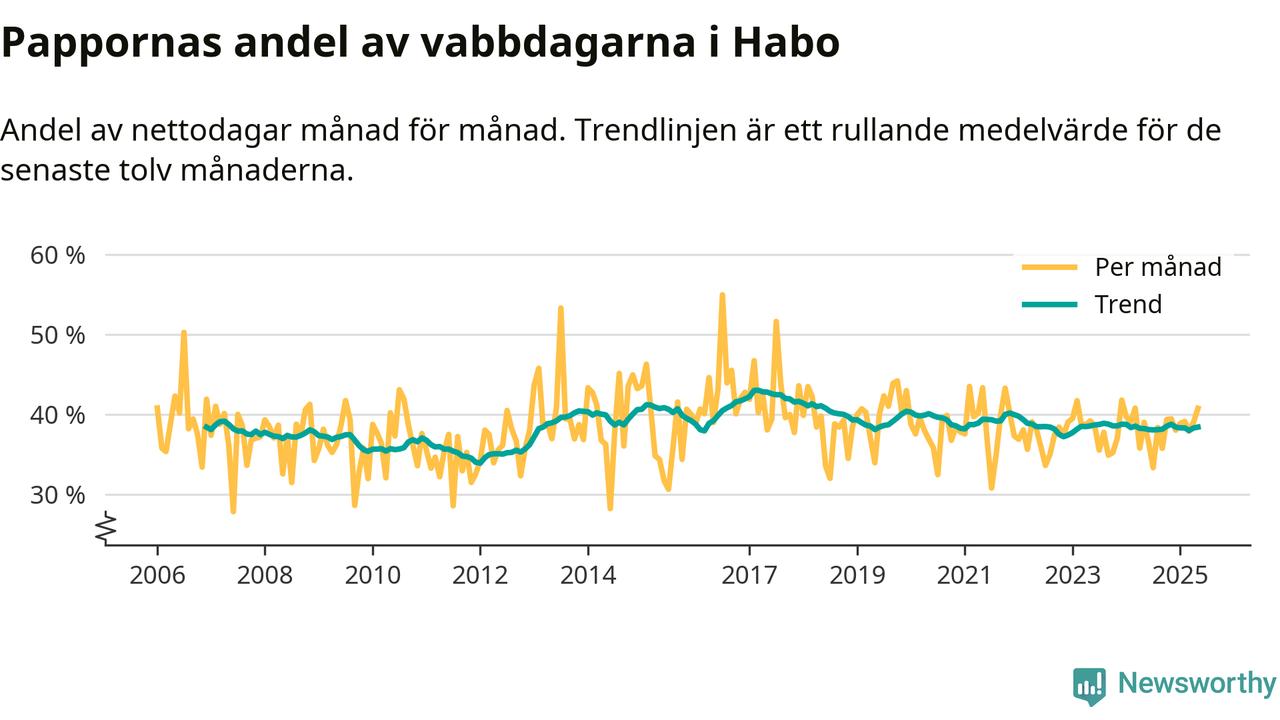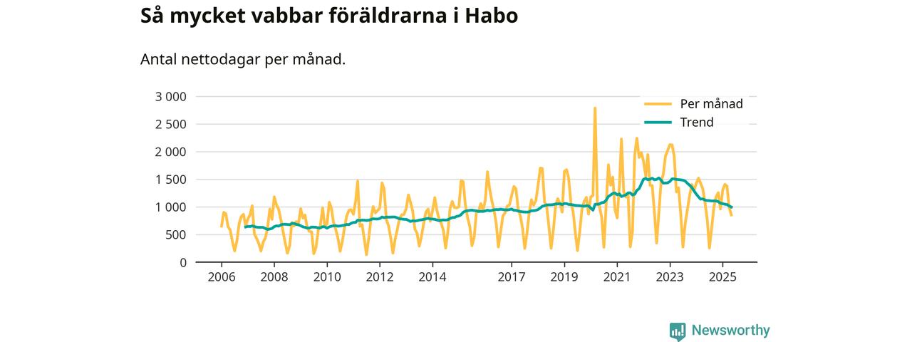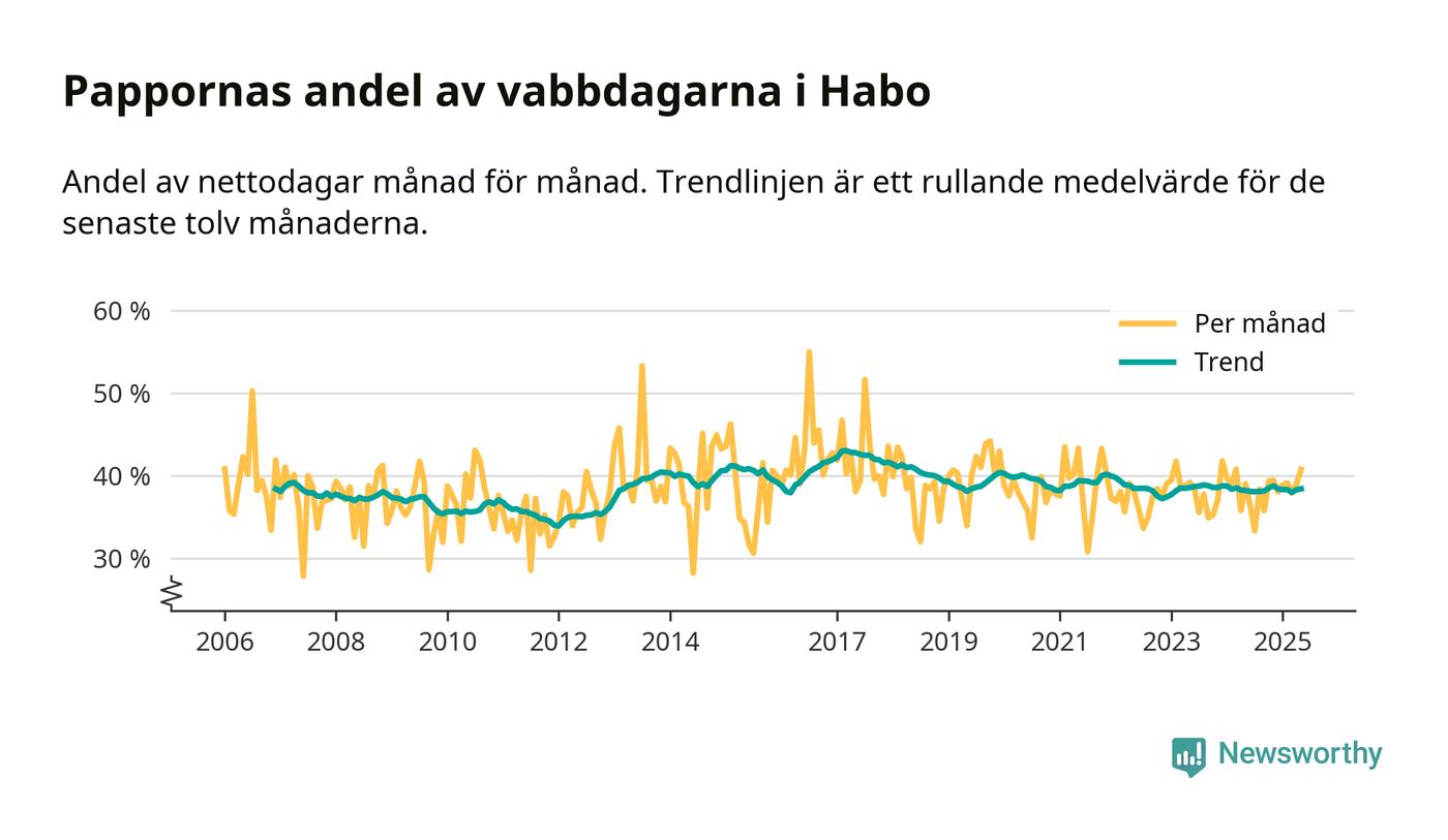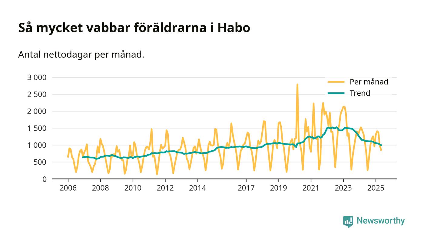 Habo ligger en bit från ett jämställt uttag. Under de senaste tolv månaderna har männen stått för 38 procent av all vabb i kommunen. Pappornas uttag peakade våren 2017 då kommunens fäder var uppe i 43 procent av vabbdagarna 1.