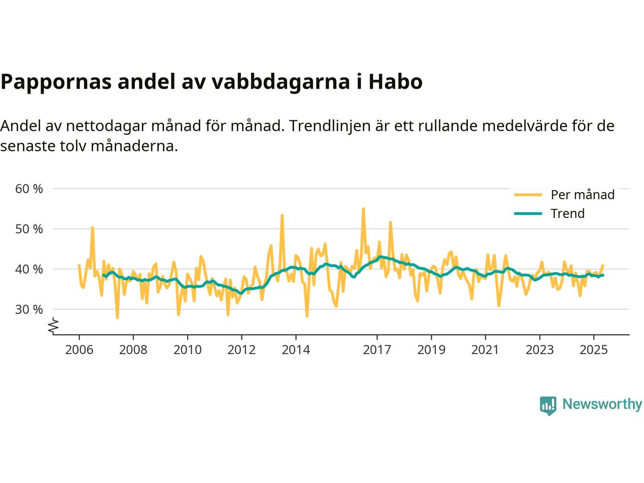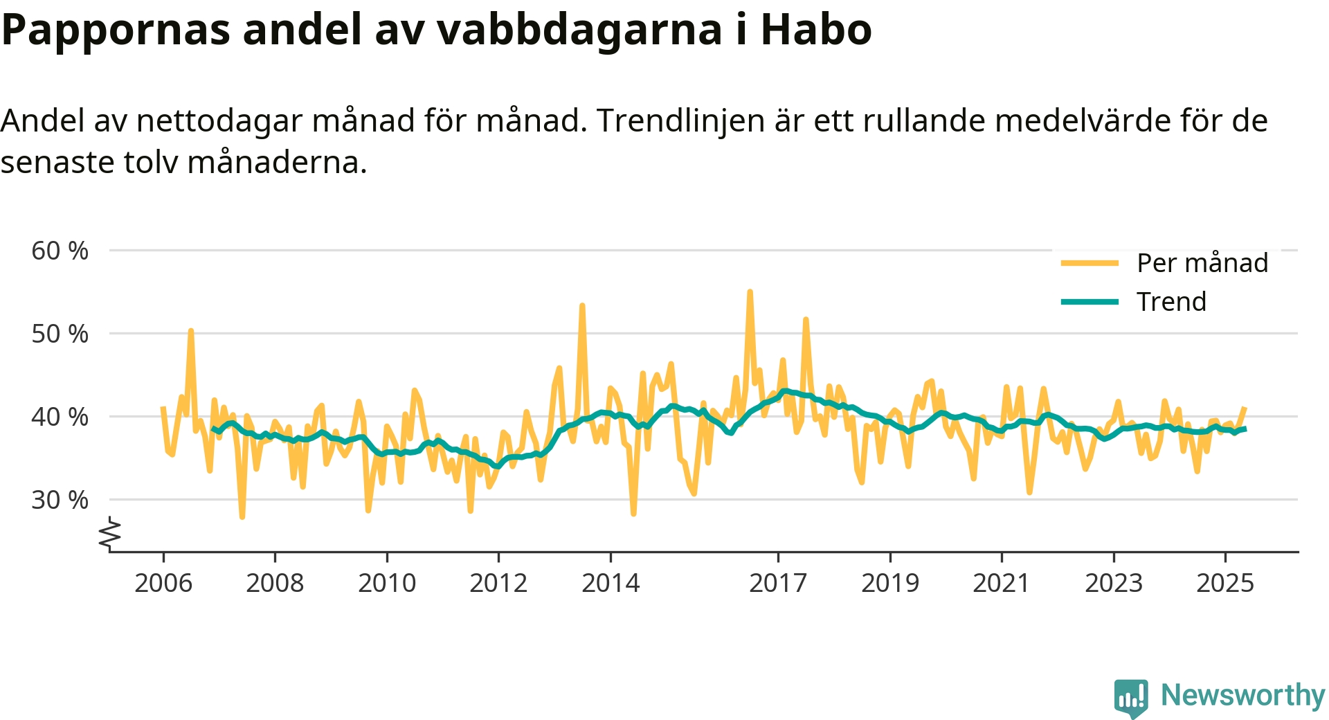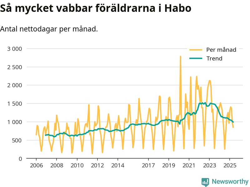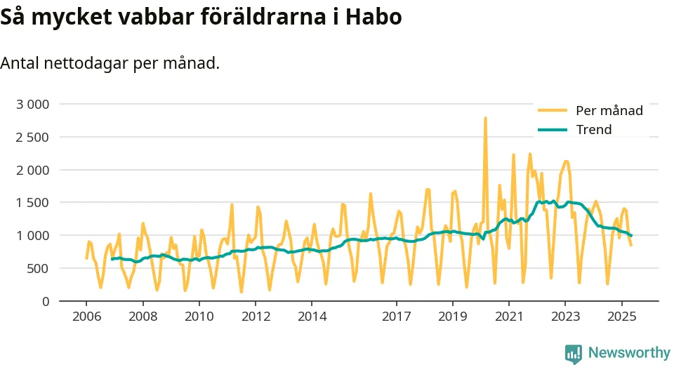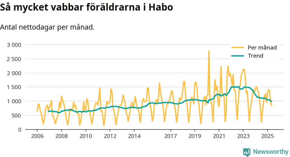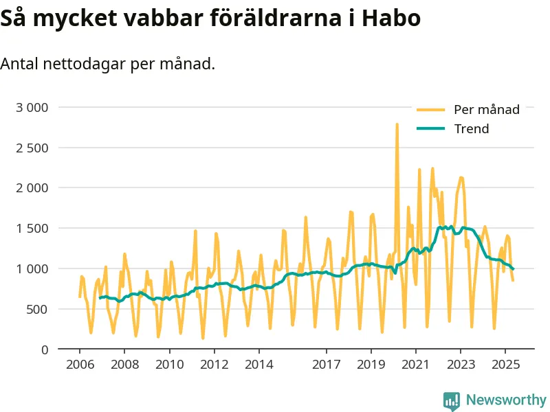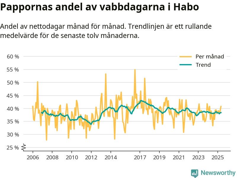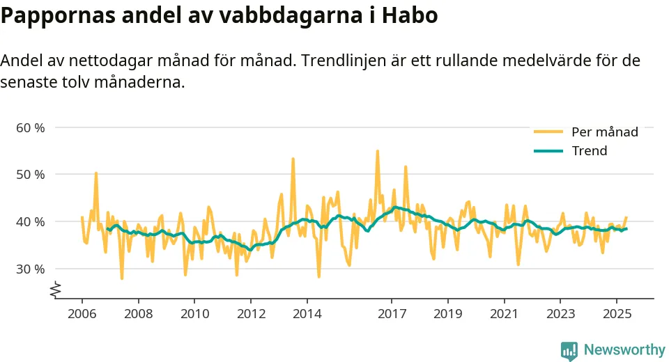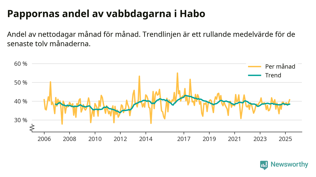 Habo ligger en bit från ett jämställt uttag. Under de senaste tolv månaderna har männen stått för 38 procent av all vabb i kommunen. Pappornas uttag peakade våren 2017 då kommunens fäder var uppe i 43 procent av vabbdagarna 1.