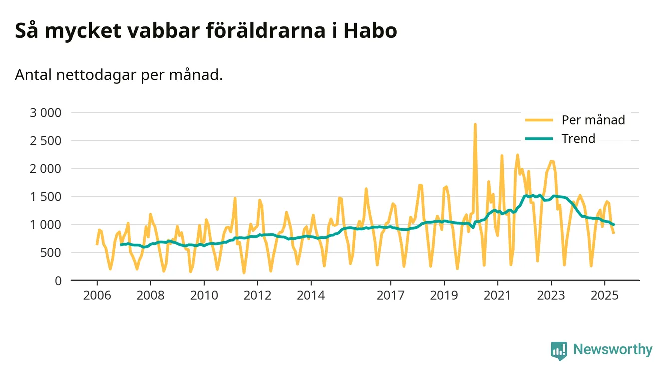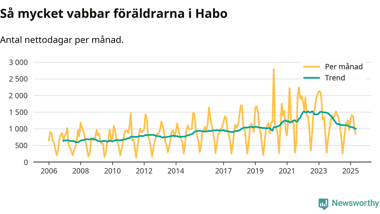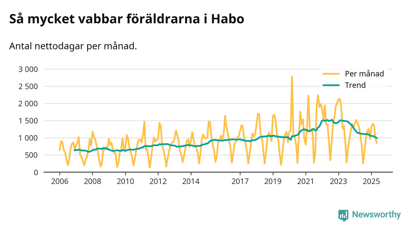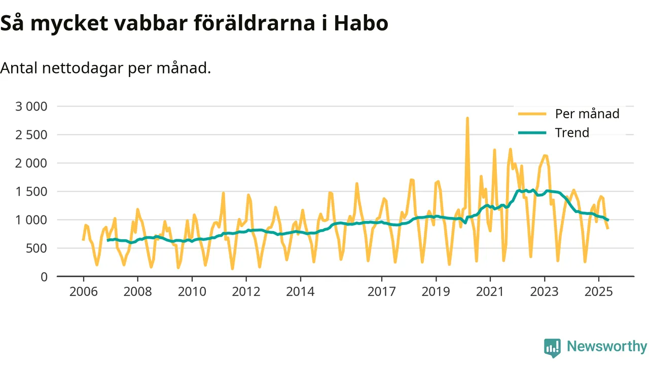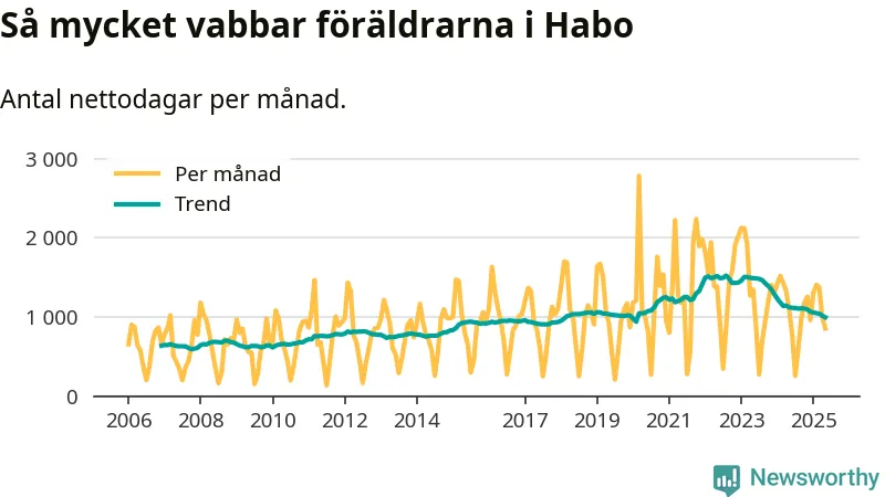 När coronapandemin drog in i mars 2020 peakade antalet vabbdagar både i Habo kommun och i riket som helhet. Under de senaste två åren har vabbuttaget börjat minska igen.
