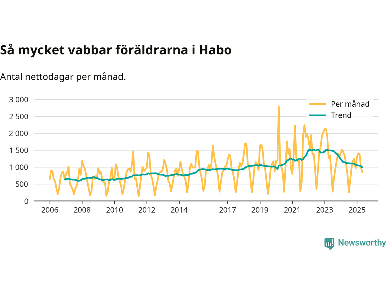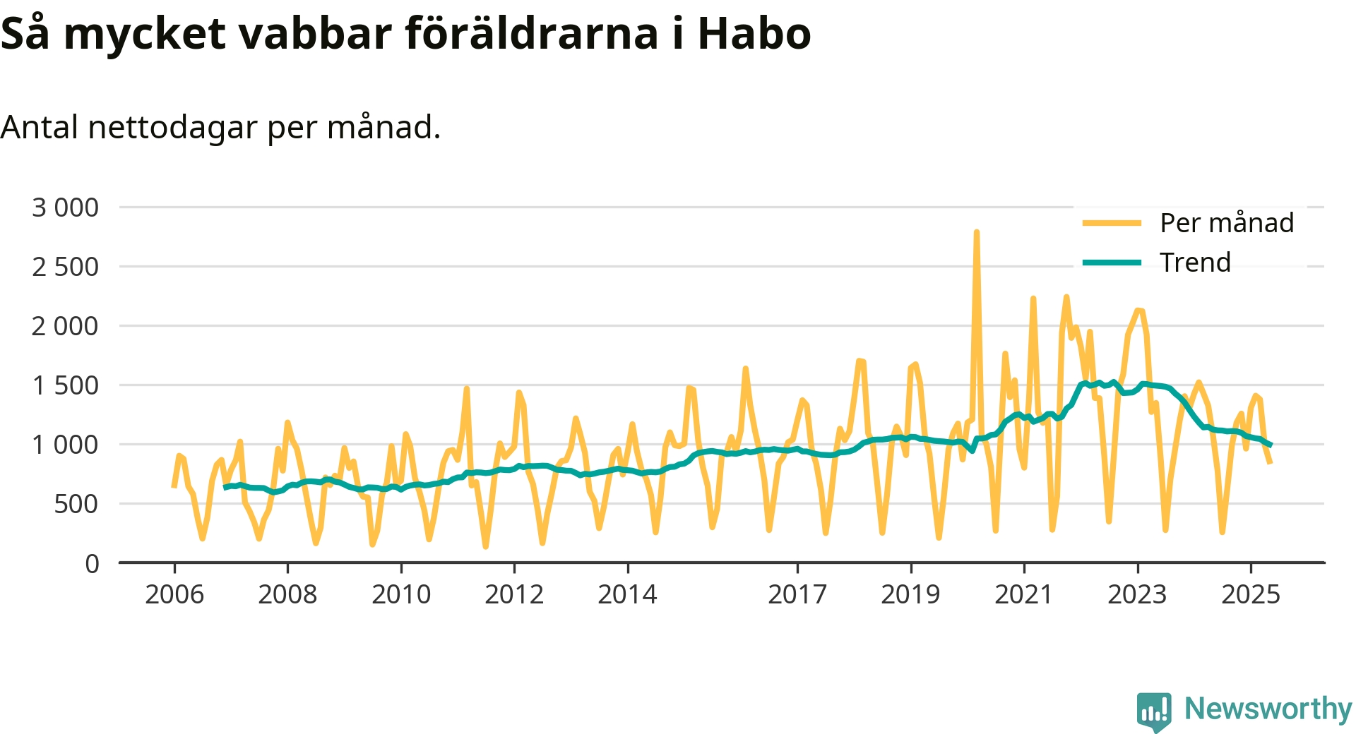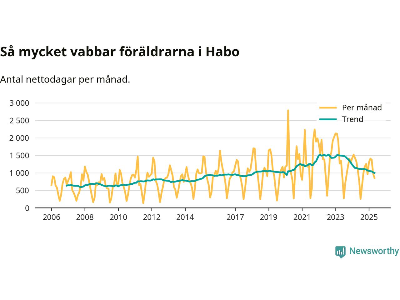 När coronapandemin drog in i mars 2020 peakade antalet vabbdagar både i Habo kommun och i riket som helhet. Under de senaste två åren har vabbuttaget börjat minska igen.