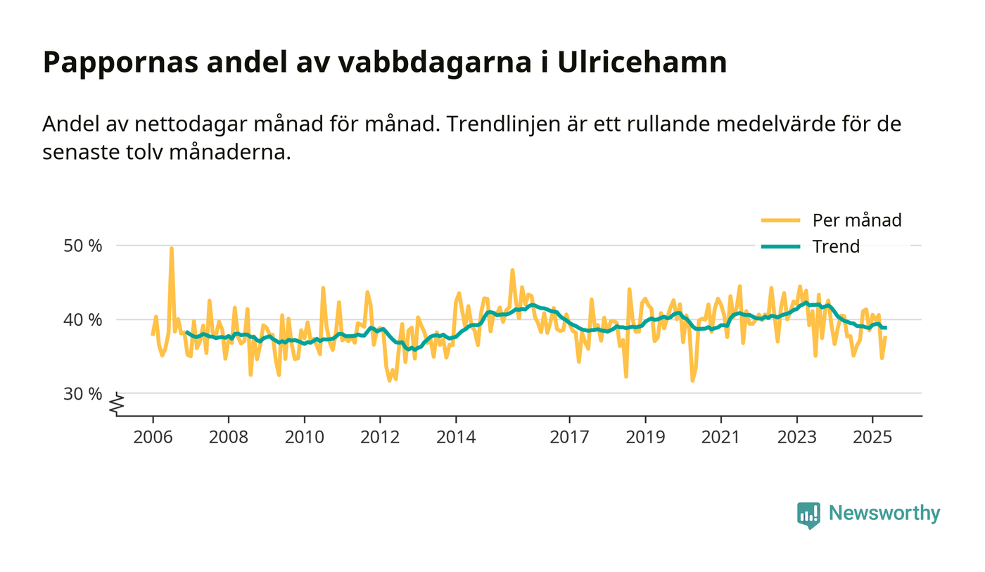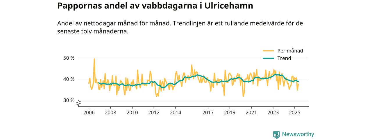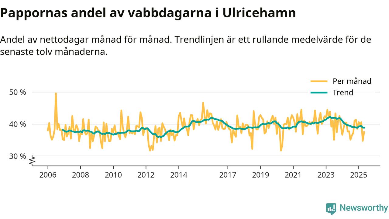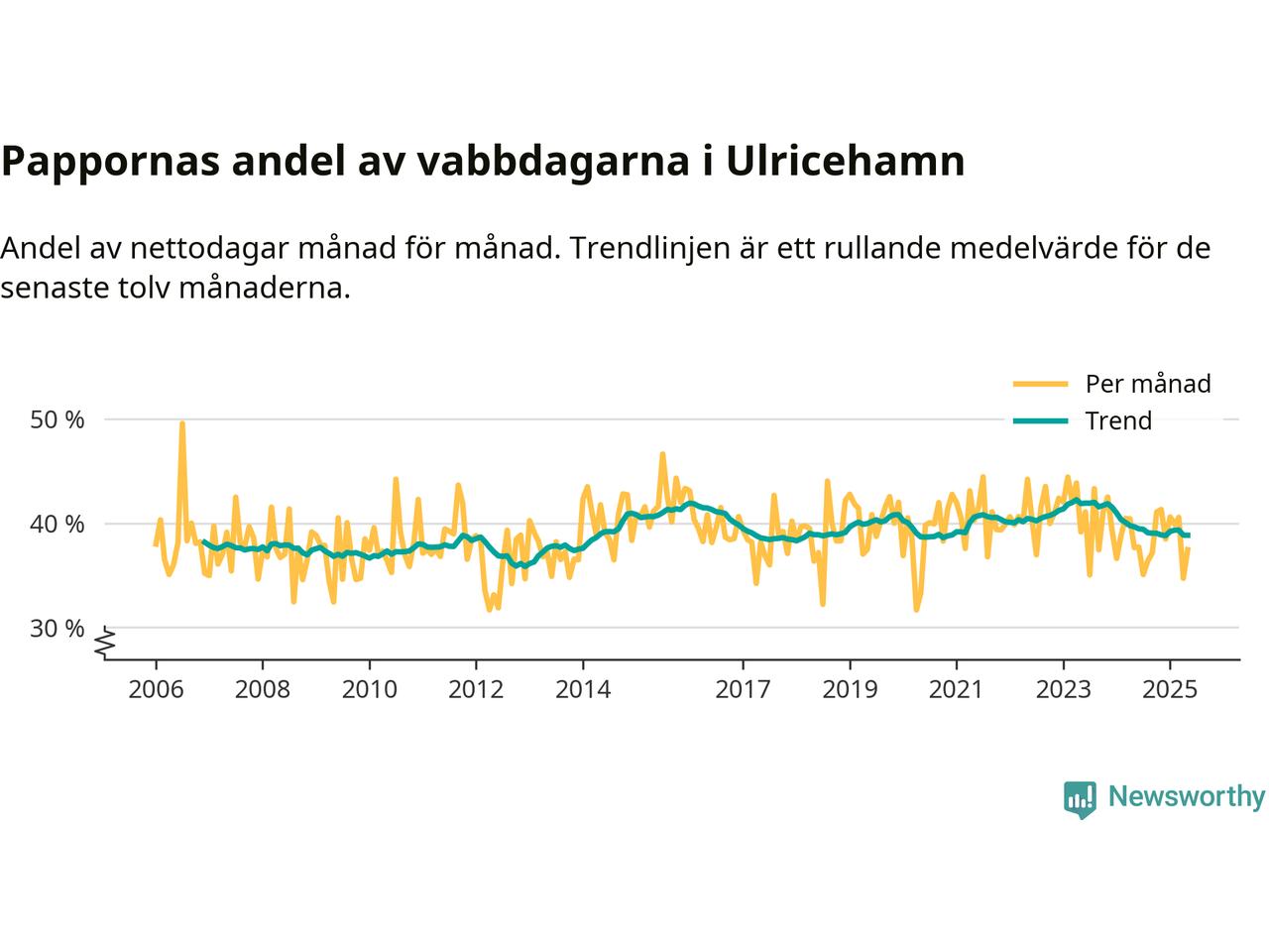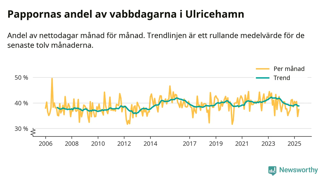 Ulricehamn ligger en bit från ett jämställt uttag. Under de senaste tolv månaderna har männen stått för 39 procent av all vabb i kommunen. I år har andelen varit lägre än på över fyra år.