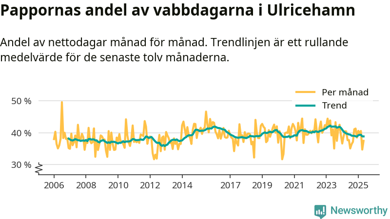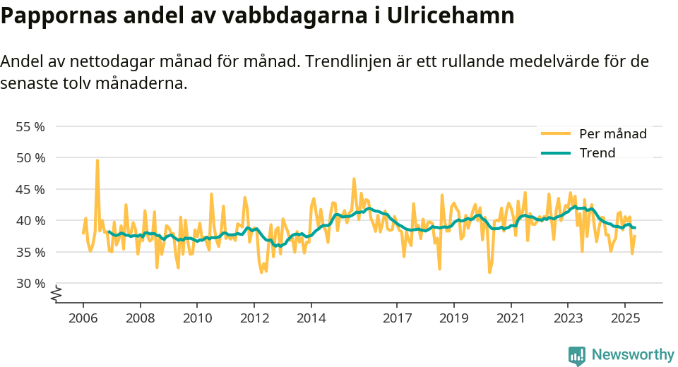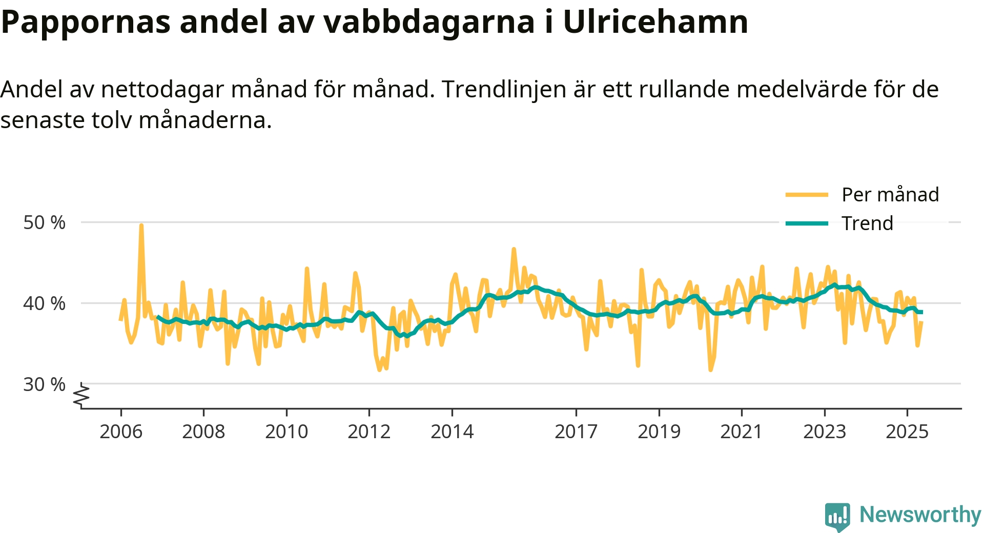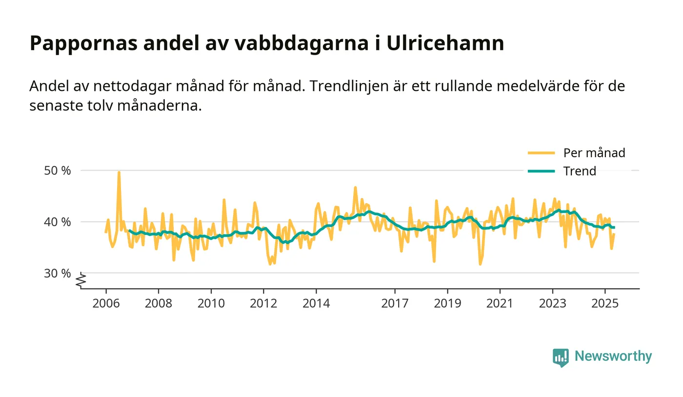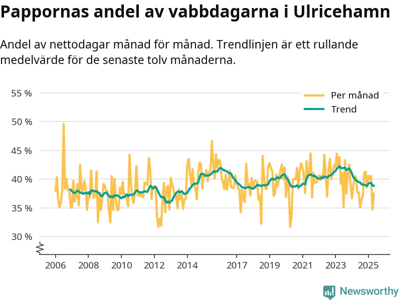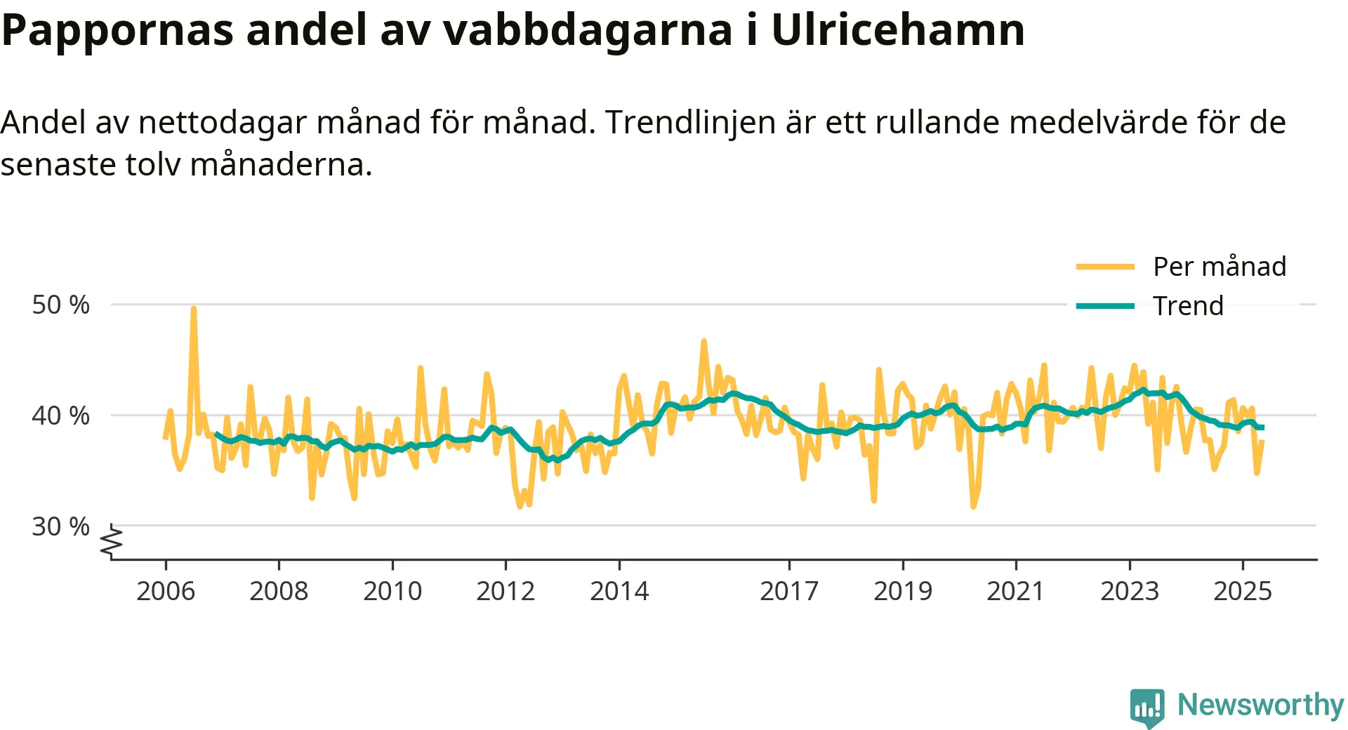 Ulricehamn ligger en bit från ett jämställt uttag. Under de senaste tolv månaderna har männen stått för 39 procent av all vabb i kommunen. I år har andelen varit lägre än på över fyra år.