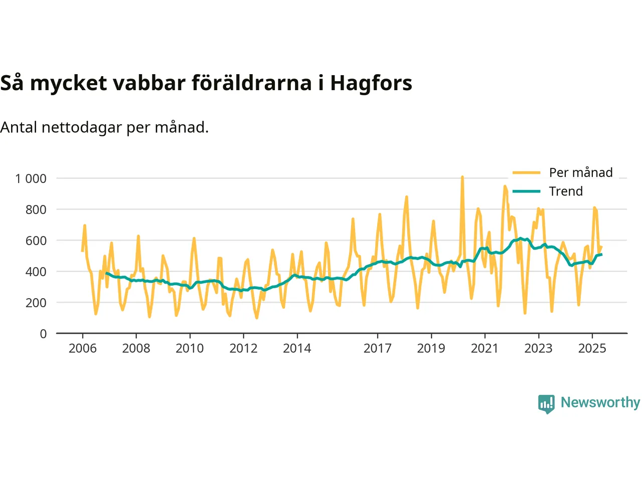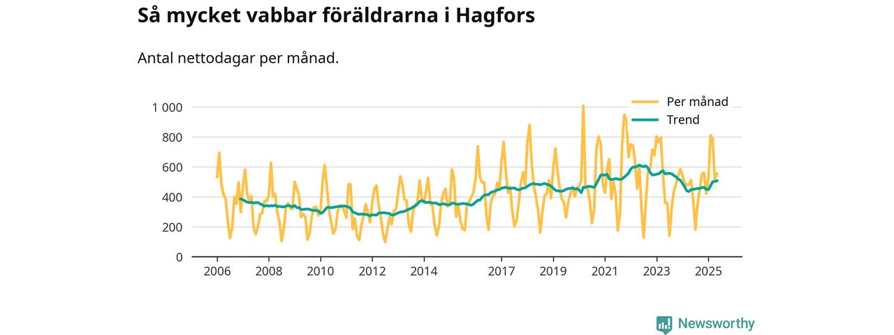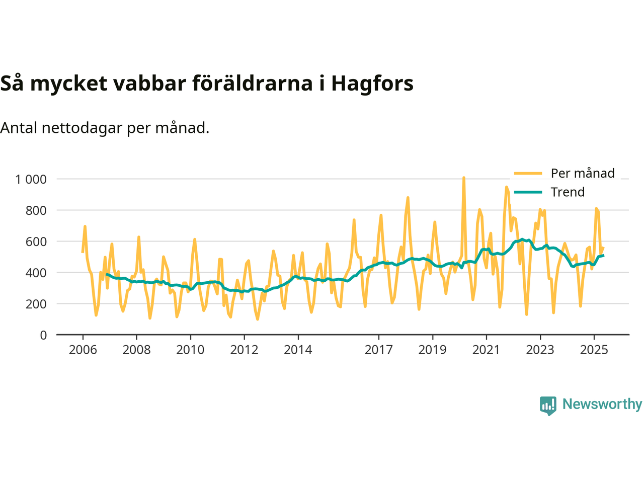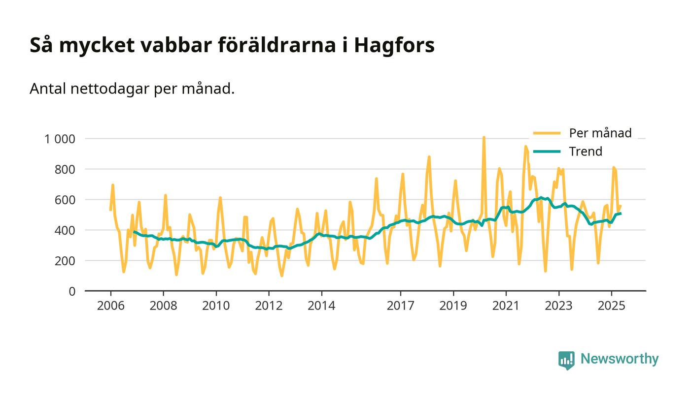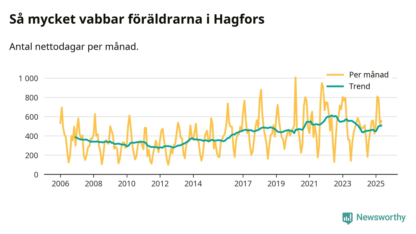 När coronapandemin drog in i mars 2020 peakade antalet vabbdagar både i Hagfors kommun och i riket som helhet. Under de senaste två åren har vabbuttaget börjat minska igen.