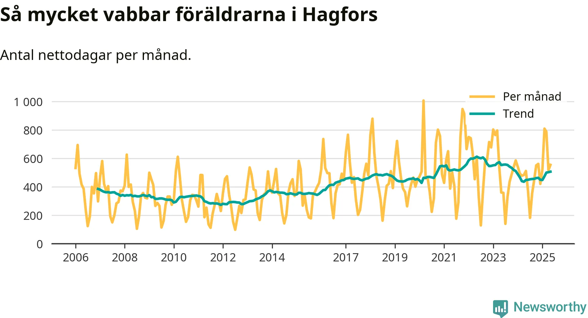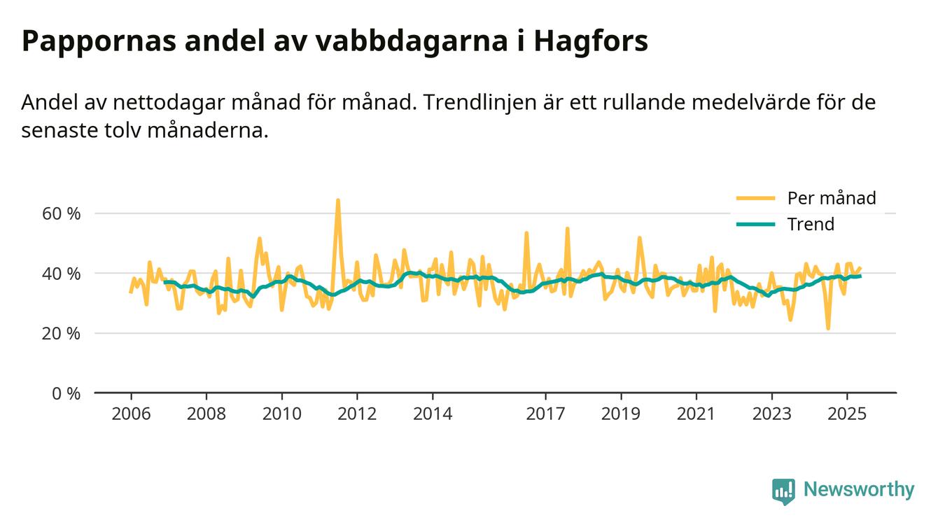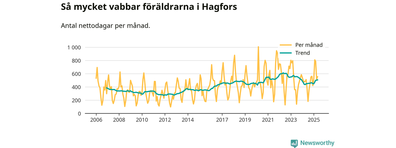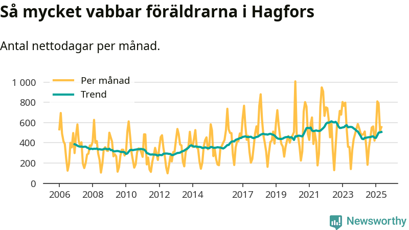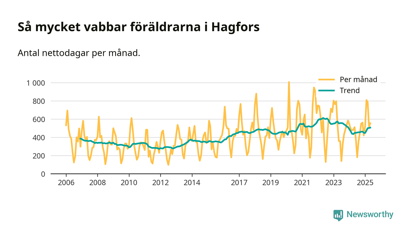 När coronapandemin drog in i mars 2020 peakade antalet vabbdagar både i Hagfors kommun och i riket som helhet. Under de senaste två åren har vabbuttaget börjat minska igen.