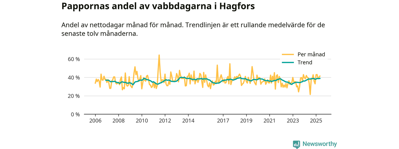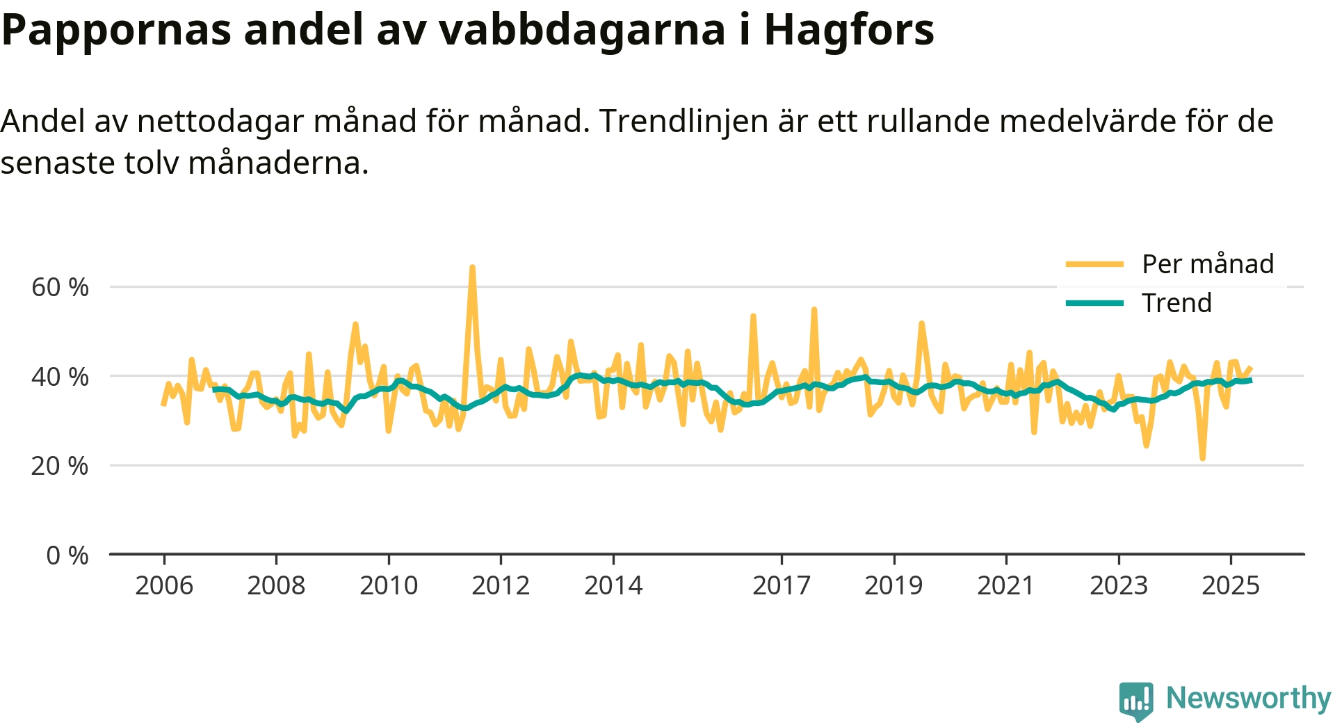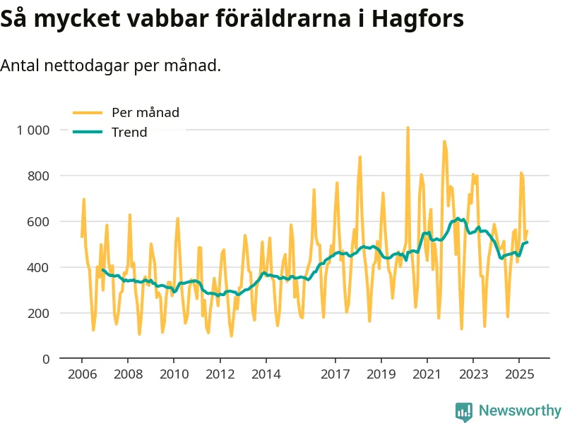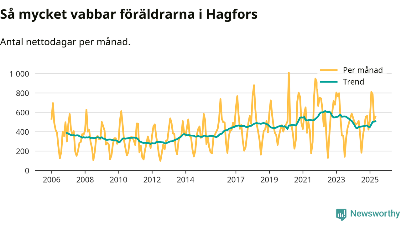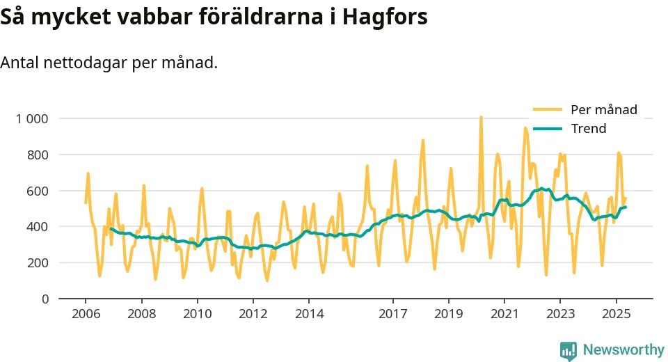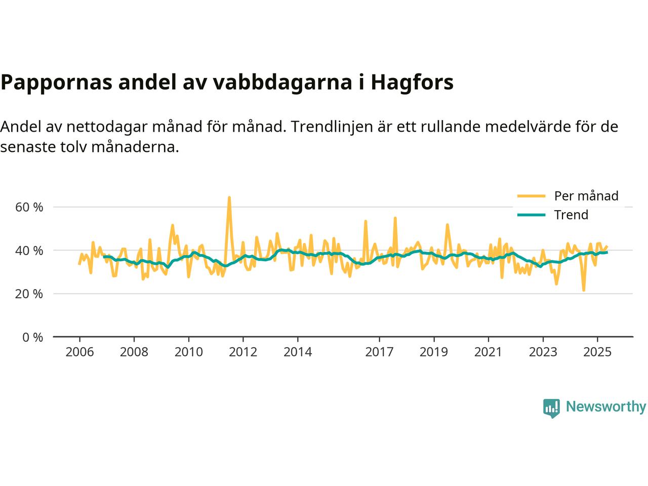 När coronapandemin drog in i mars 2020 peakade antalet vabbdagar både i Hagfors kommun och i riket som helhet. Under de senaste två åren har vabbuttaget börjat minska igen.