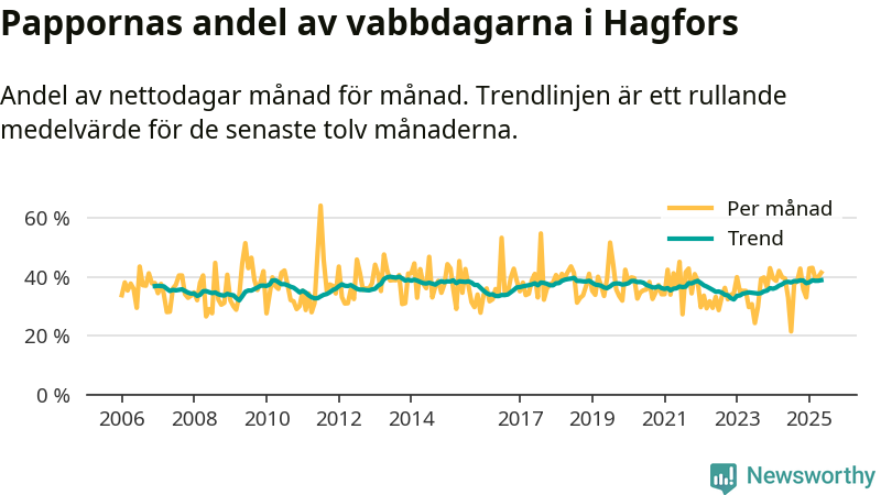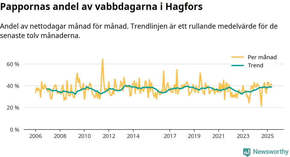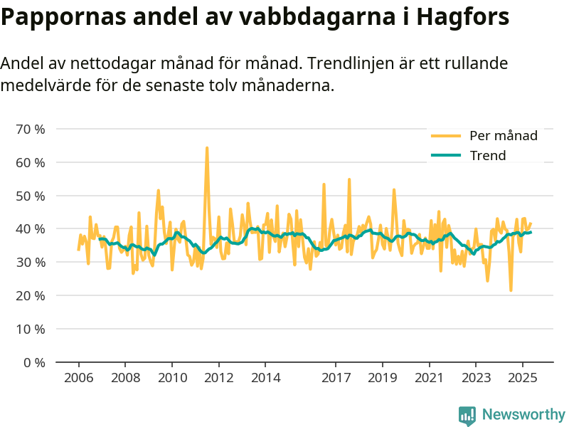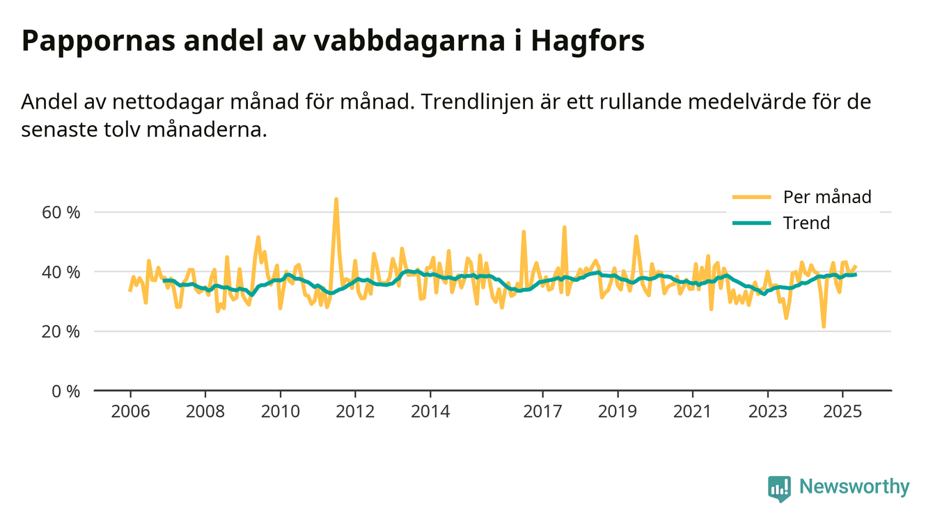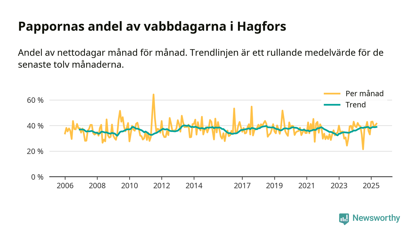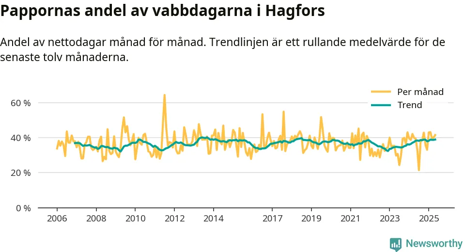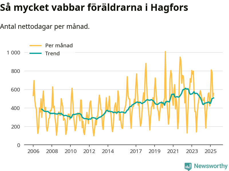 När coronapandemin drog in i mars 2020 peakade antalet vabbdagar både i Hagfors kommun och i riket som helhet. Under de senaste två åren har vabbuttaget börjat minska igen.