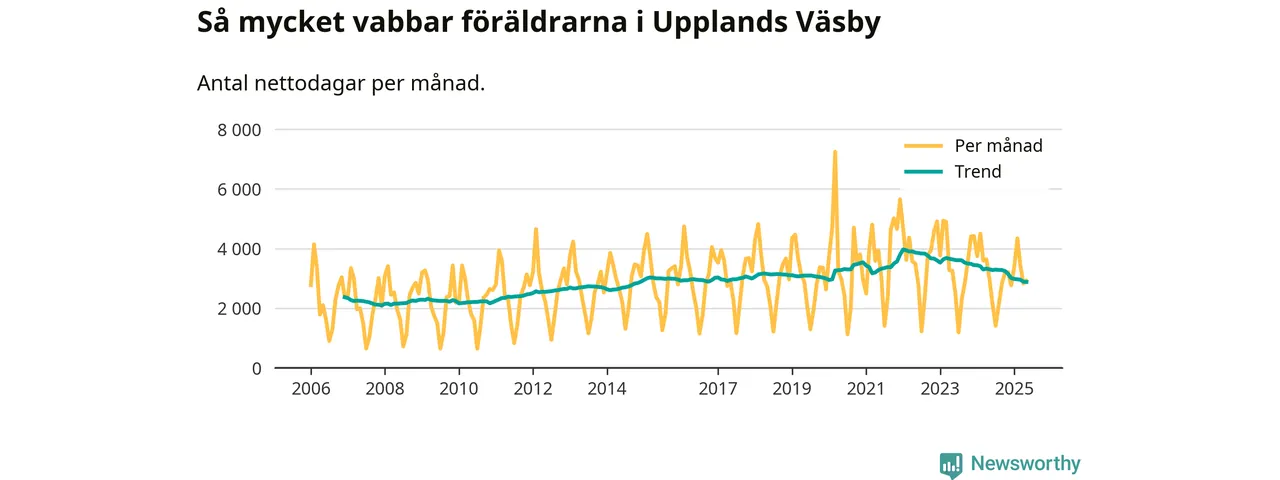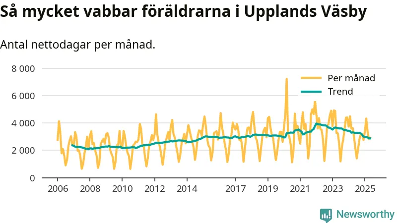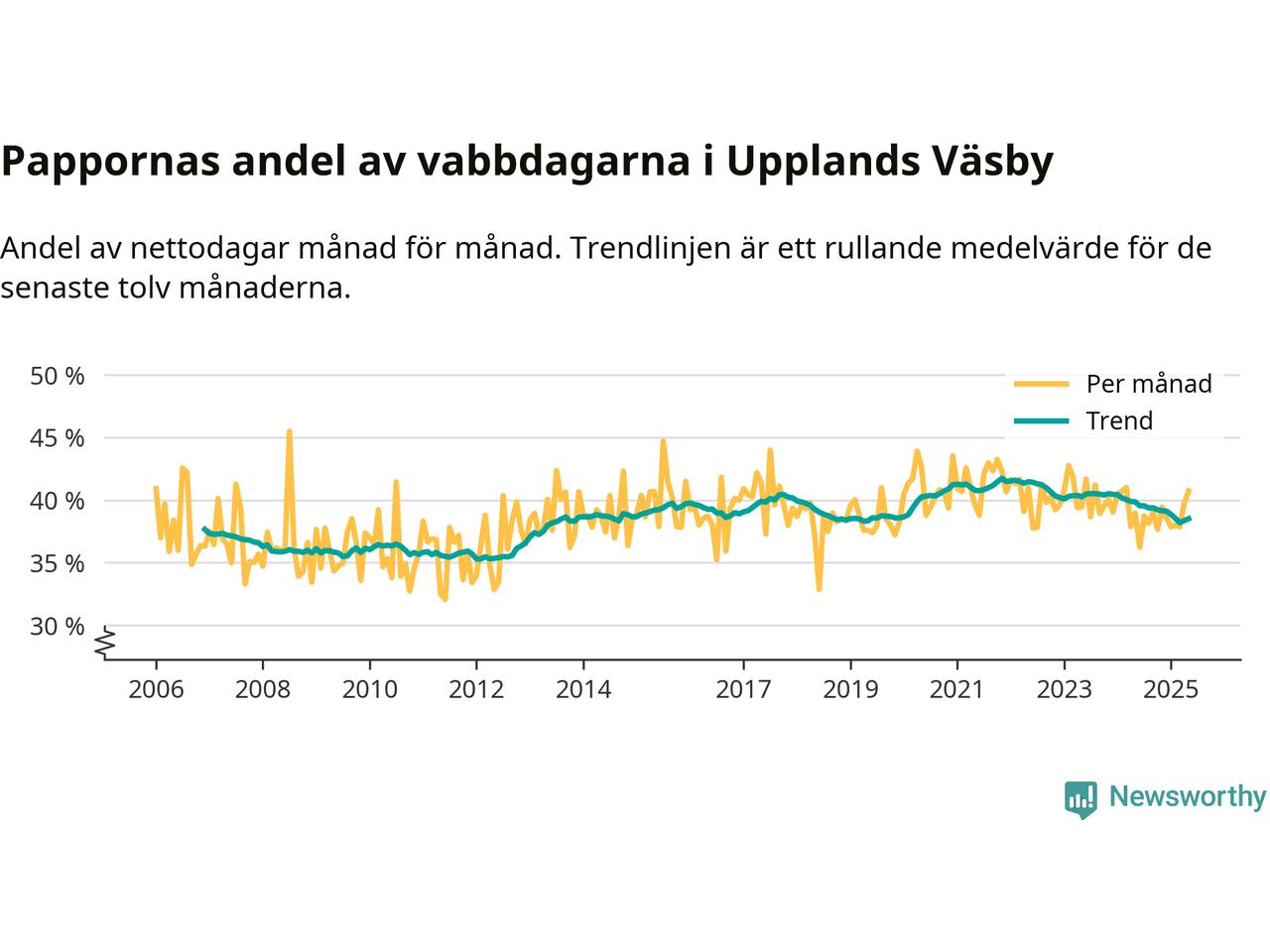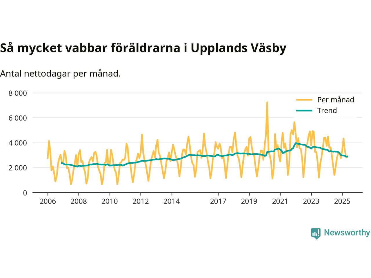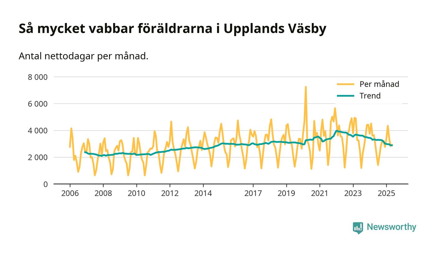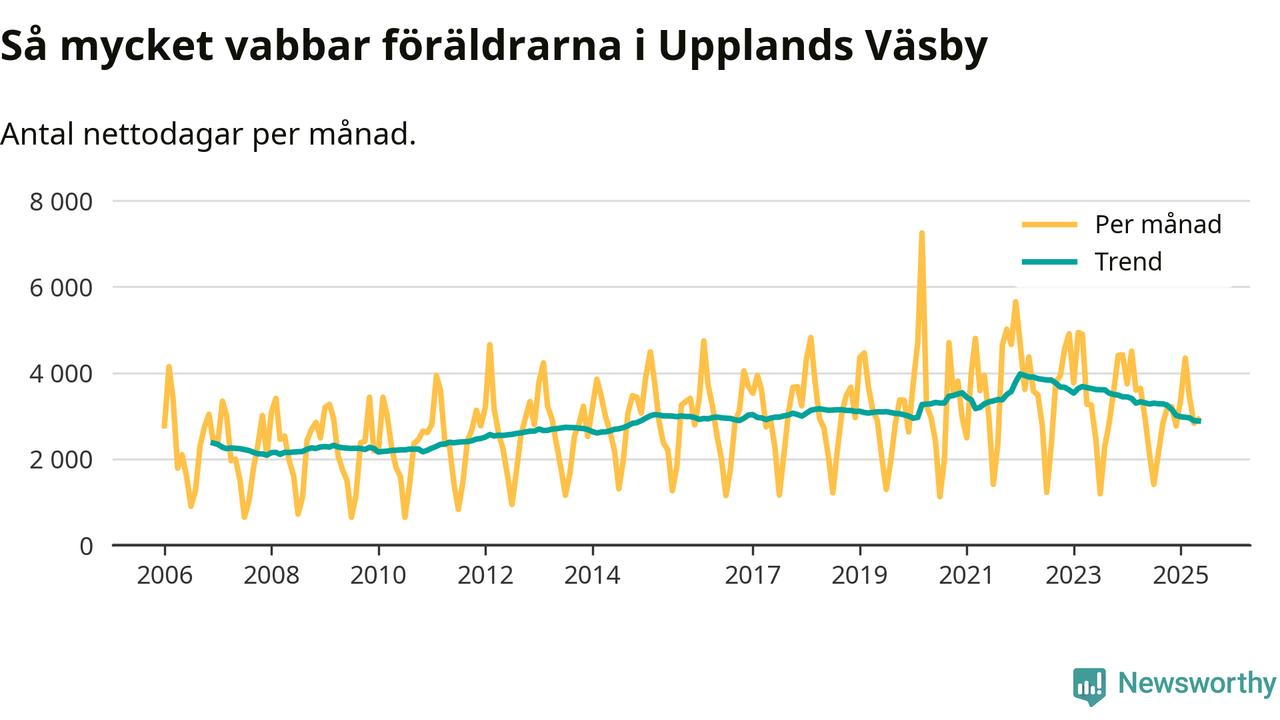 När coronapandemin drog in i mars 2020 peakade antalet vabbdagar både i Upplands Väsby kommun och i riket som helhet. Under de senaste två åren har vabbuttaget börjat minska igen.