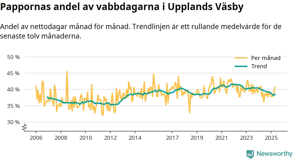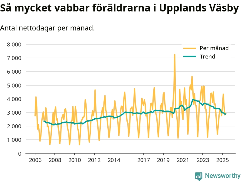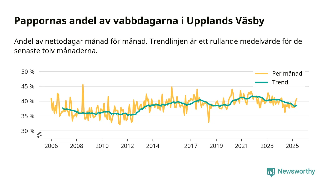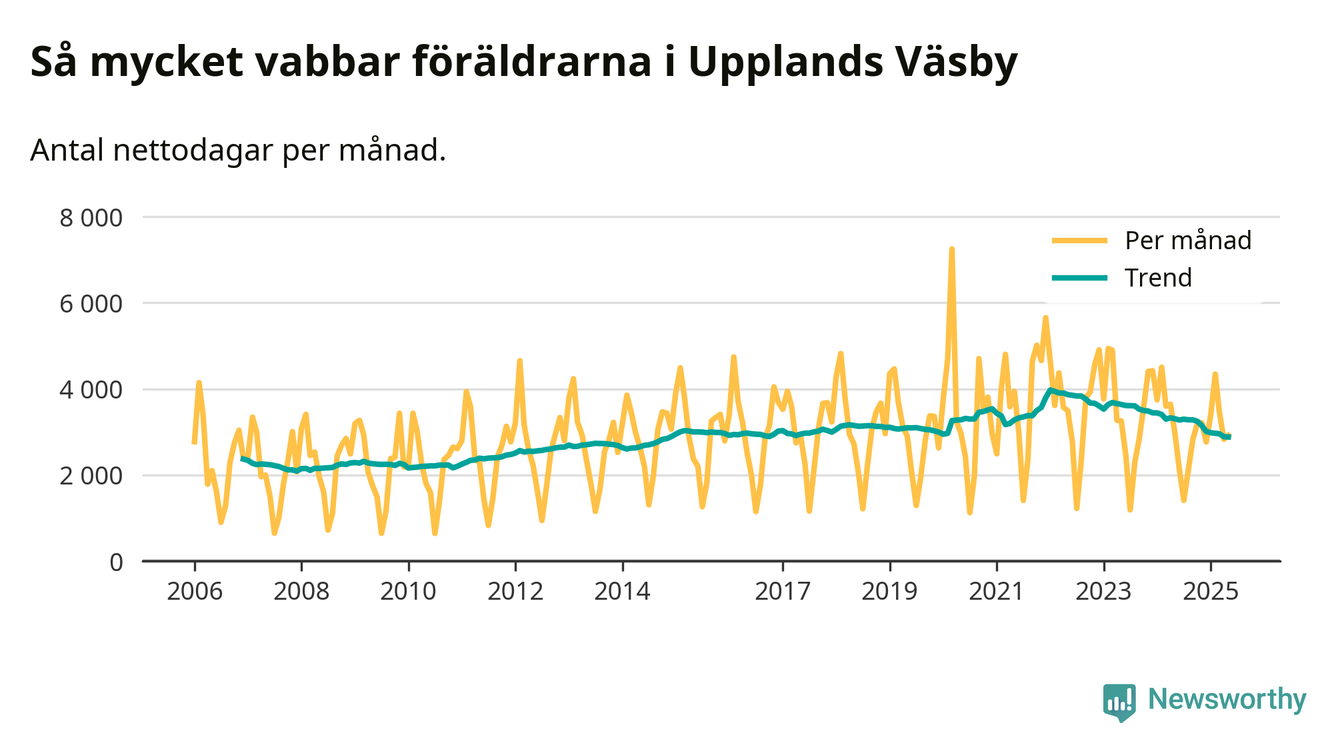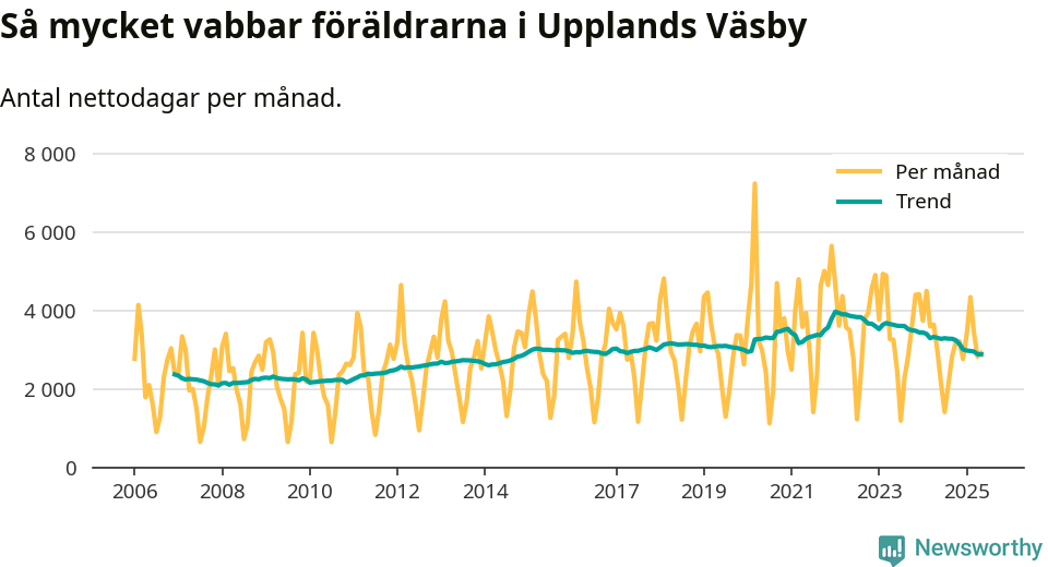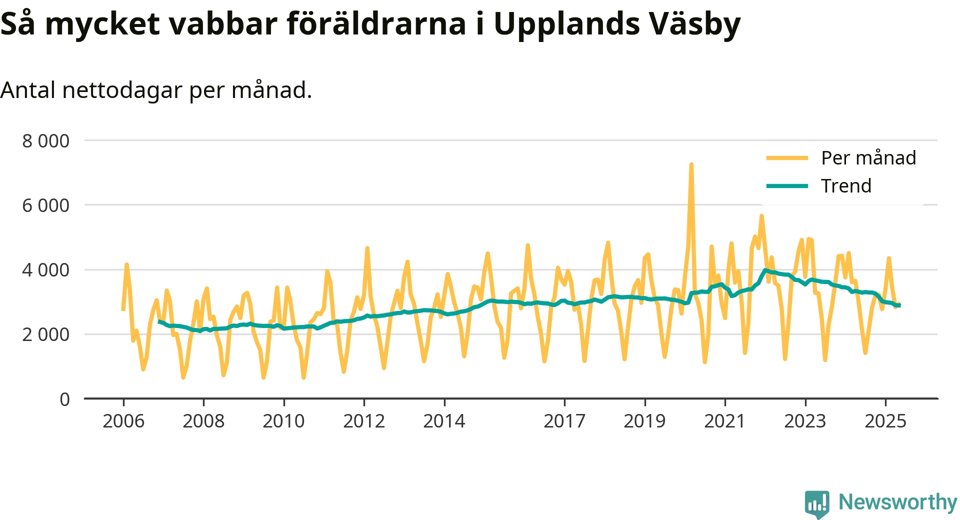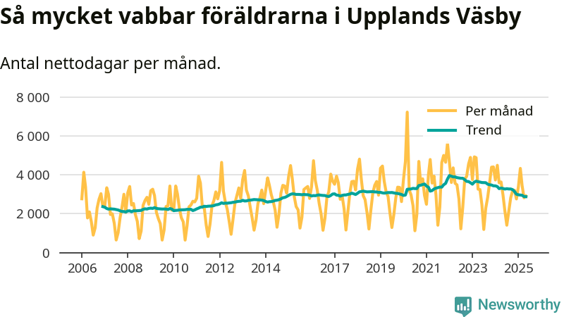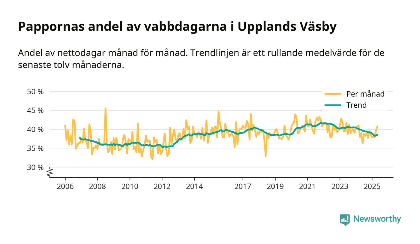 När coronapandemin drog in i mars 2020 peakade antalet vabbdagar både i Upplands Väsby kommun och i riket som helhet. Under de senaste två åren har vabbuttaget börjat minska igen.