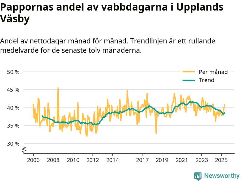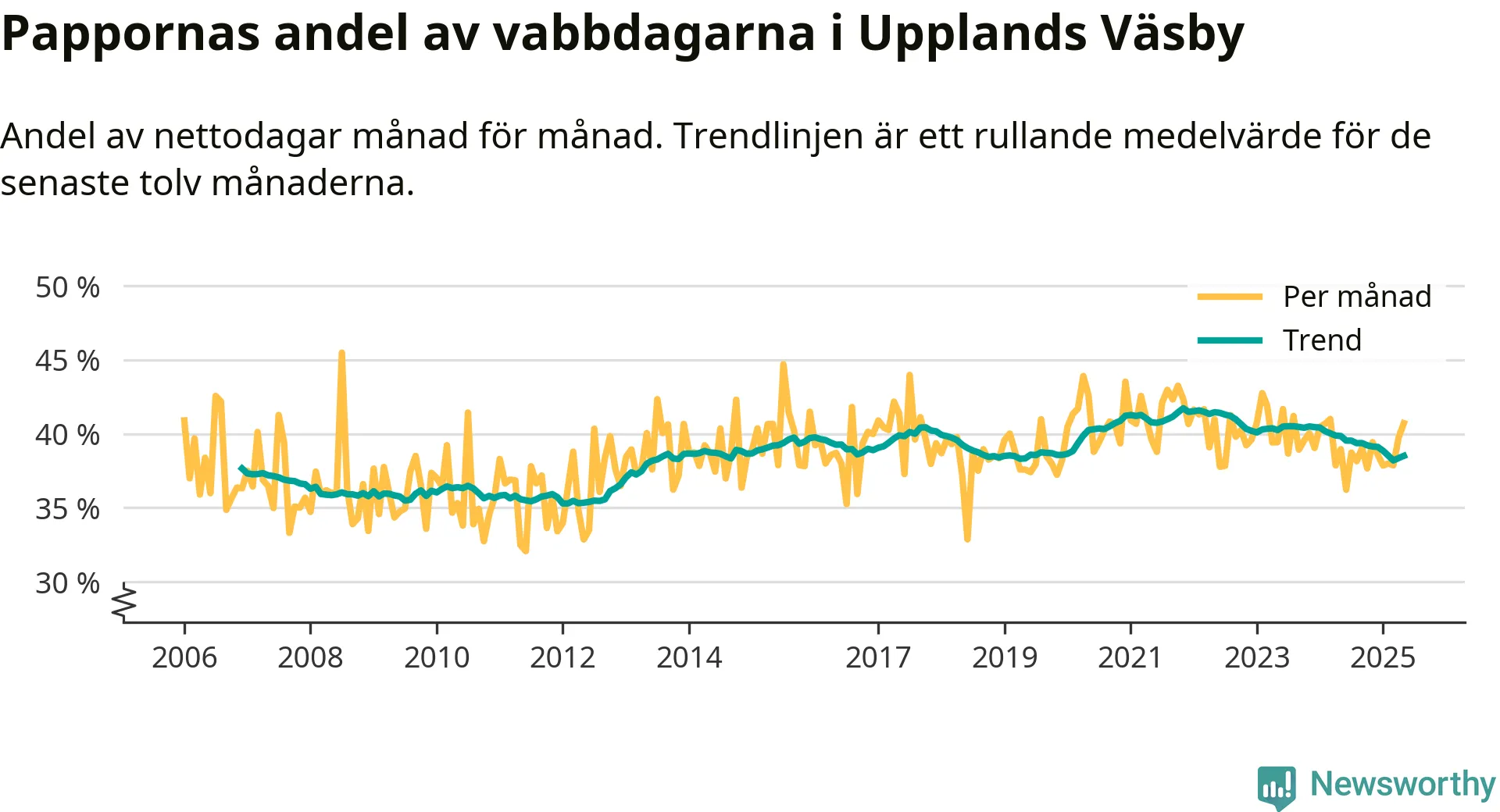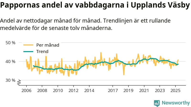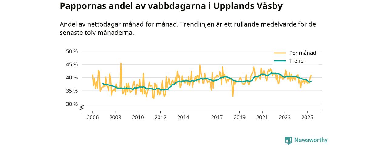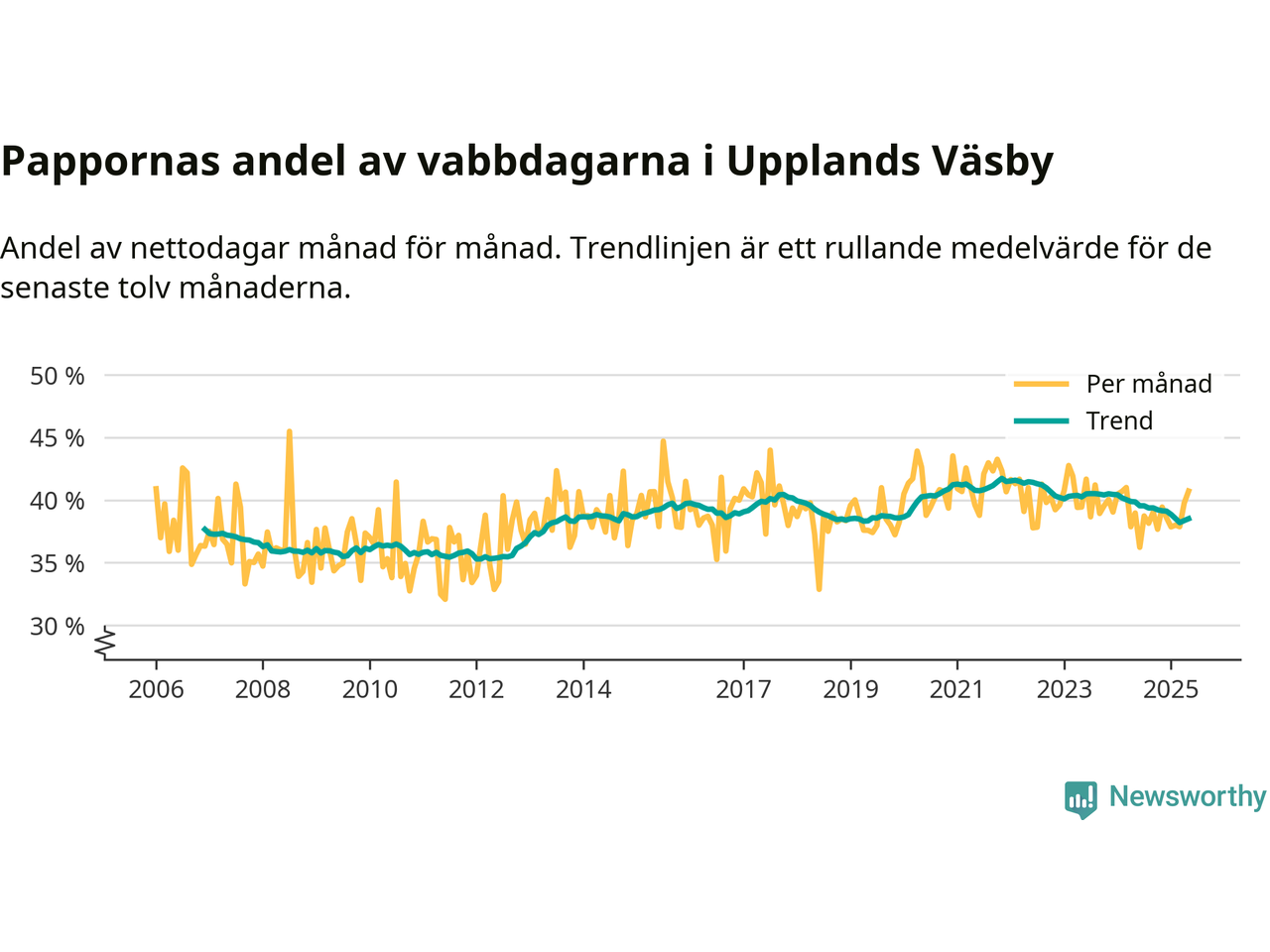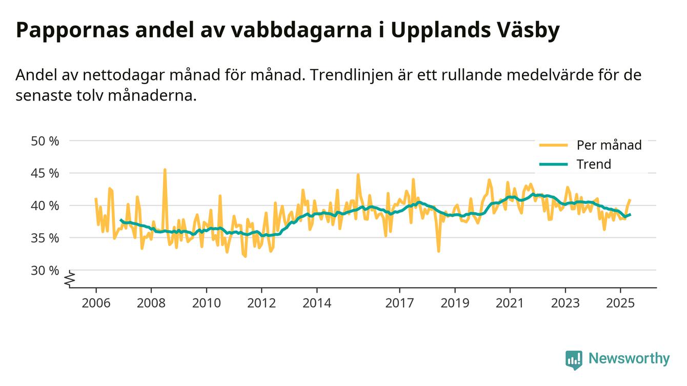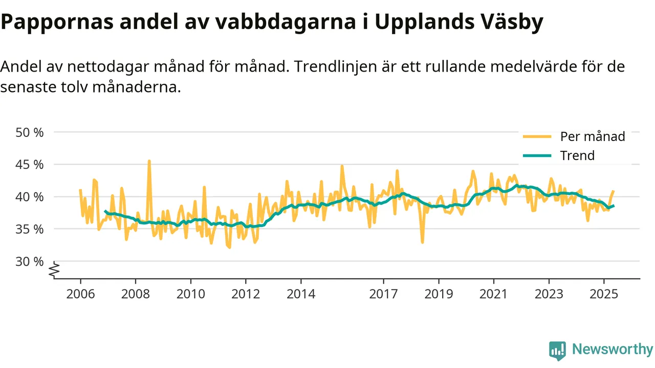 Upplands Väsby ligger en bit från ett jämställt uttag. Under de senaste tolv månaderna har männen stått för 39 procent av all vabb i kommunen. I år har andelen varit lägre än på över sex år.