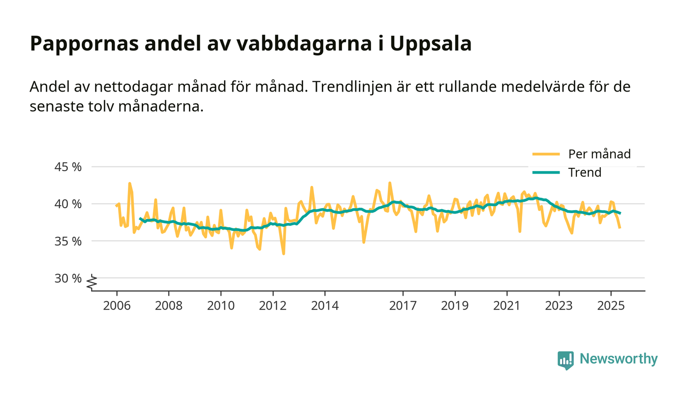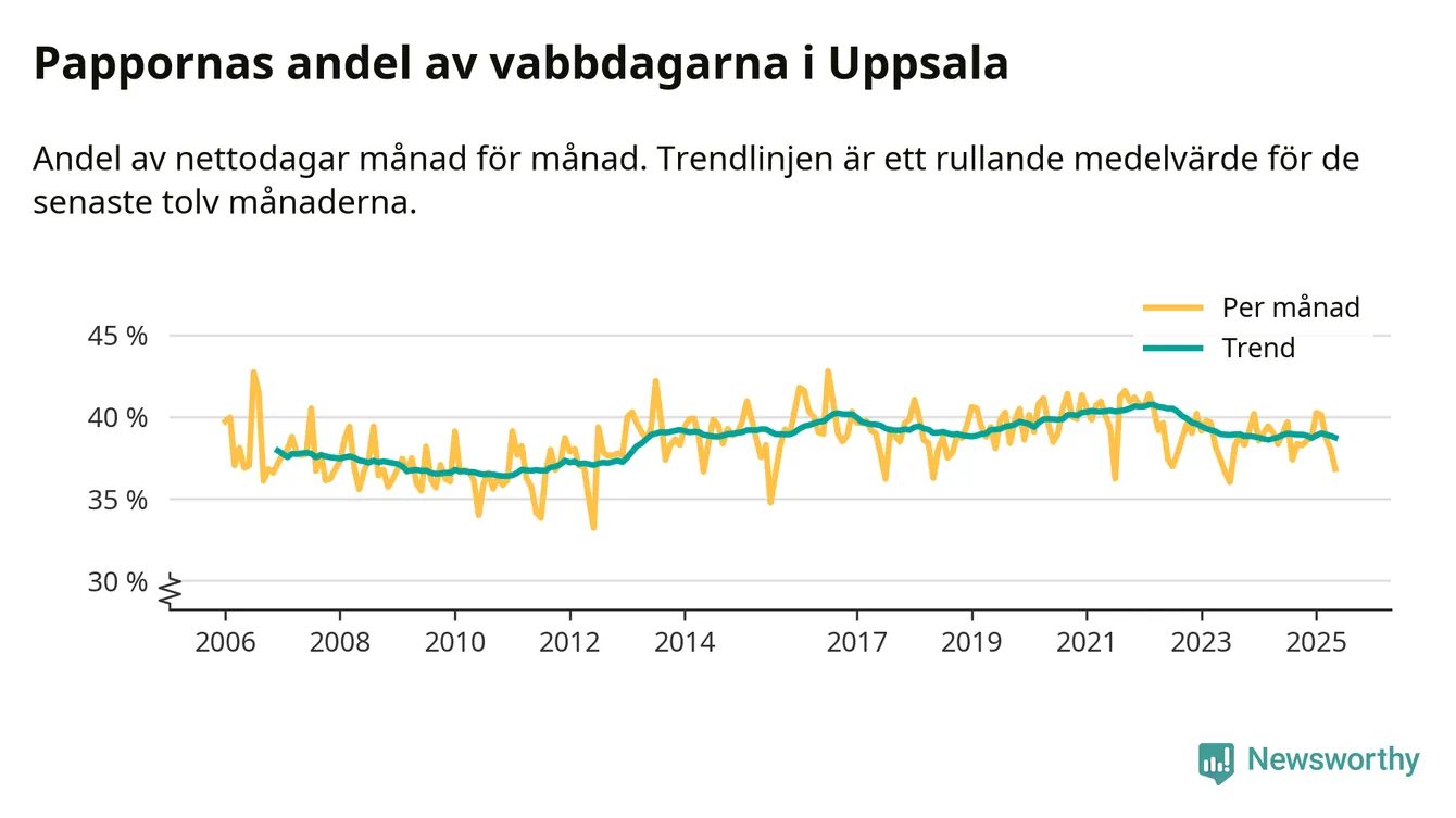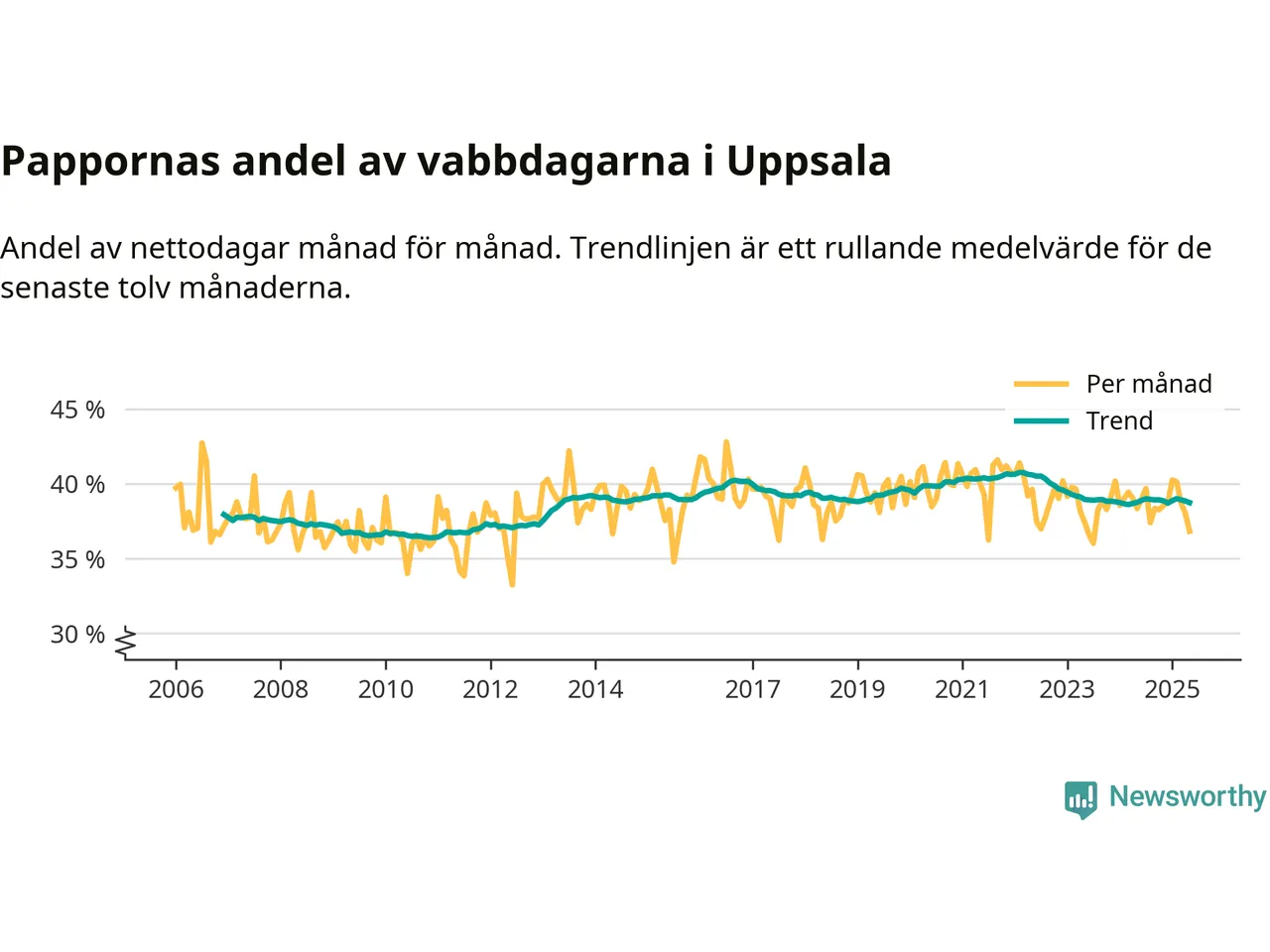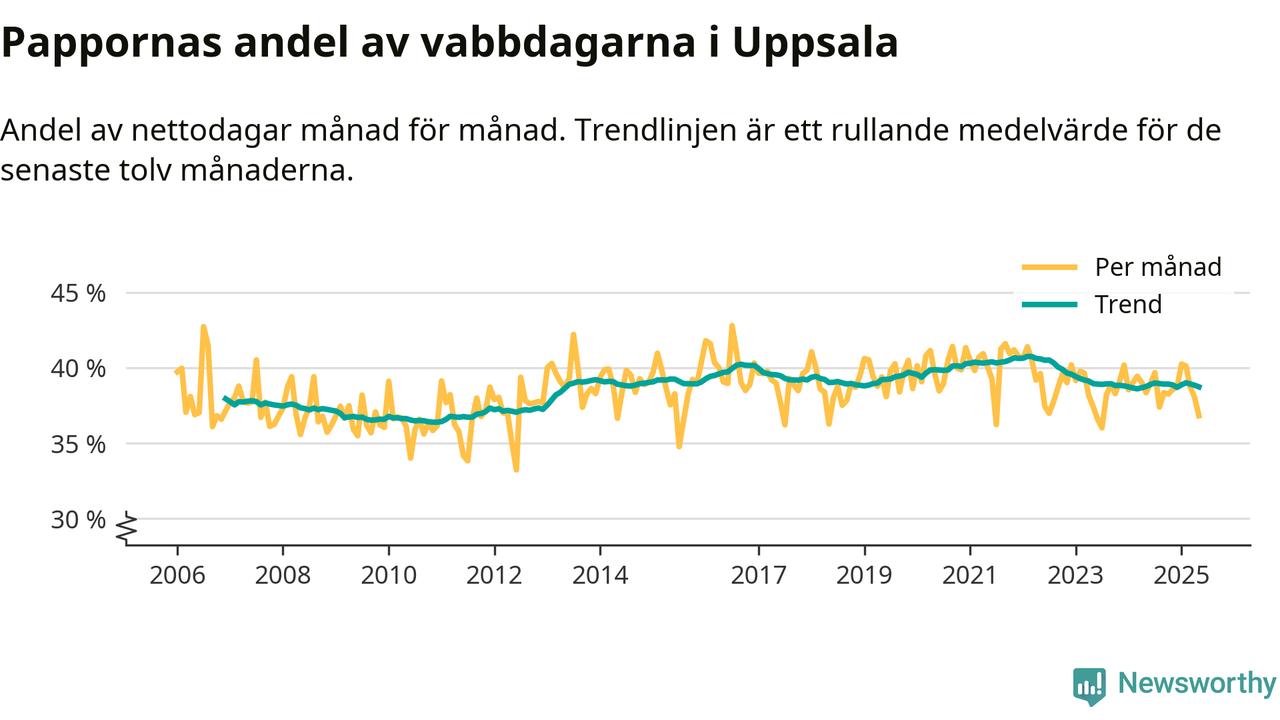 Uppsala ligger en bit från ett jämställt uttag. Under de senaste tolv månaderna har männen stått för 39 procent av all vabb i kommunen. Pappornas uttag peakade vintern 2022 då kommunens fäder var uppe i 41 procent av vabbdagarna 1.