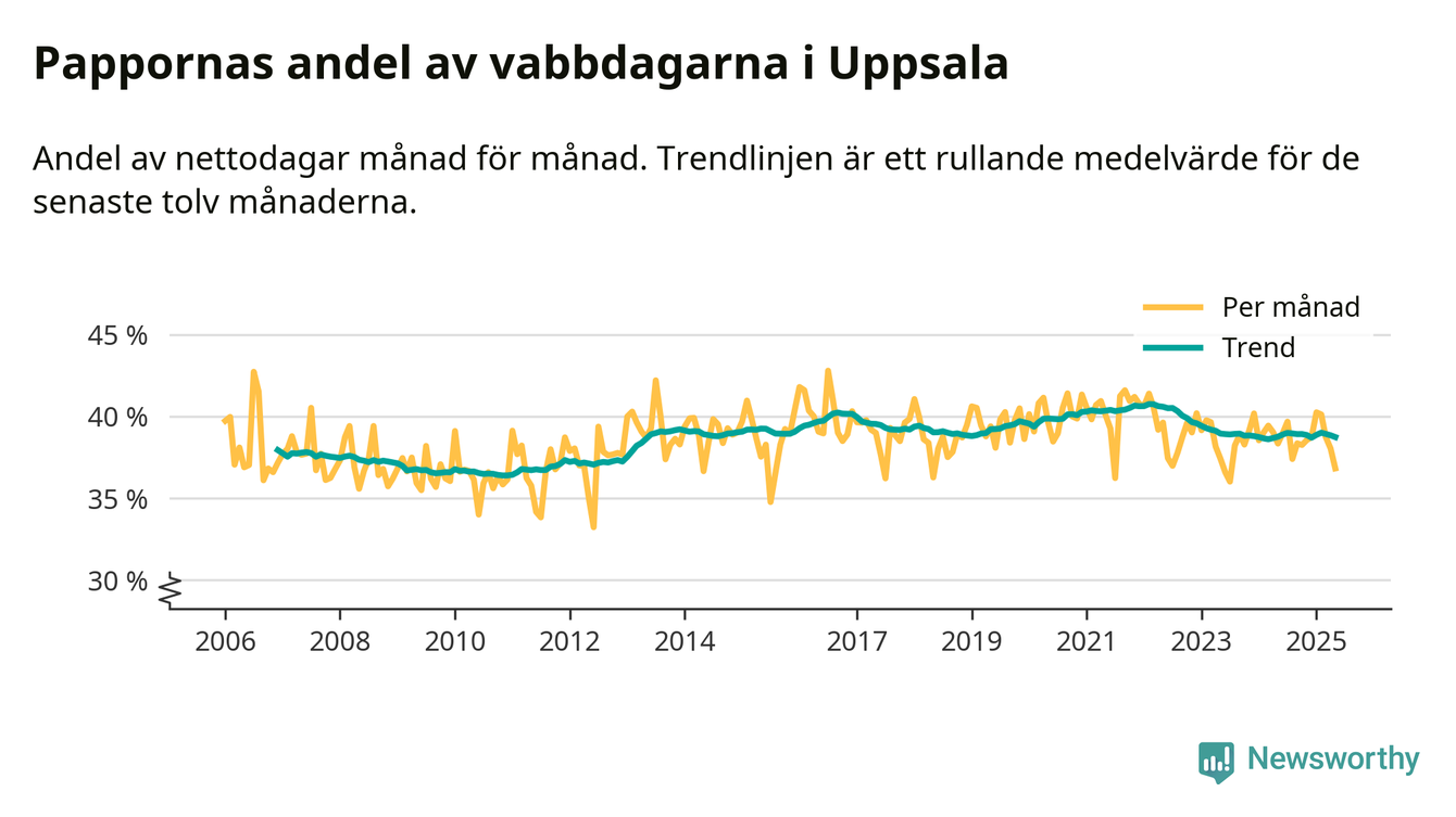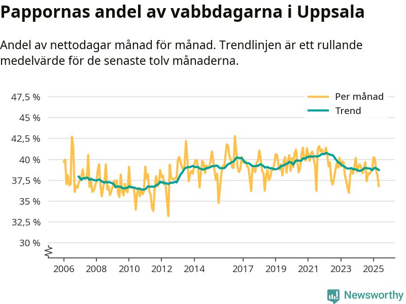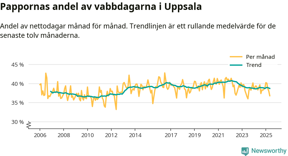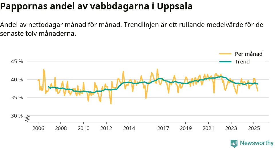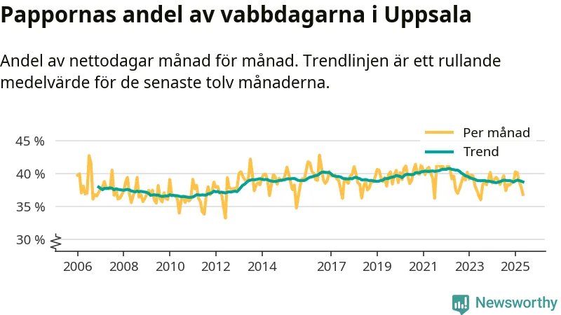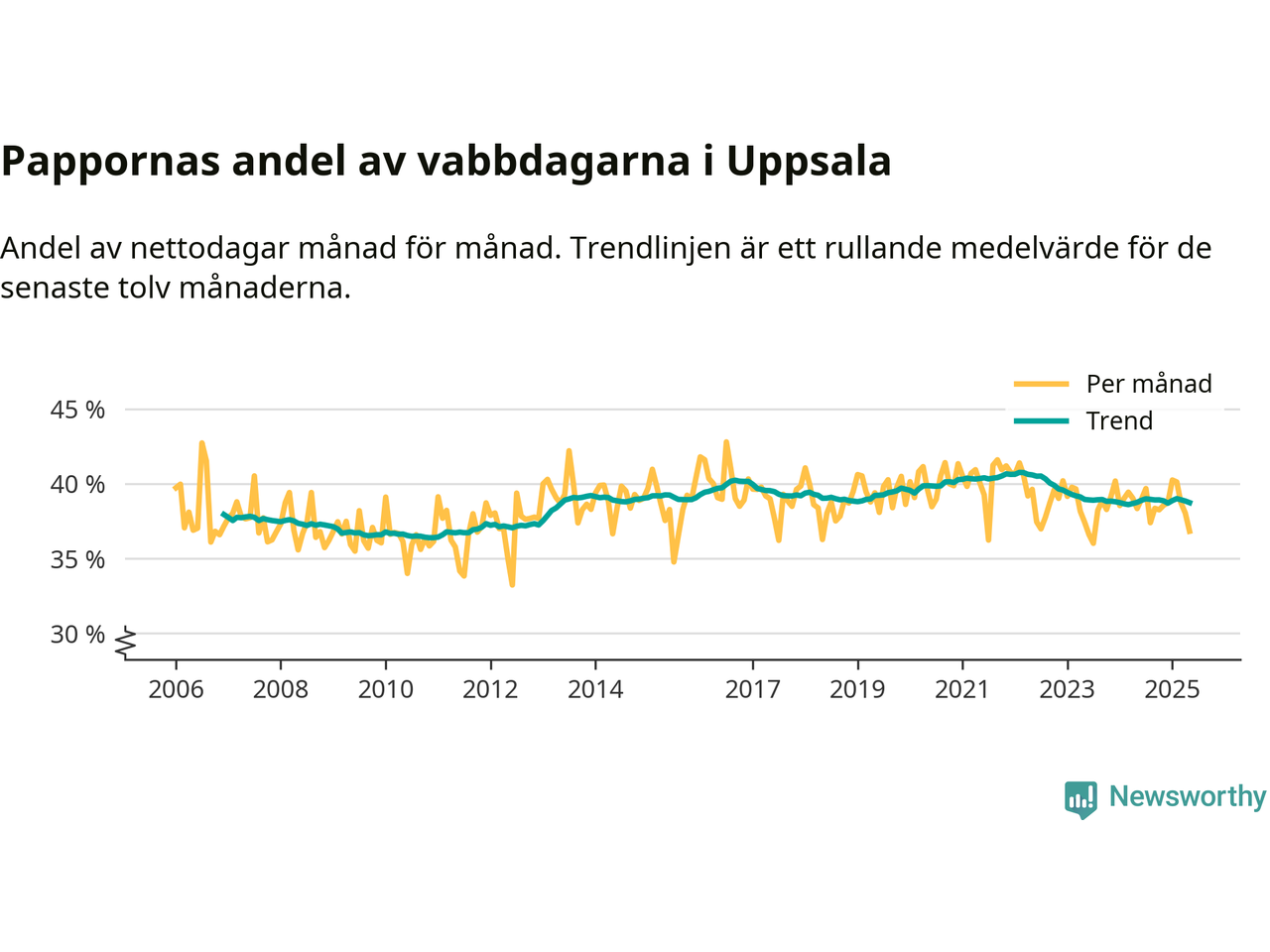 Uppsala ligger en bit från ett jämställt uttag. Under de senaste tolv månaderna har männen stått för 39 procent av all vabb i kommunen. Pappornas uttag peakade vintern 2022 då kommunens fäder var uppe i 41 procent av vabbdagarna 1.