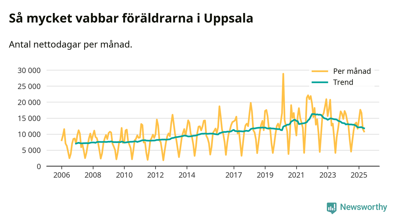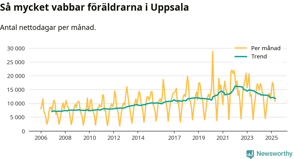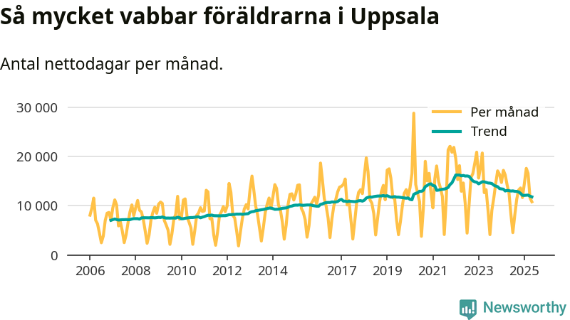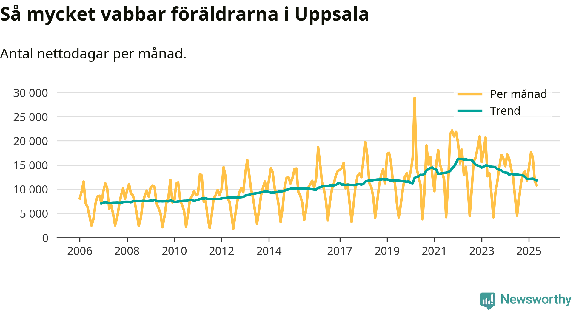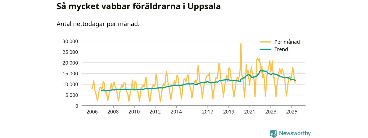 När coronapandemin drog in i mars 2020 peakade antalet vabbdagar både i Uppsala kommun och i riket som helhet. Under de senaste två åren har vabbuttaget börjat minska igen.