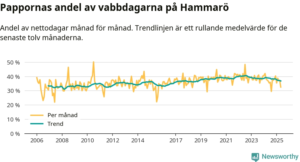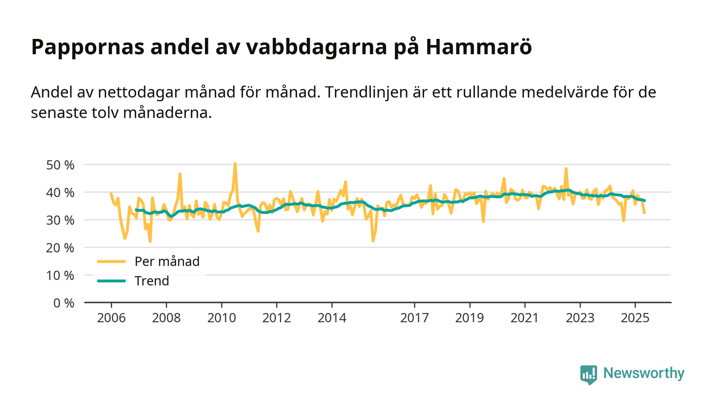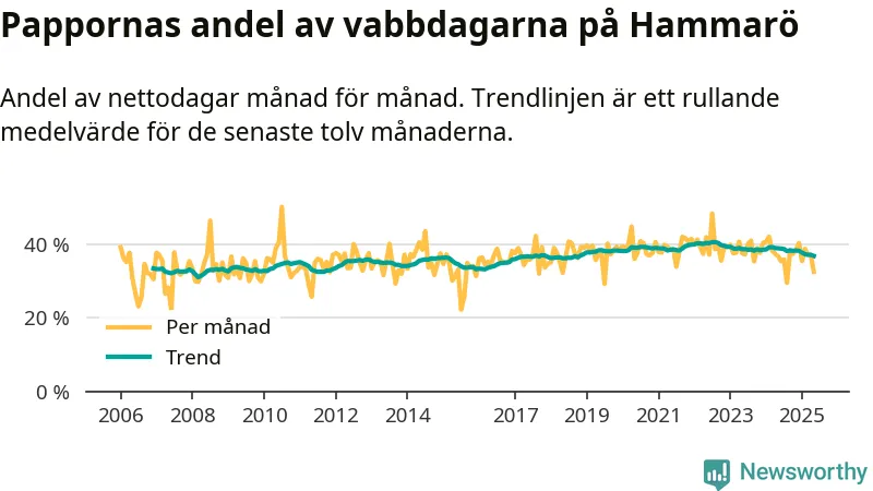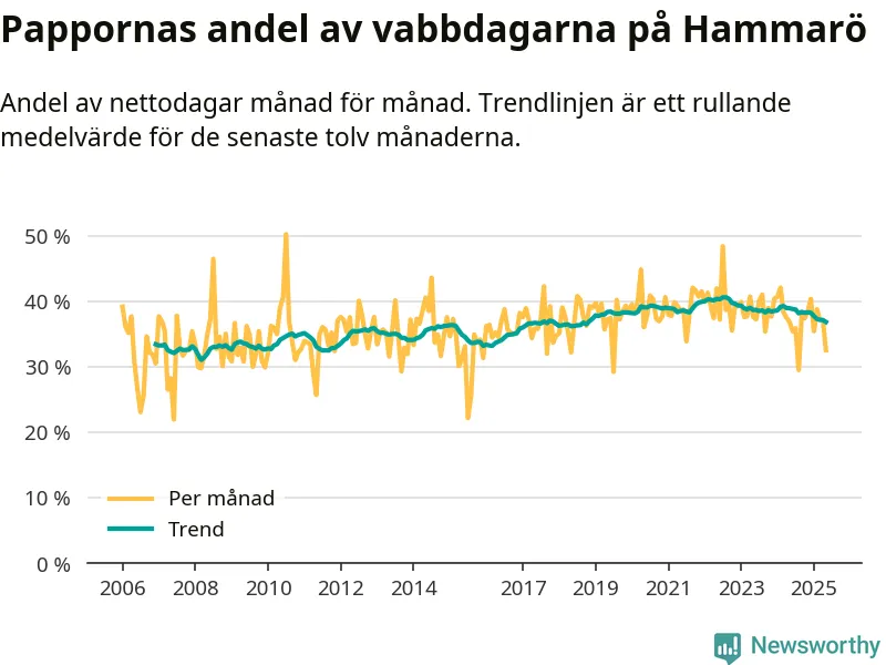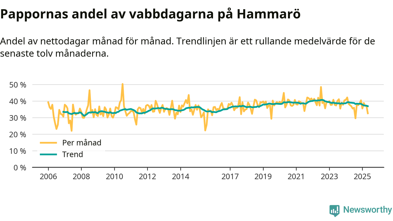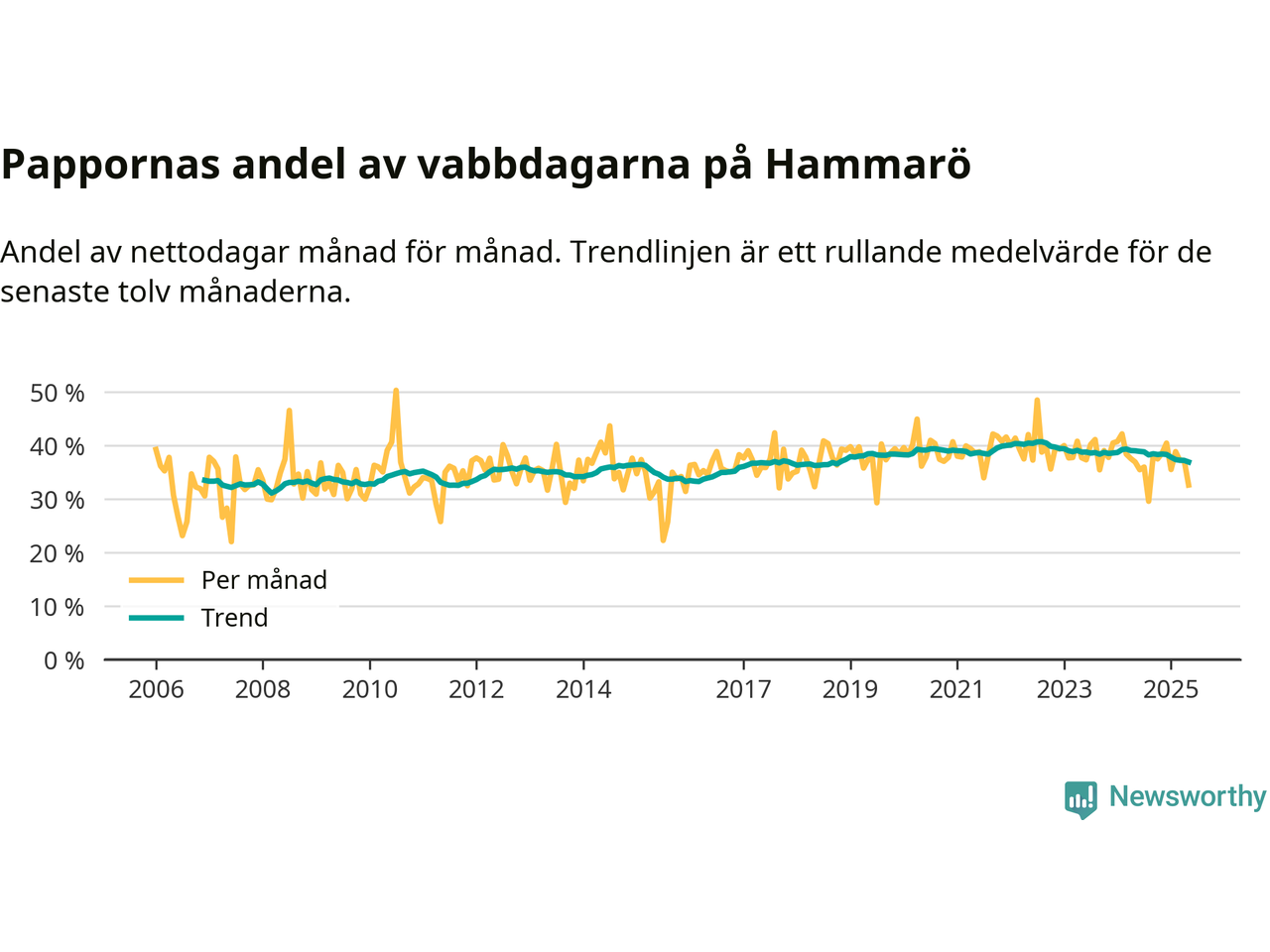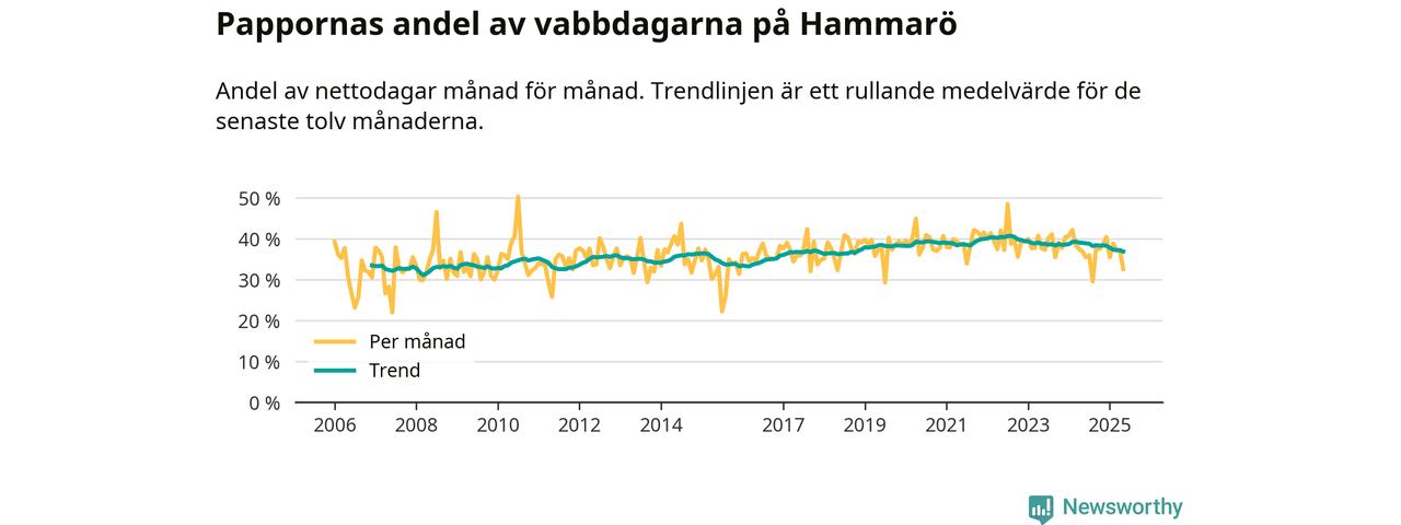Hammarö ligger en bit från ett jämställt uttag. Under de senaste tolv månaderna har männen stått för 37 procent av all vabb i kommunen. Det är en lägre andel än på nästan sju år.