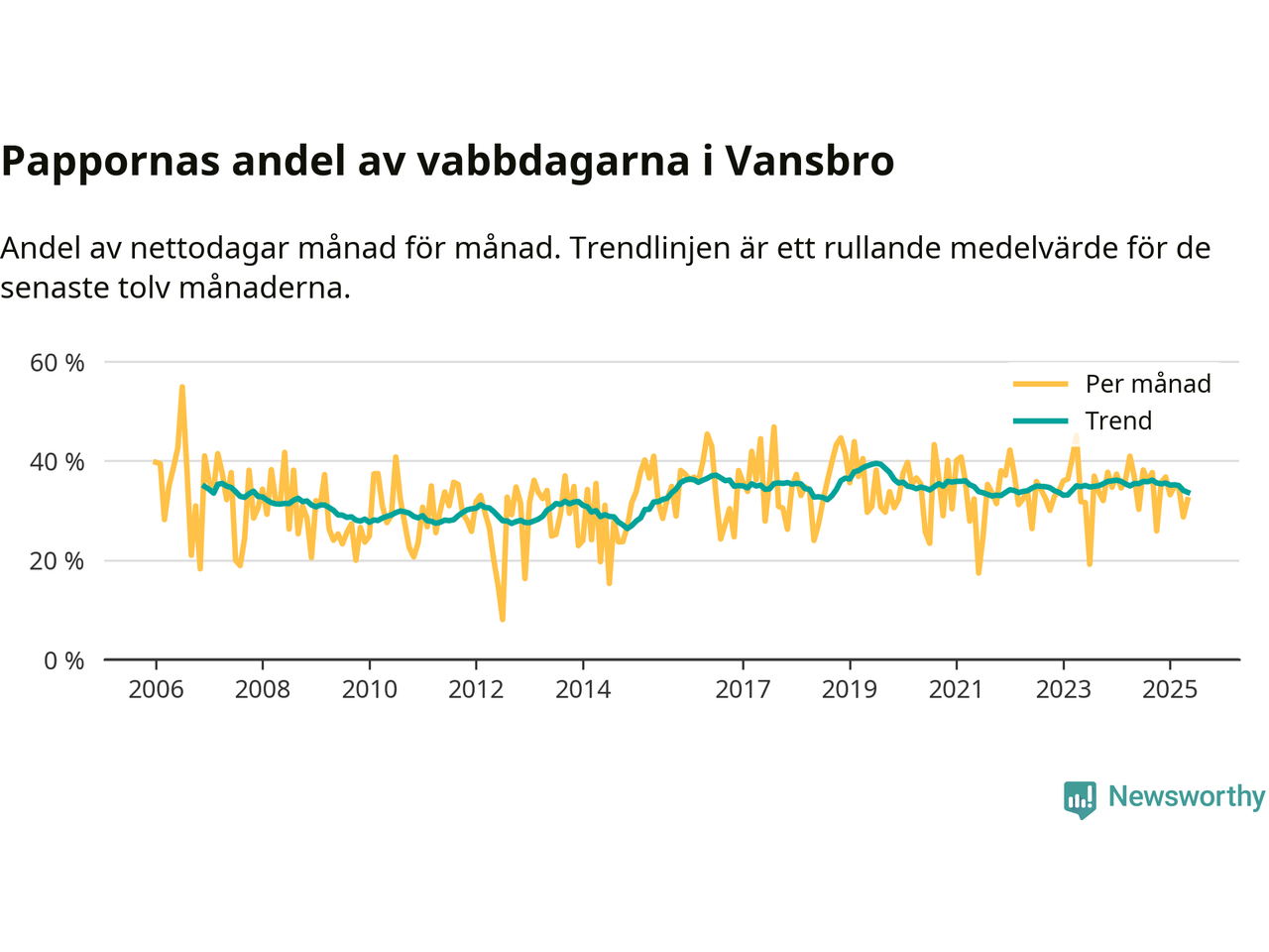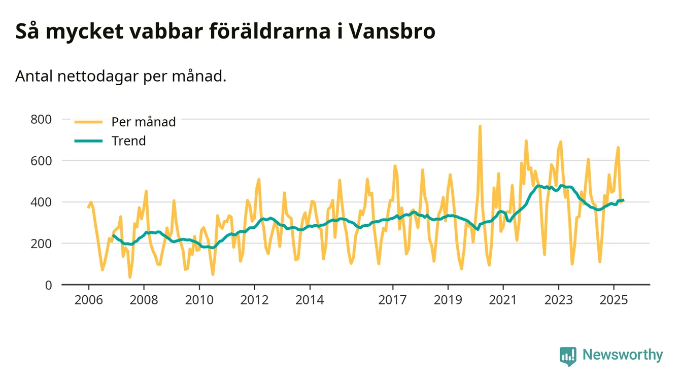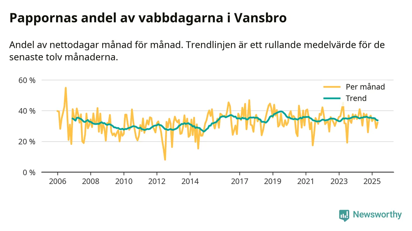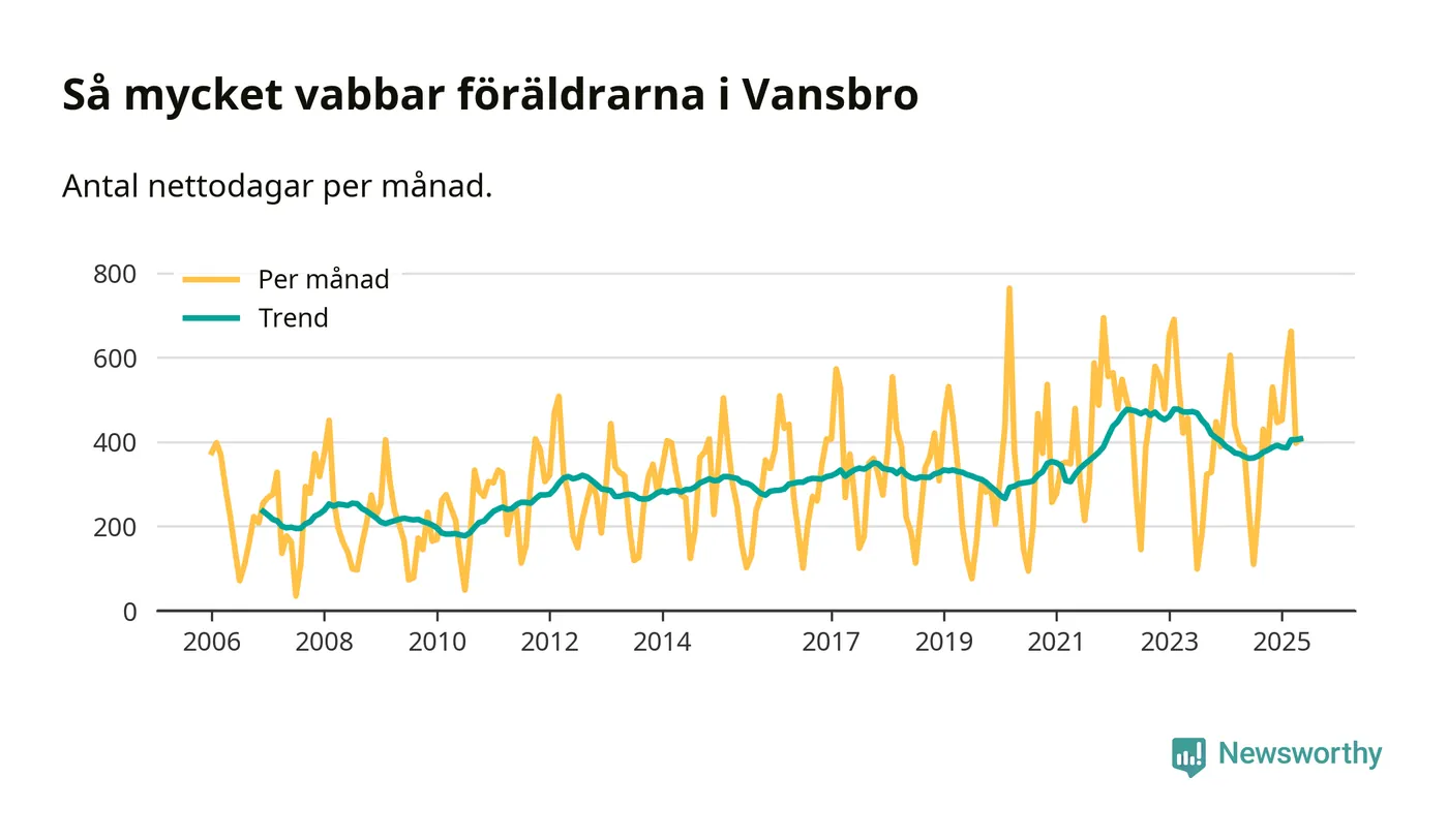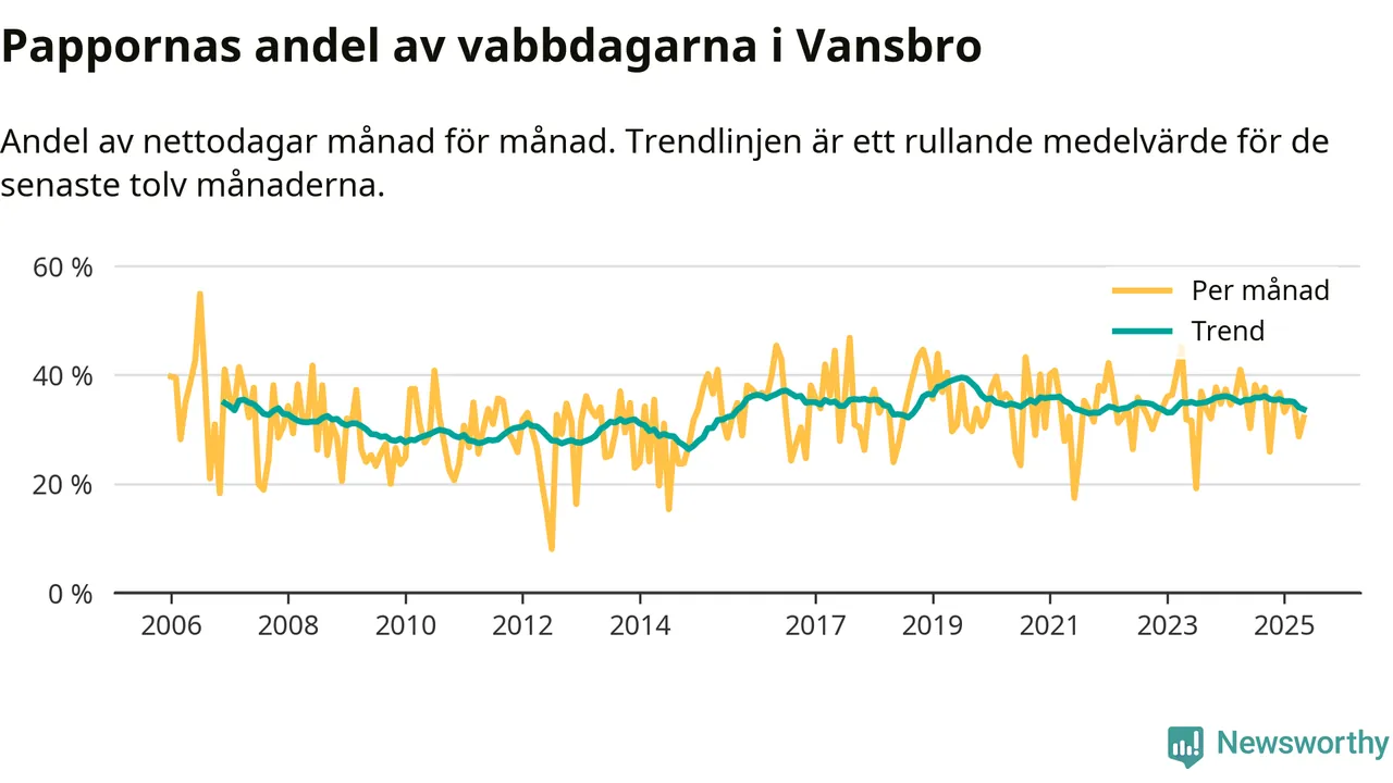 Vansbro ligger en bra bit från ett jämställt uttag. Under de senaste tolv månaderna har männen stått för 34 procent av all vabb i kommunen. Pappornas uttag peakade sommaren 2019 då kommunens fäder var uppe i 40 procent av vabbdagarna 1.