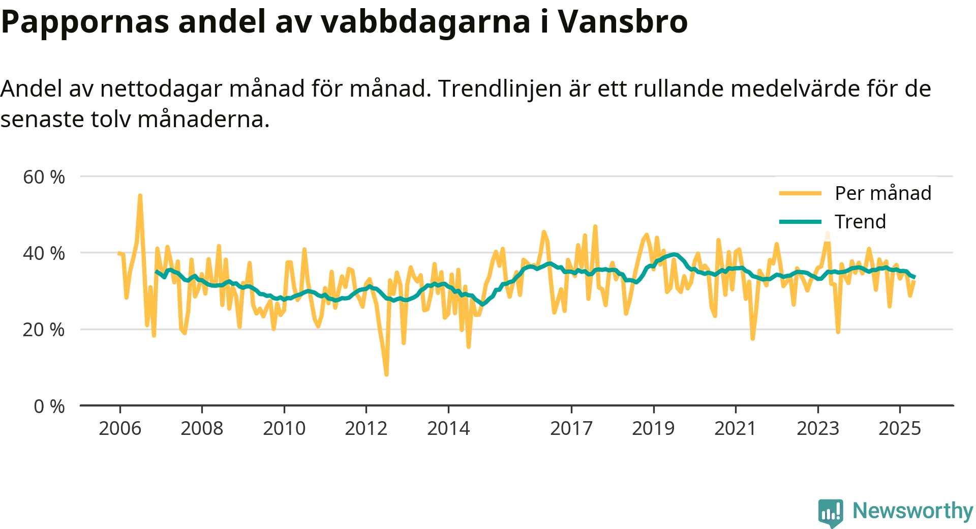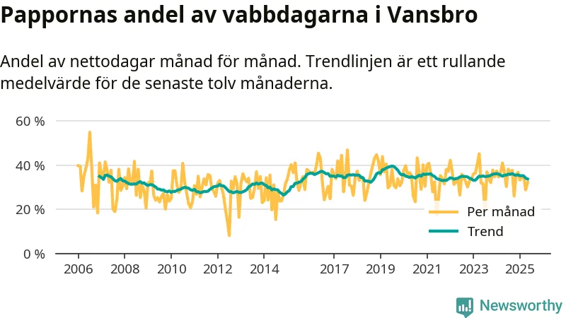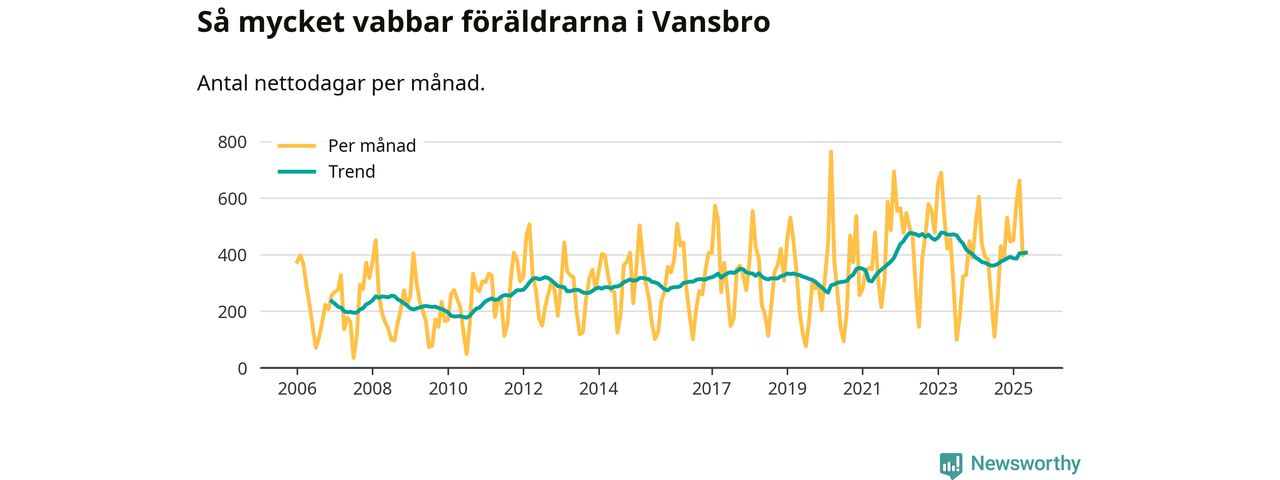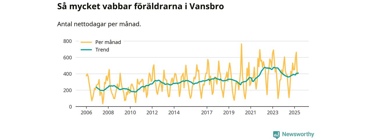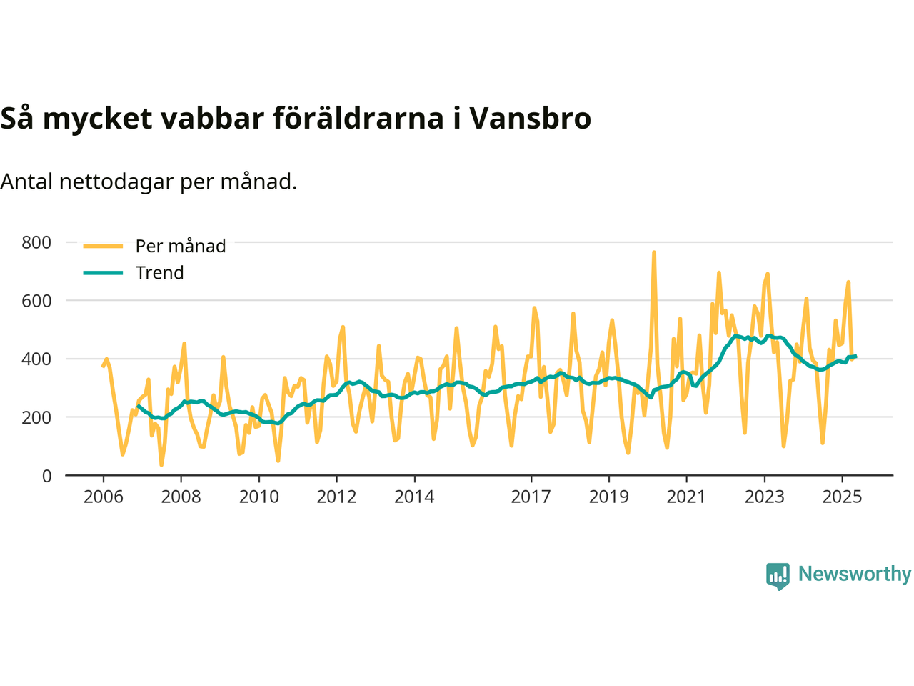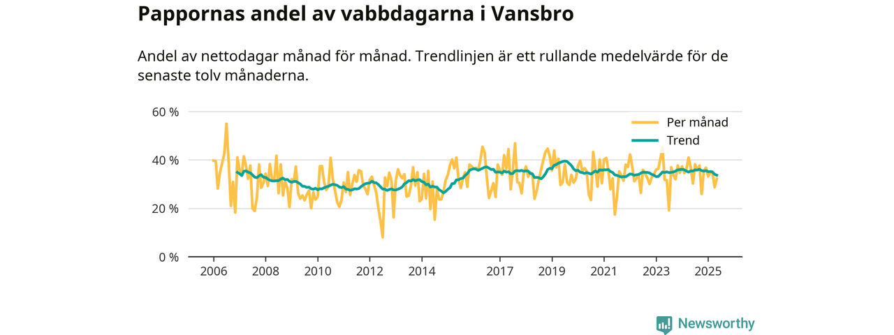 Vansbro ligger en bra bit från ett jämställt uttag. Under de senaste tolv månaderna har männen stått för 34 procent av all vabb i kommunen. Pappornas uttag peakade sommaren 2019 då kommunens fäder var uppe i 40 procent av vabbdagarna 1.
