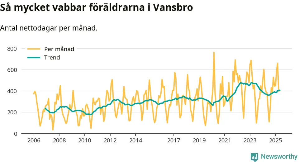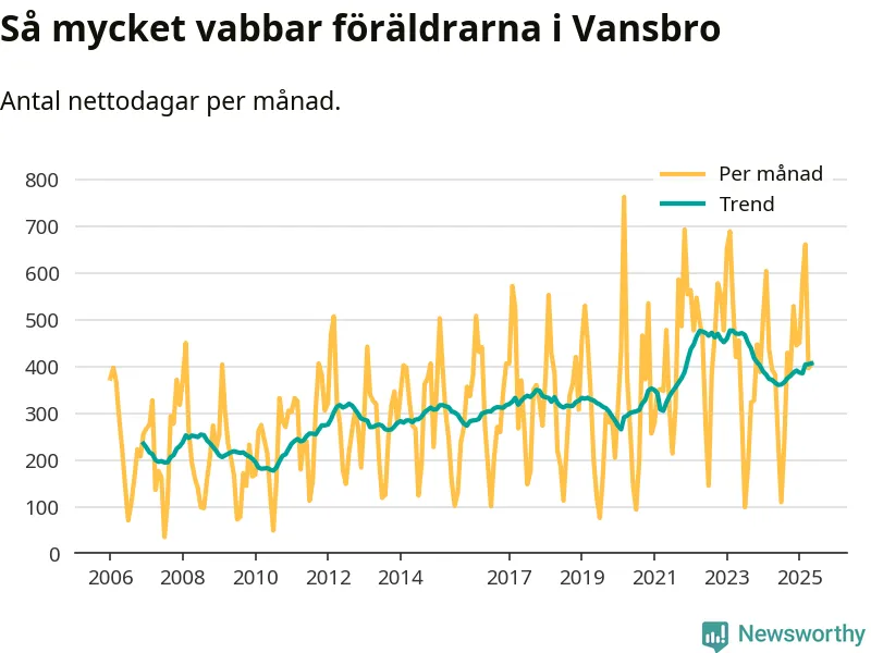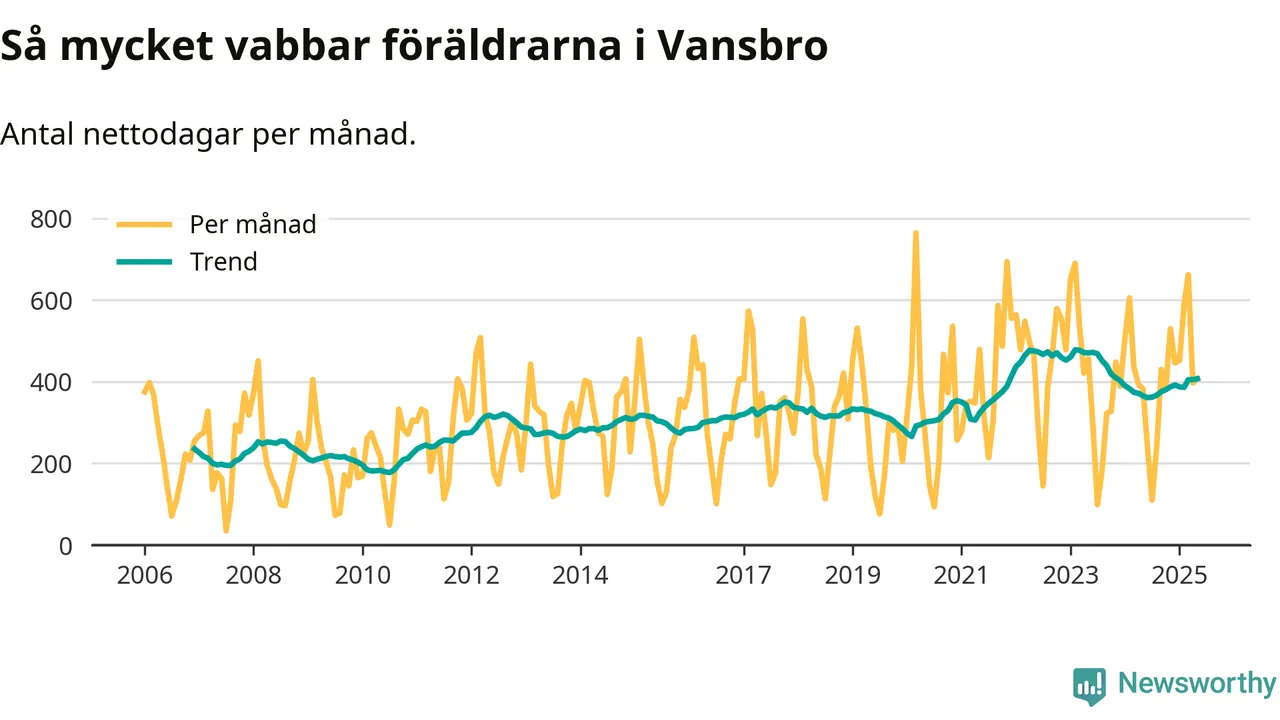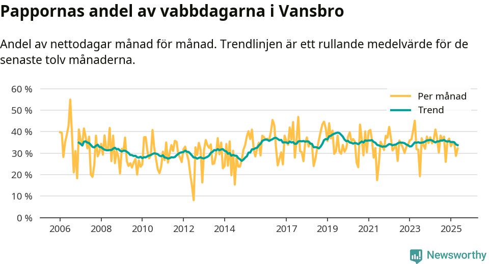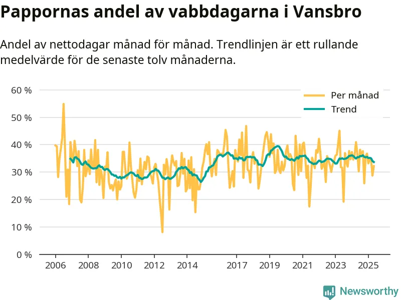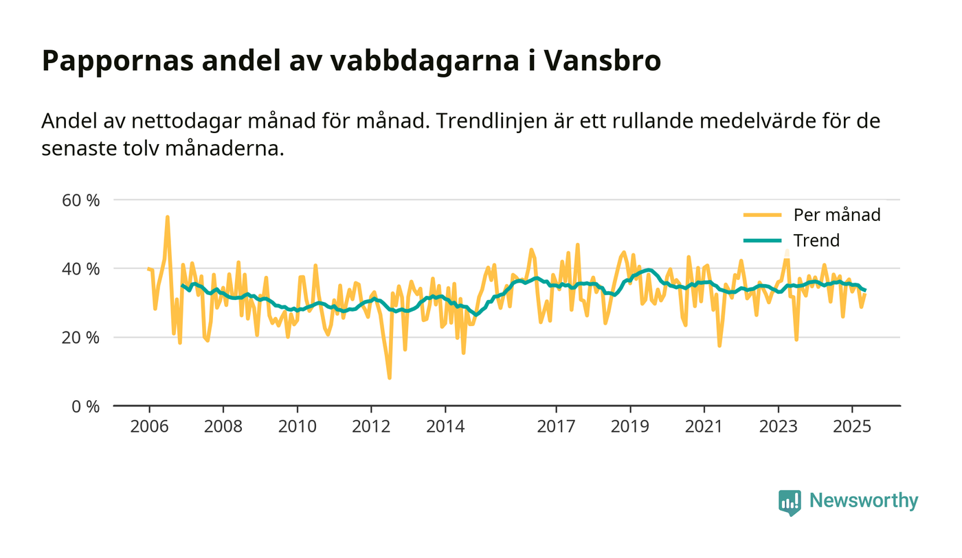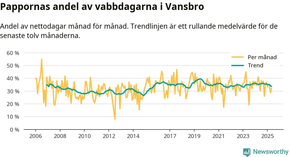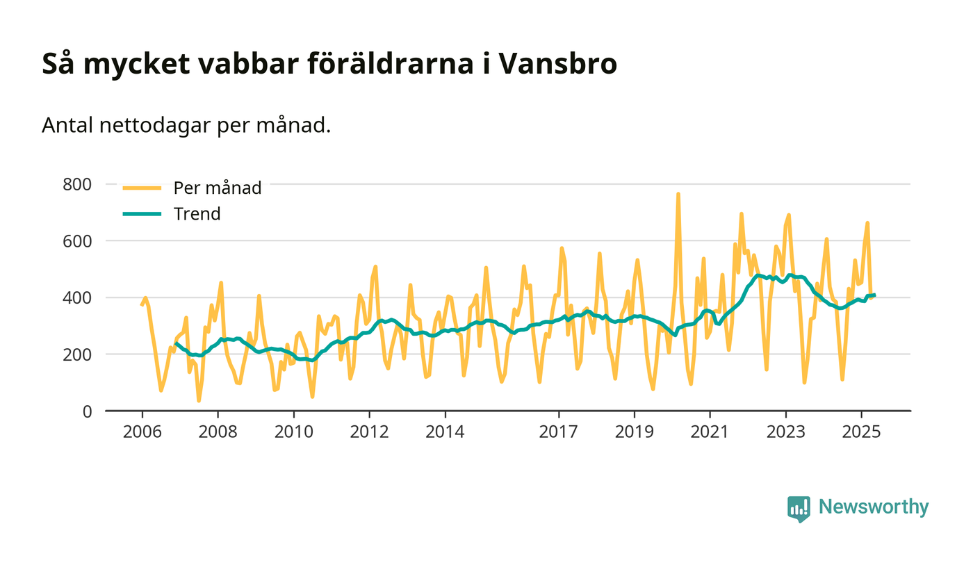 Vansbro ligger en bra bit från ett jämställt uttag. Under de senaste tolv månaderna har männen stått för 34 procent av all vabb i kommunen. Pappornas uttag peakade sommaren 2019 då kommunens fäder var uppe i 40 procent av vabbdagarna 1.