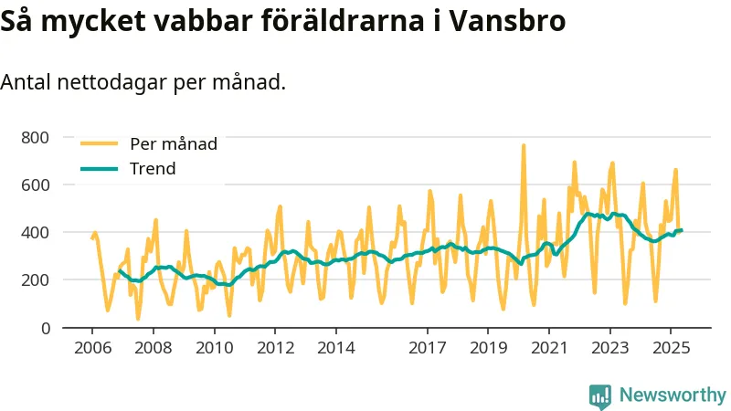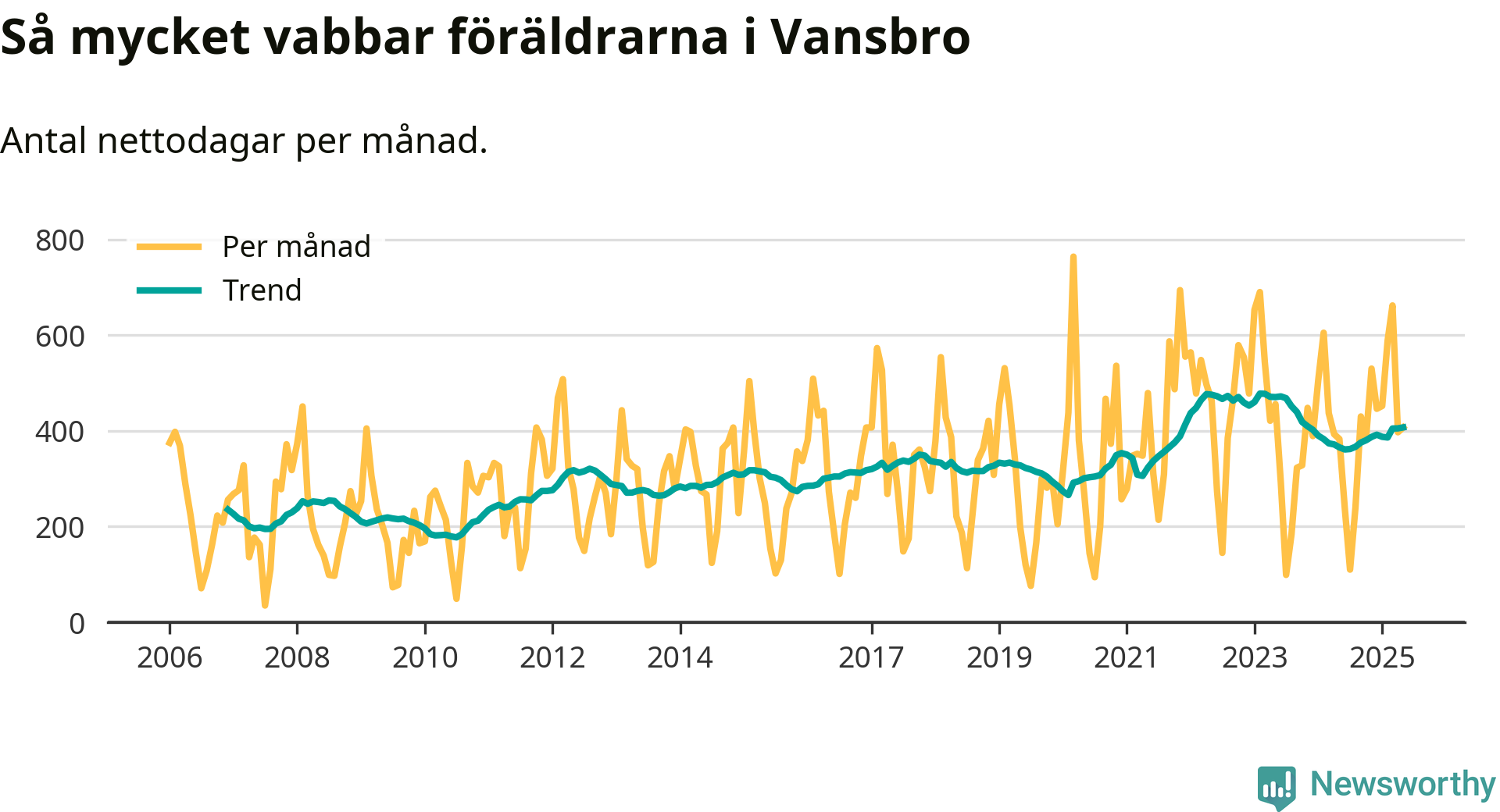 När coronapandemin drog in i mars 2020 peakade antalet vabbdagar både i Vansbro kommun och i riket som helhet. Under de senaste två åren har vabbuttaget börjat minska igen.
