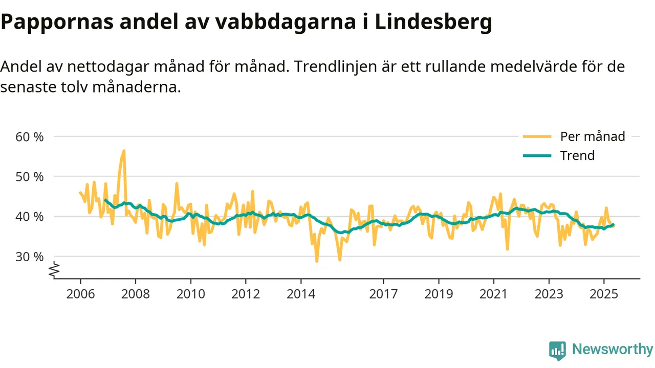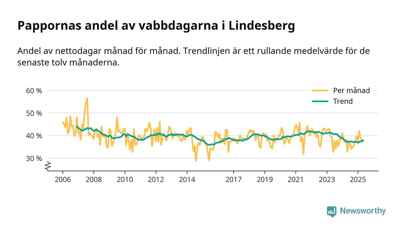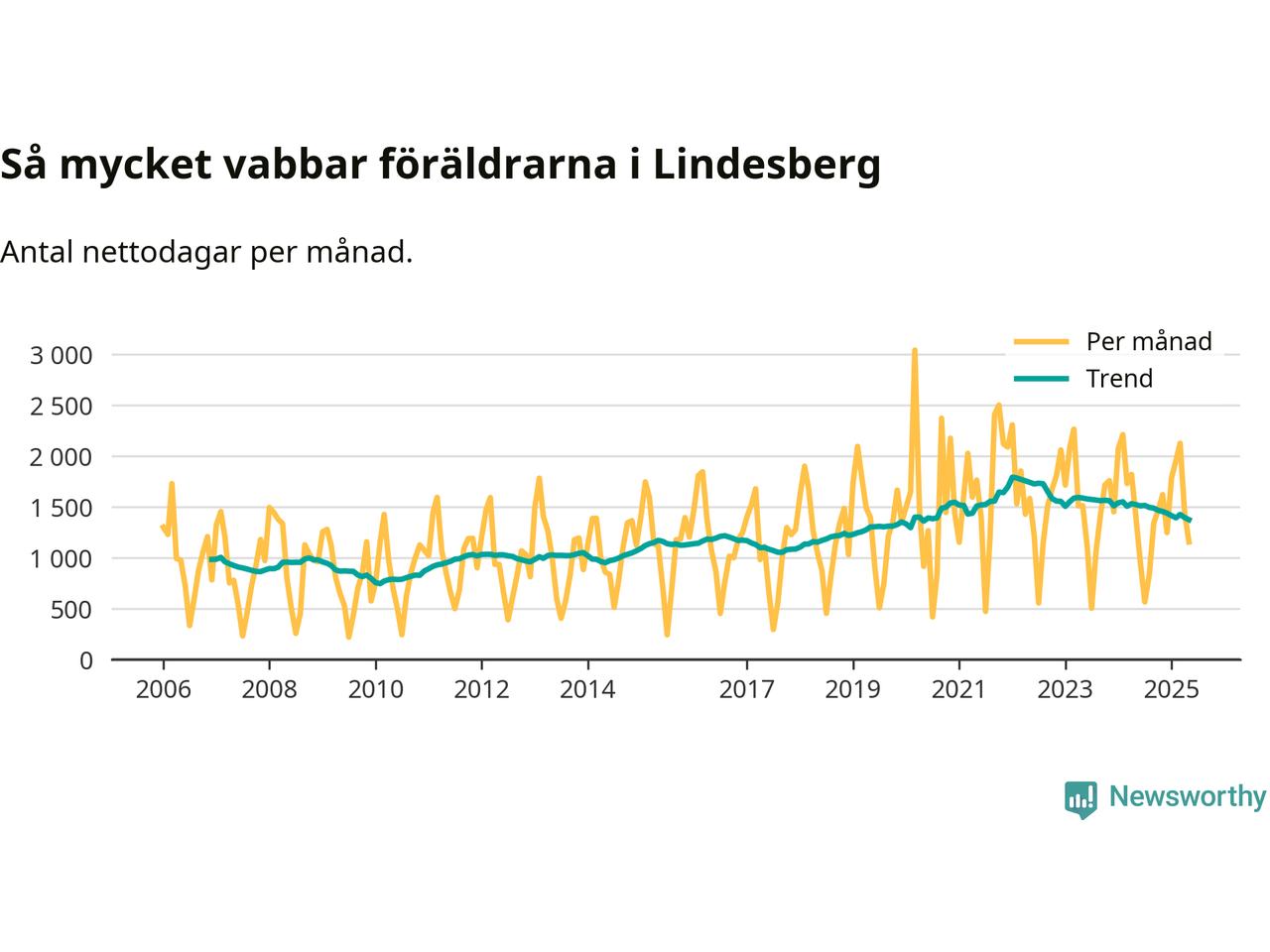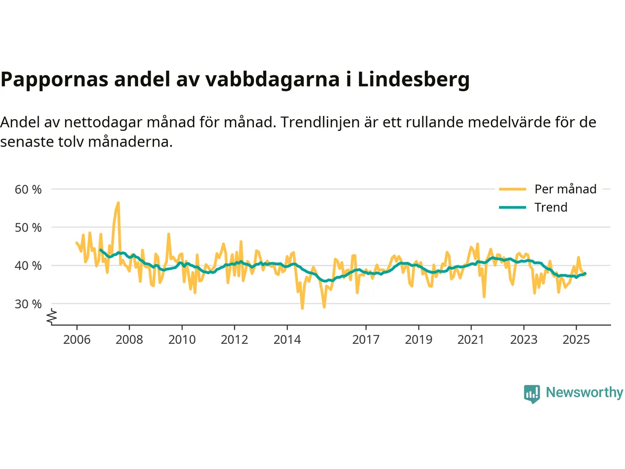 Lindesberg ligger en bit från ett jämställt uttag. Under de senaste tolv månaderna har männen stått för 38 procent av all vabb i kommunen. Pappornas uttag peakade vintern 2006 då kommunens fäder var uppe i 44 procent av vabbdagarna 1.
