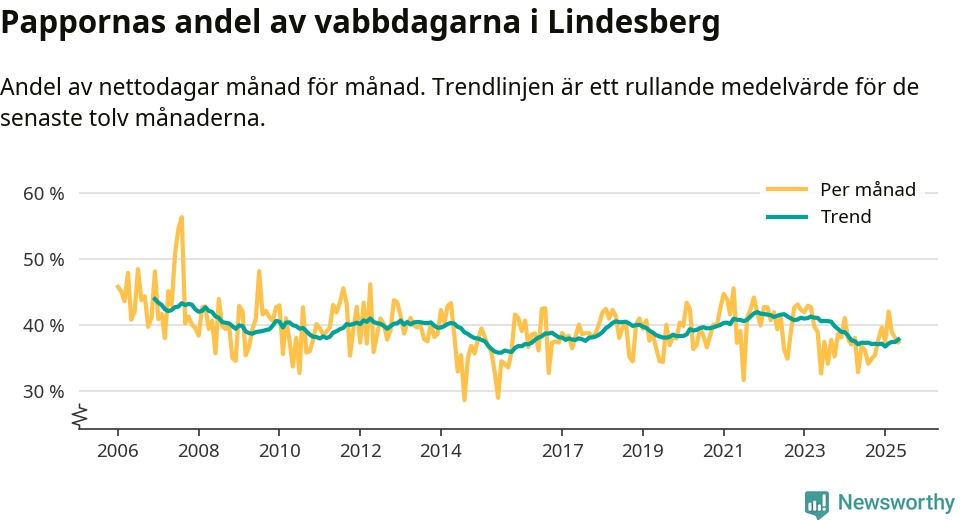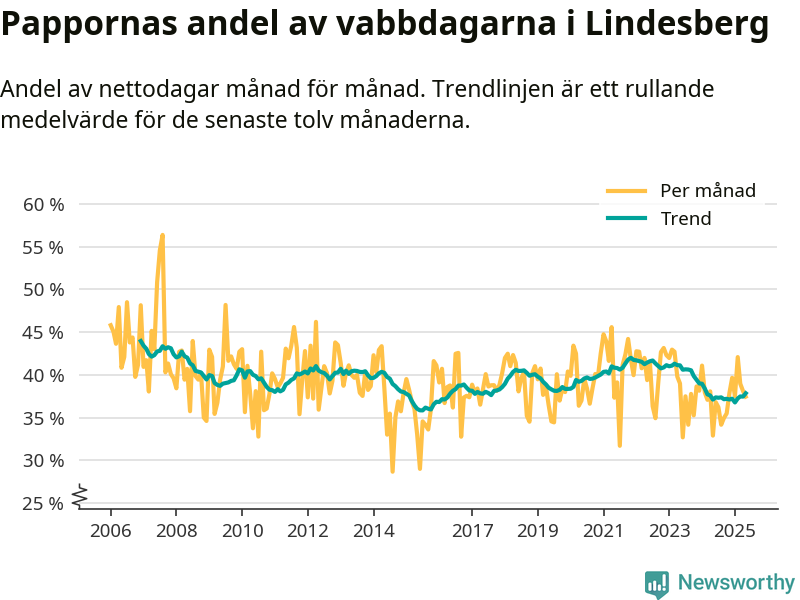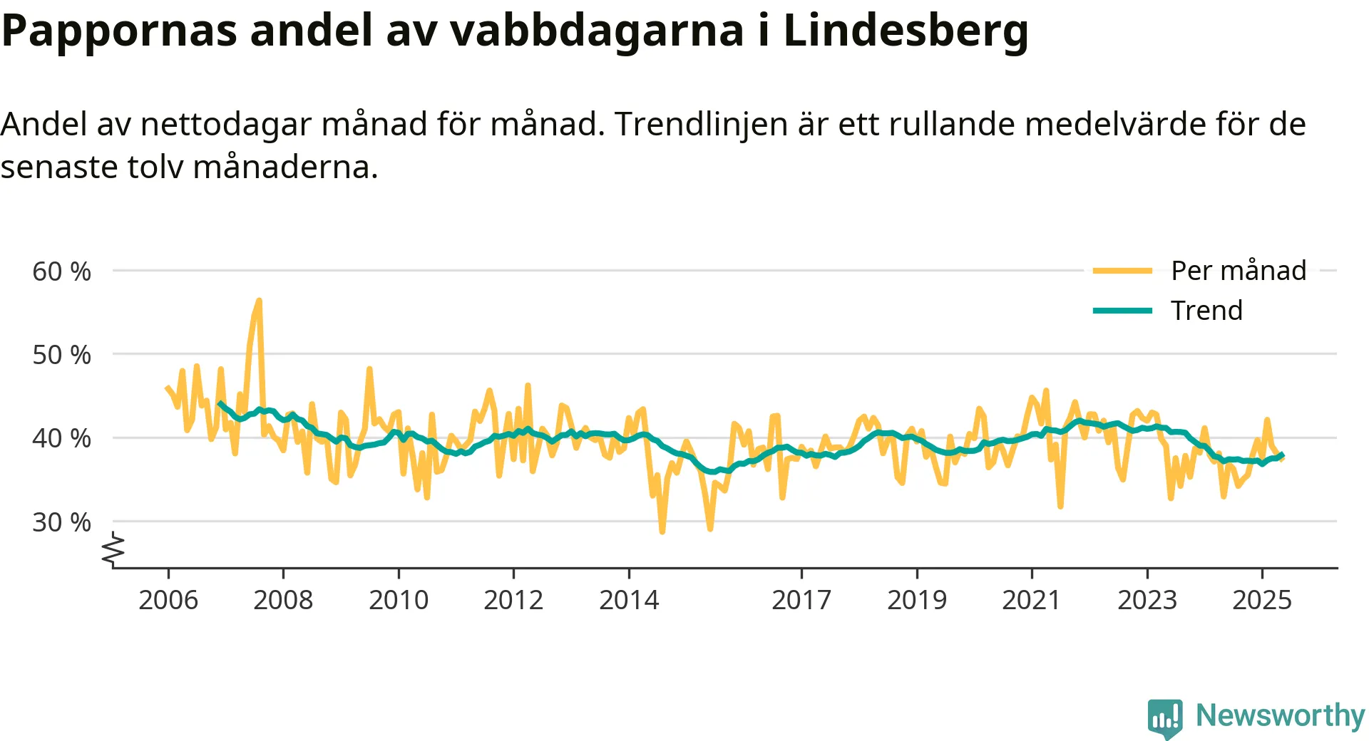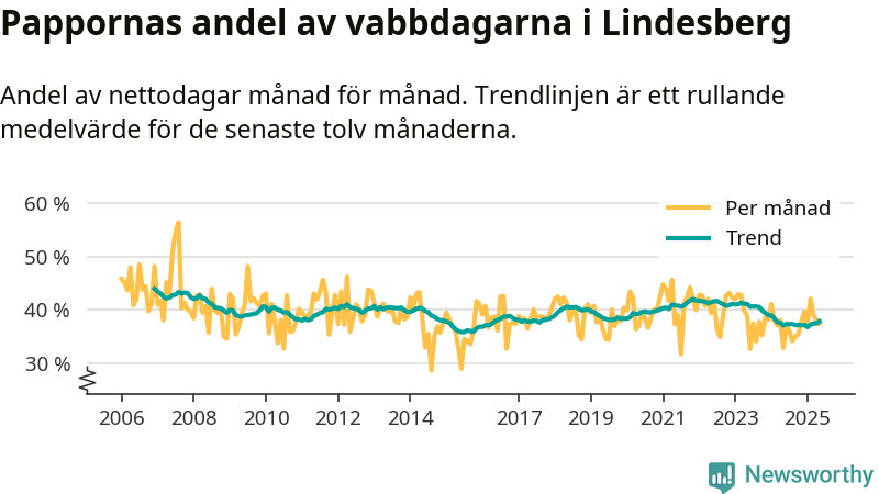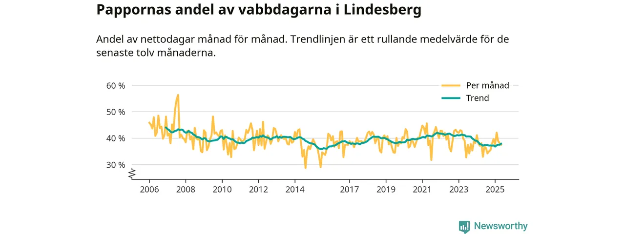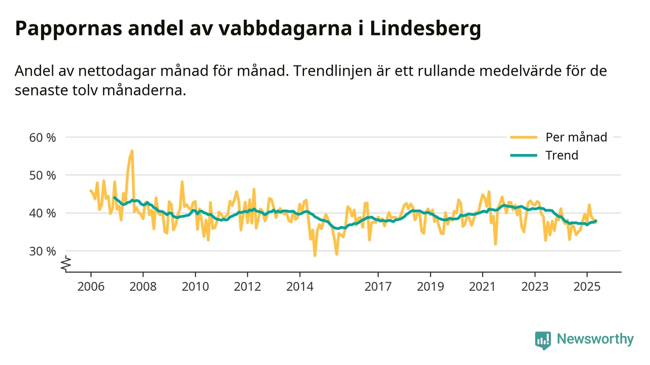 Lindesberg ligger en bit från ett jämställt uttag. Under de senaste tolv månaderna har männen stått för 38 procent av all vabb i kommunen. Pappornas uttag peakade vintern 2006 då kommunens fäder var uppe i 44 procent av vabbdagarna 1.