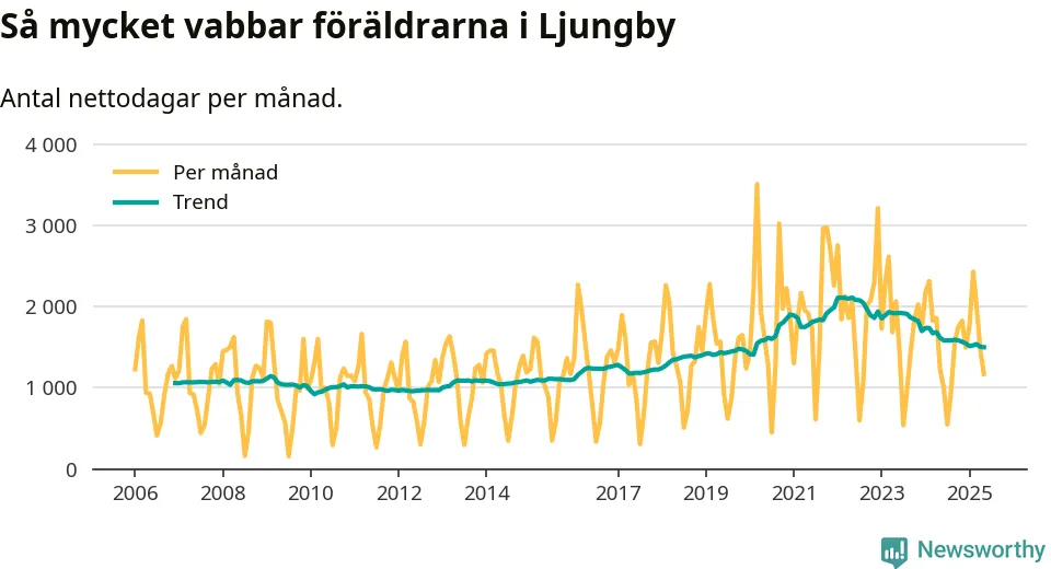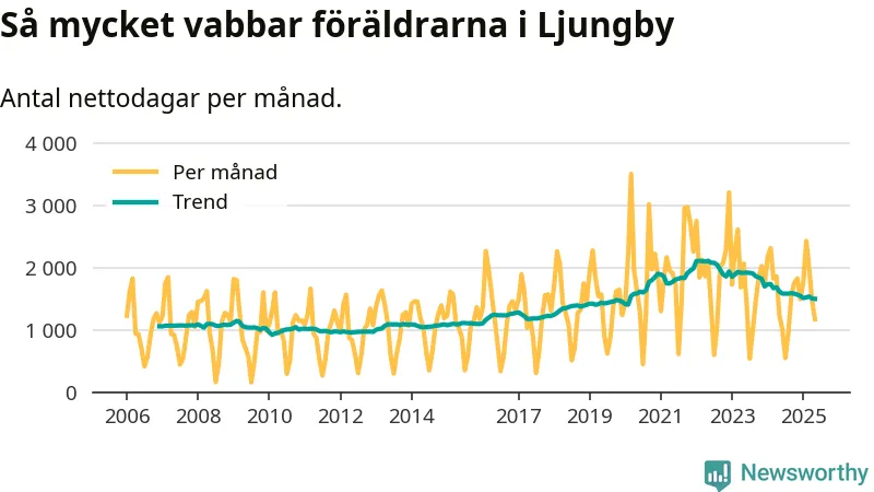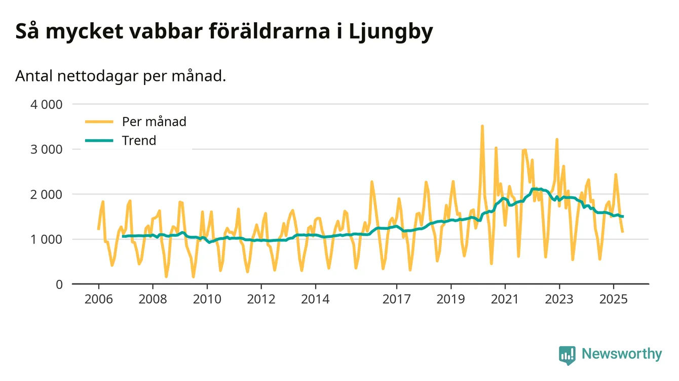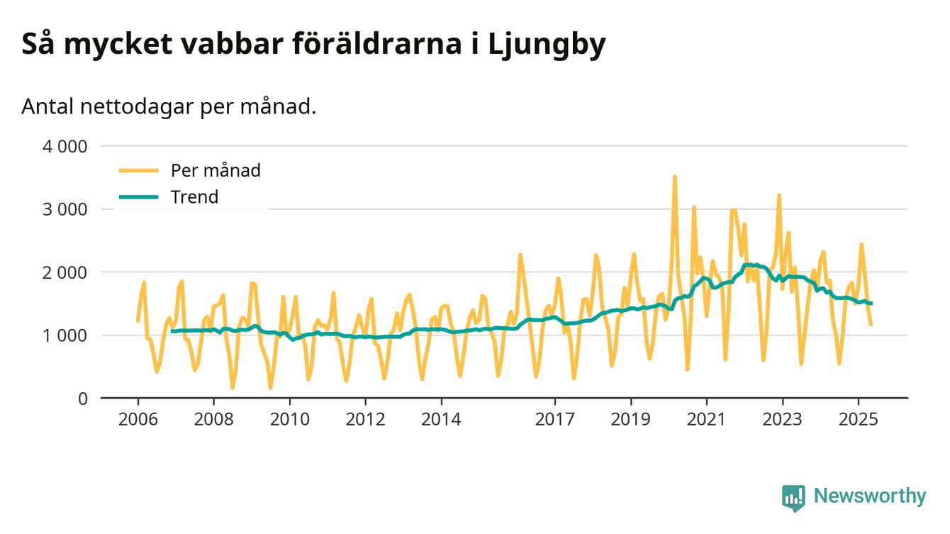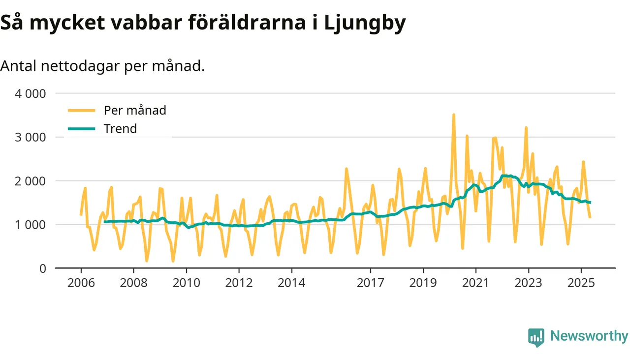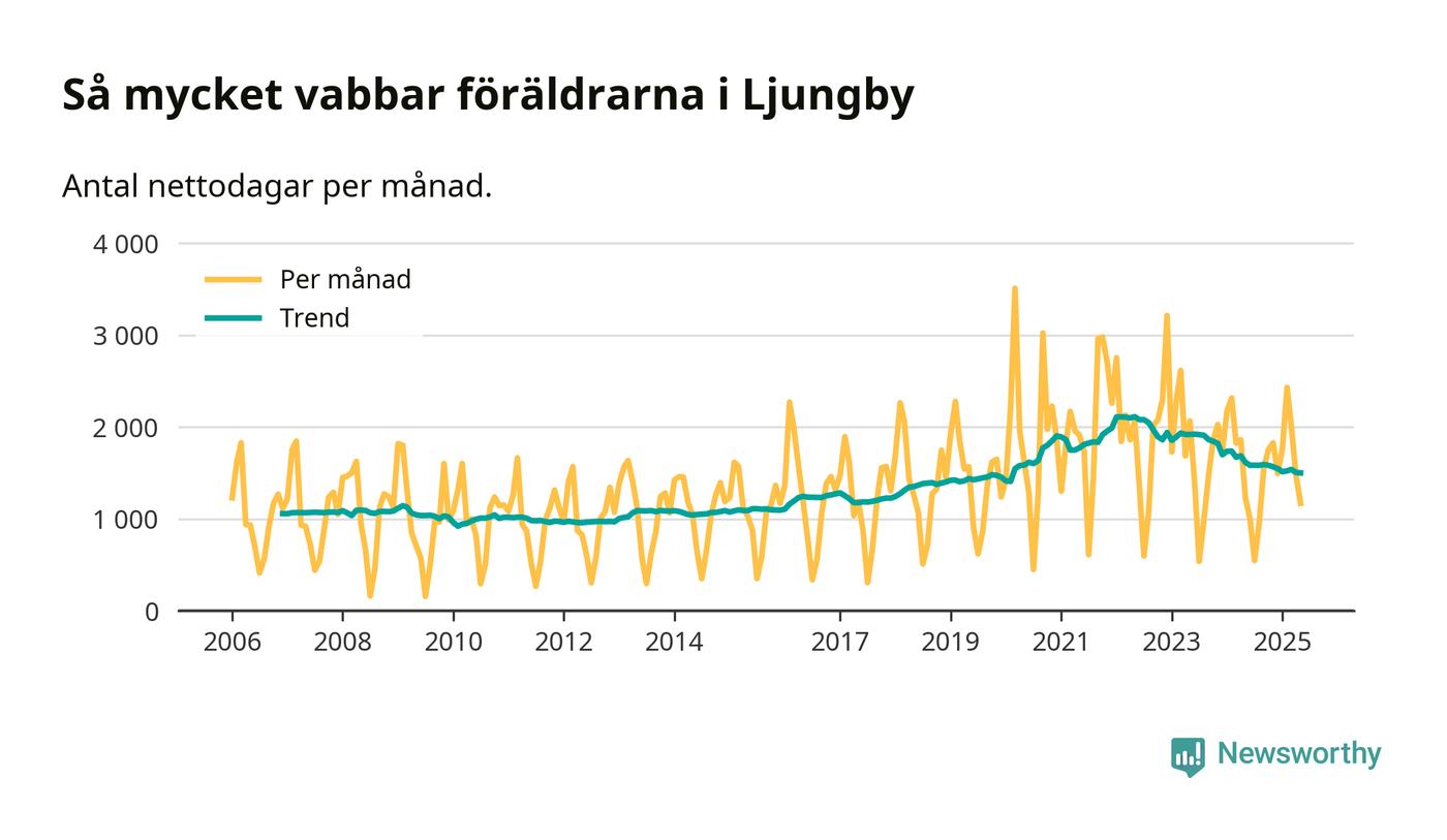 När coronapandemin drog in i mars 2020 peakade antalet vabbdagar både i Ljungby kommun och i riket som helhet. Under de senaste två åren har vabbuttaget börjat minska igen.