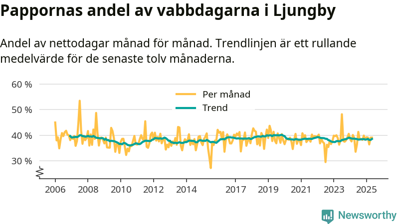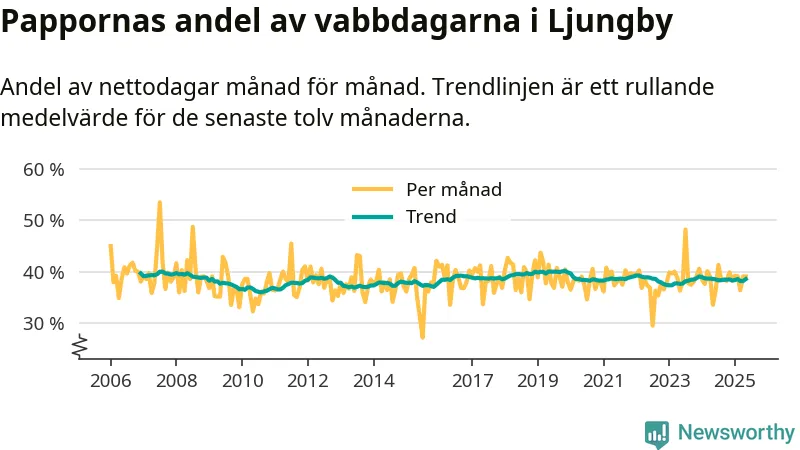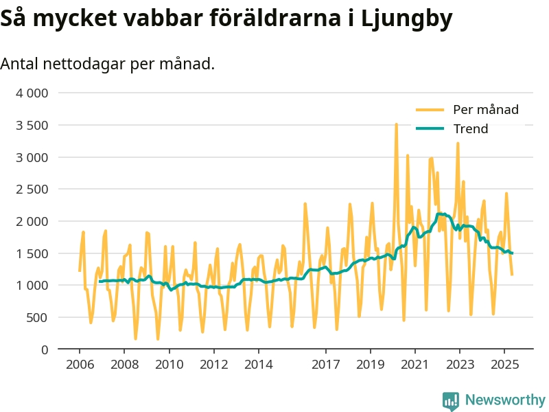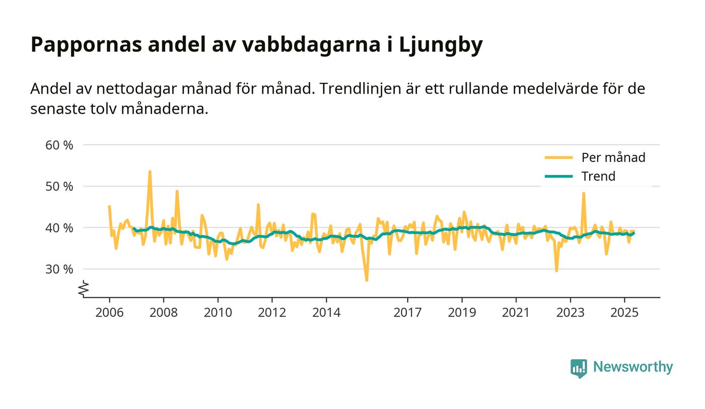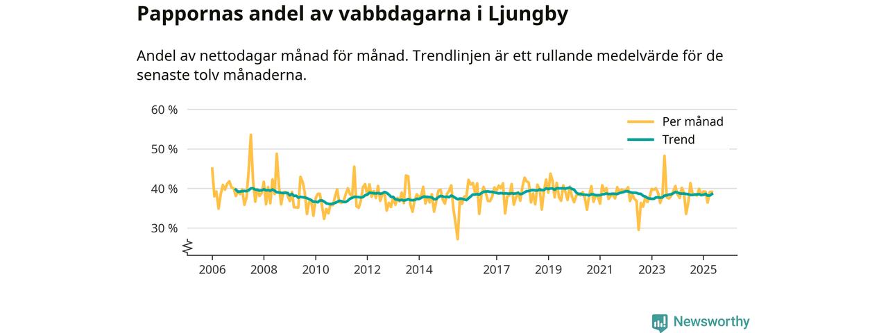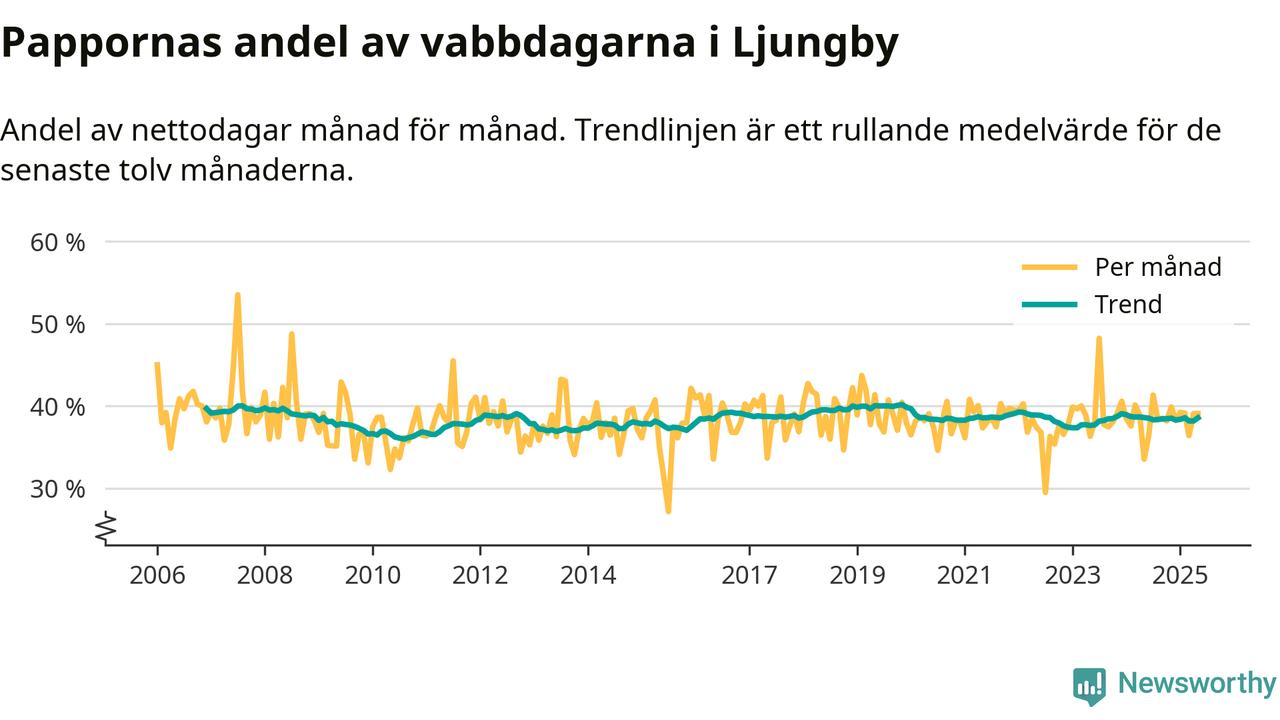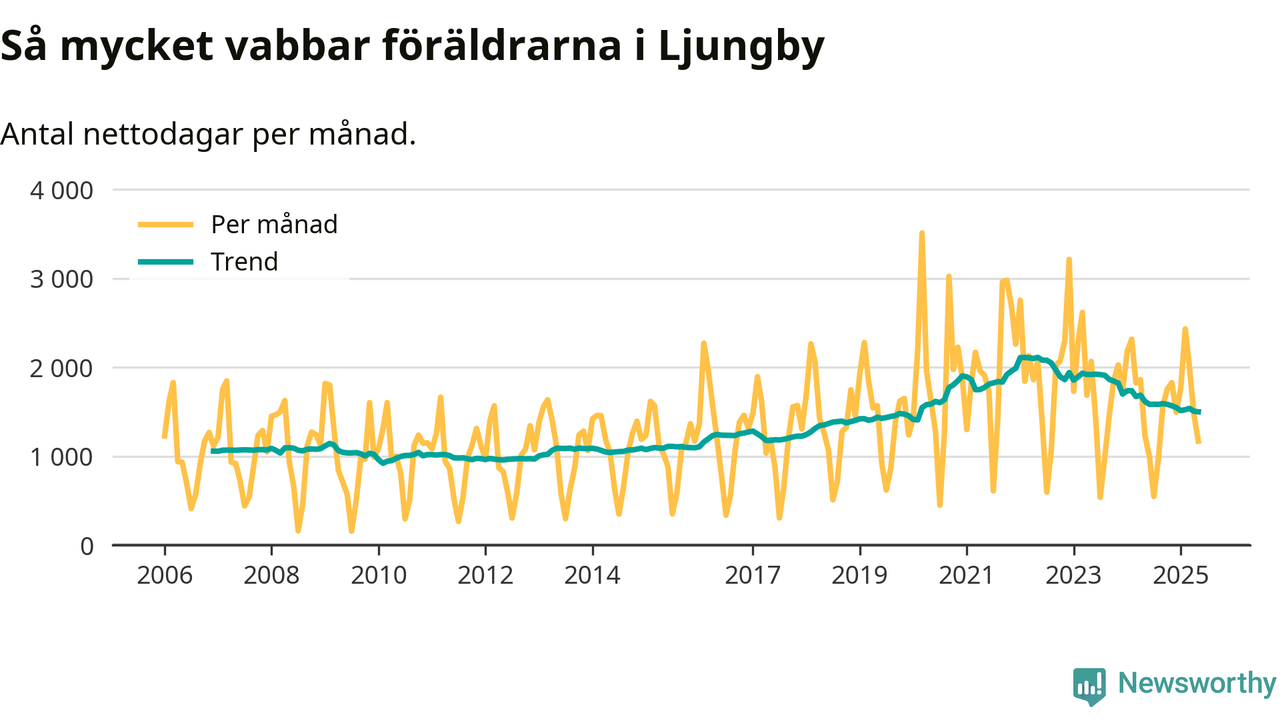 När coronapandemin drog in i mars 2020 peakade antalet vabbdagar både i Ljungby kommun och i riket som helhet. Under de senaste två åren har vabbuttaget börjat minska igen.