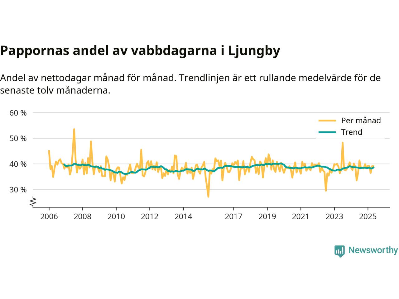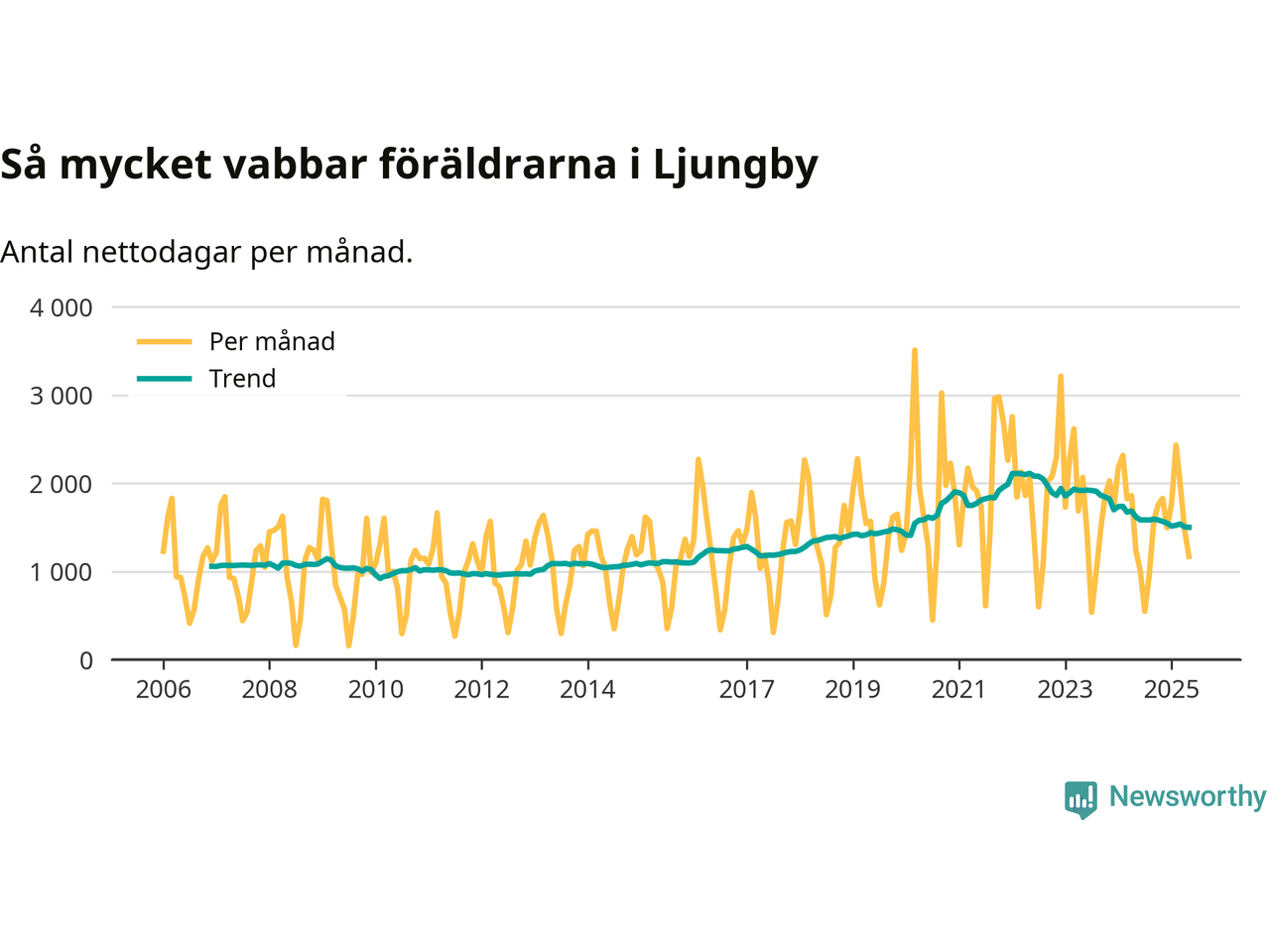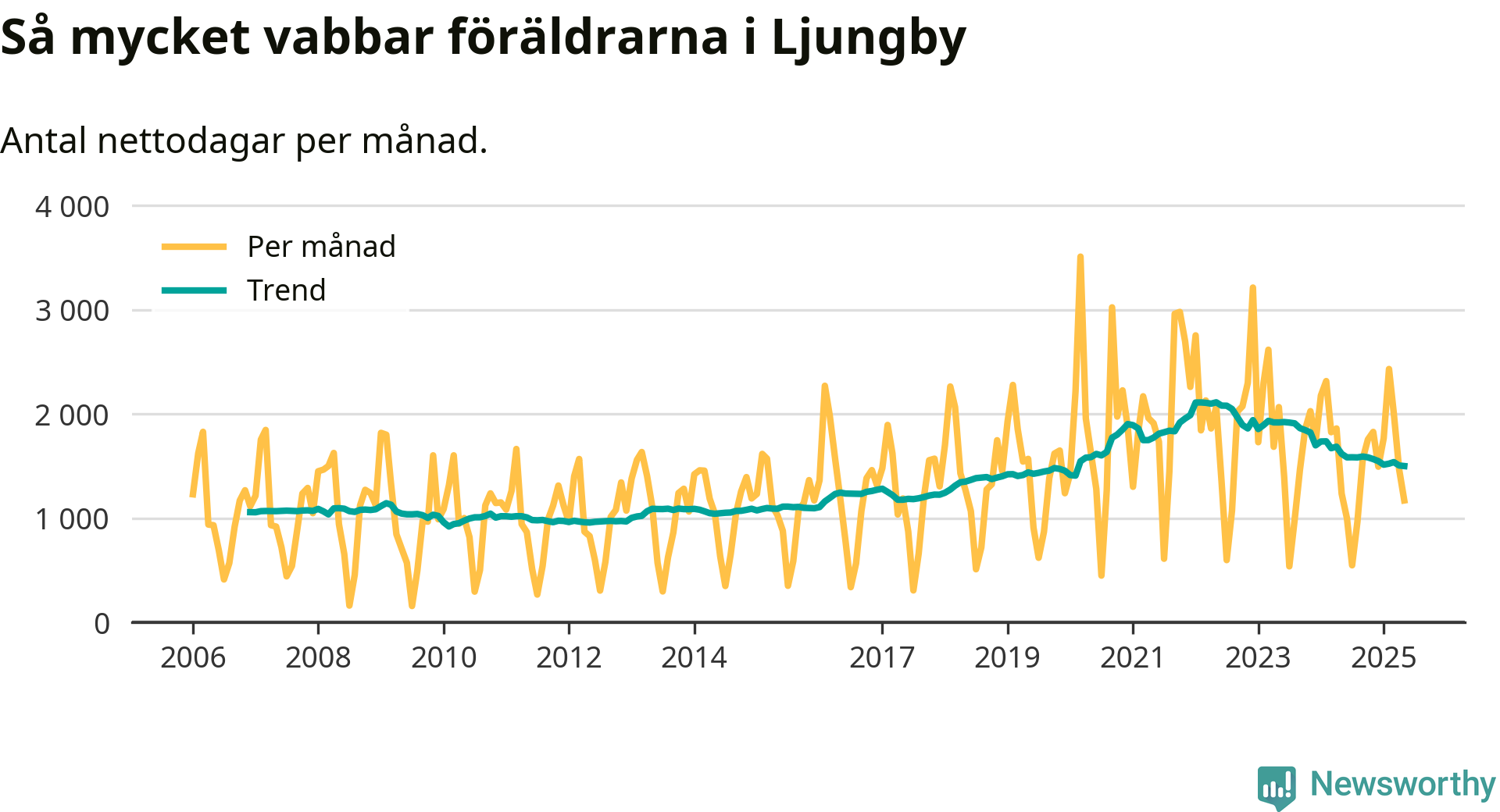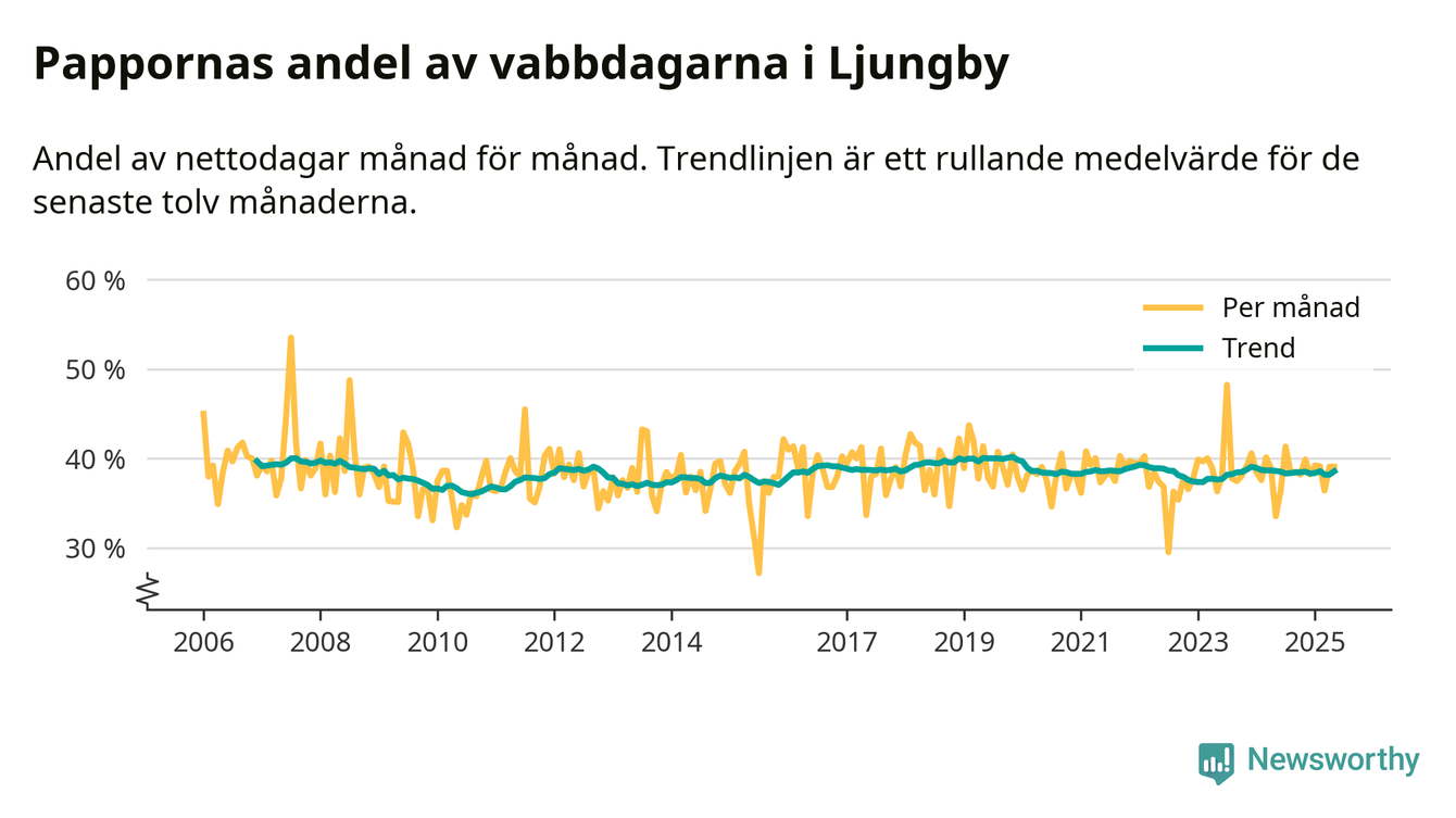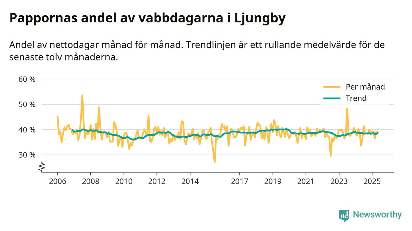 När coronapandemin drog in i mars 2020 peakade antalet vabbdagar både i Ljungby kommun och i riket som helhet. Under de senaste två åren har vabbuttaget börjat minska igen.