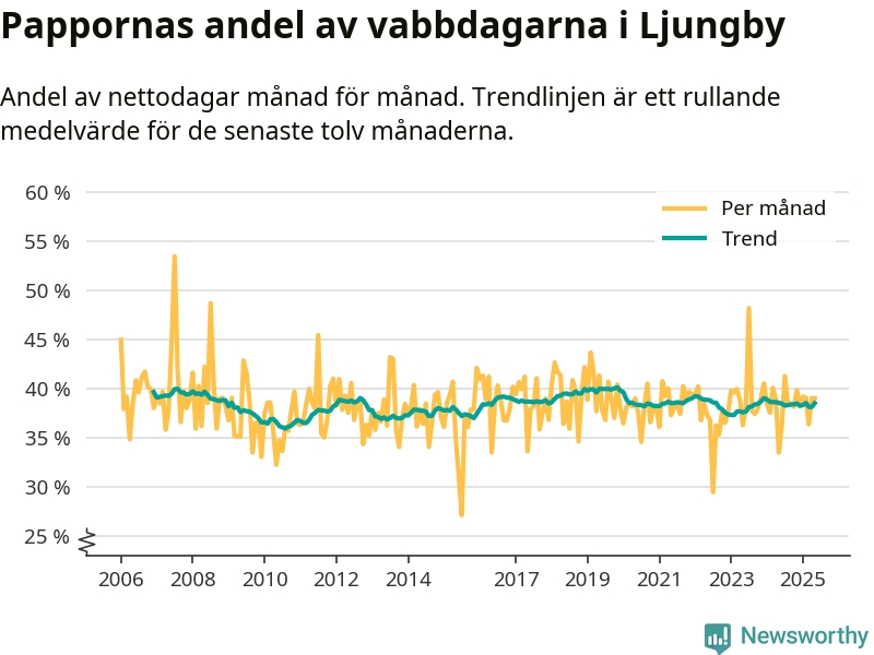 Pappor i Ljungby vabbar ungefär som rikssnittet och som andra män i Kronobergs län. Andelen är näst minst i länet. Skillnaderna inom landet är stora. Dorotea är den enda kommun i landet som når 50–50-fördelning.