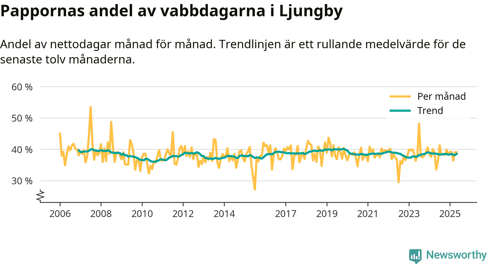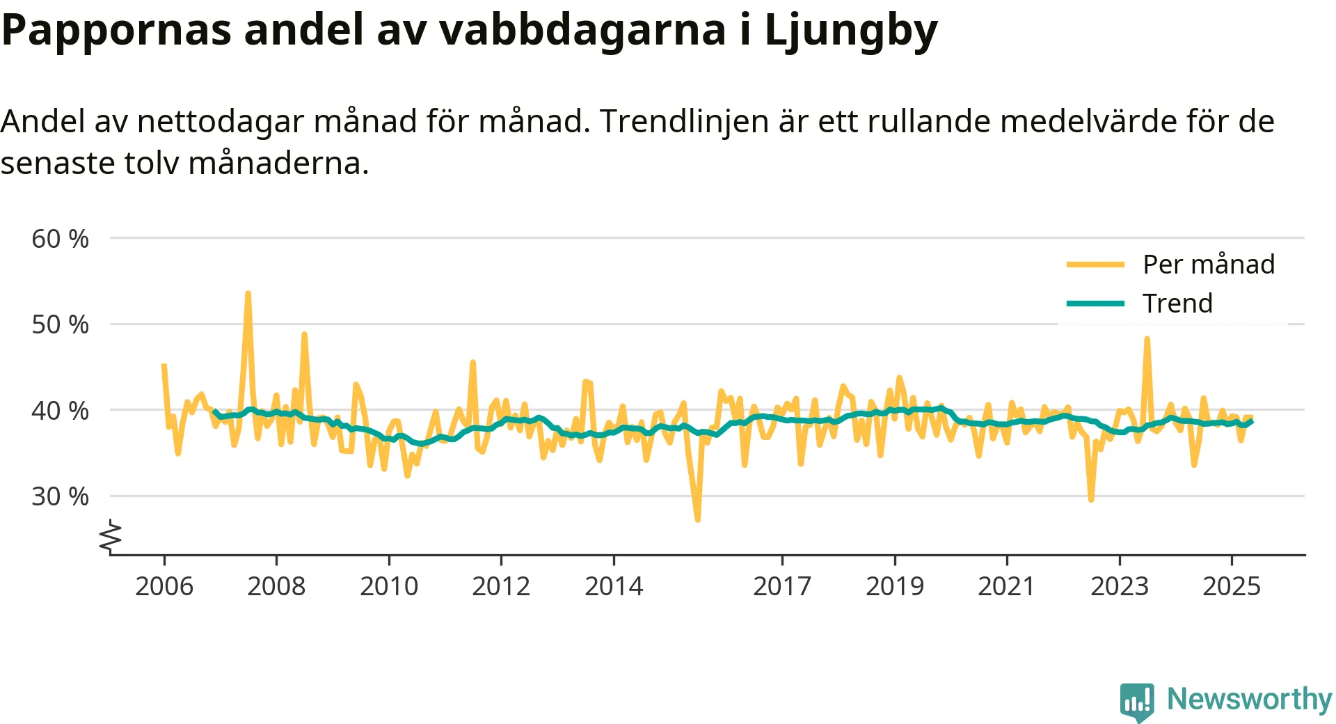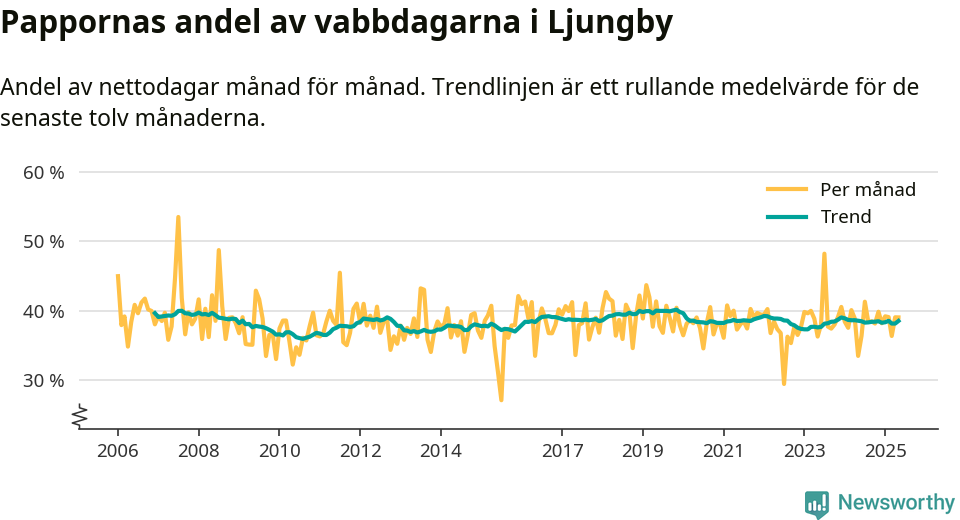 Ljungby ligger en bit från ett jämställt uttag. Under de senaste tolv månaderna har männen stått för 39 procent av all vabb i kommunen.