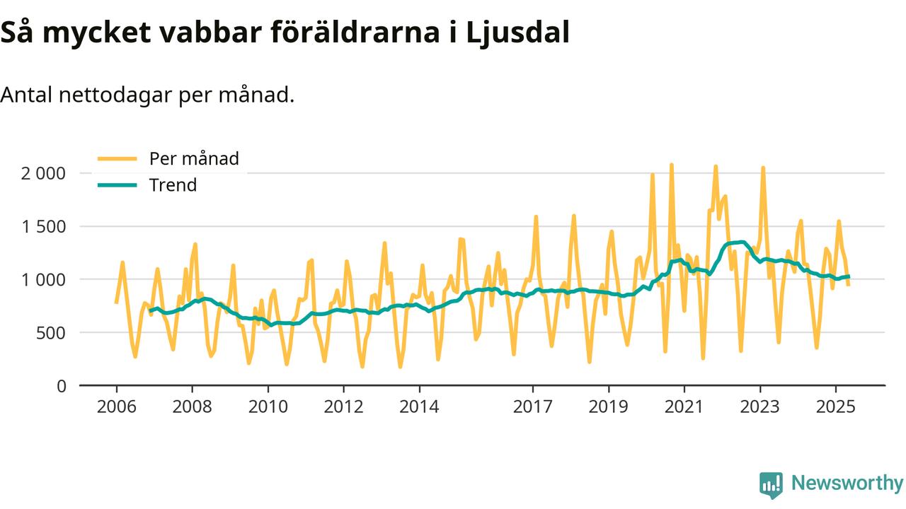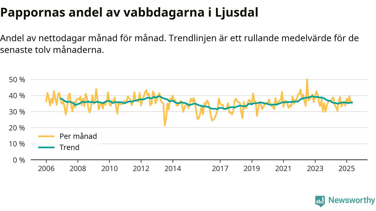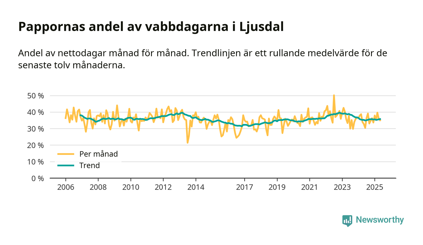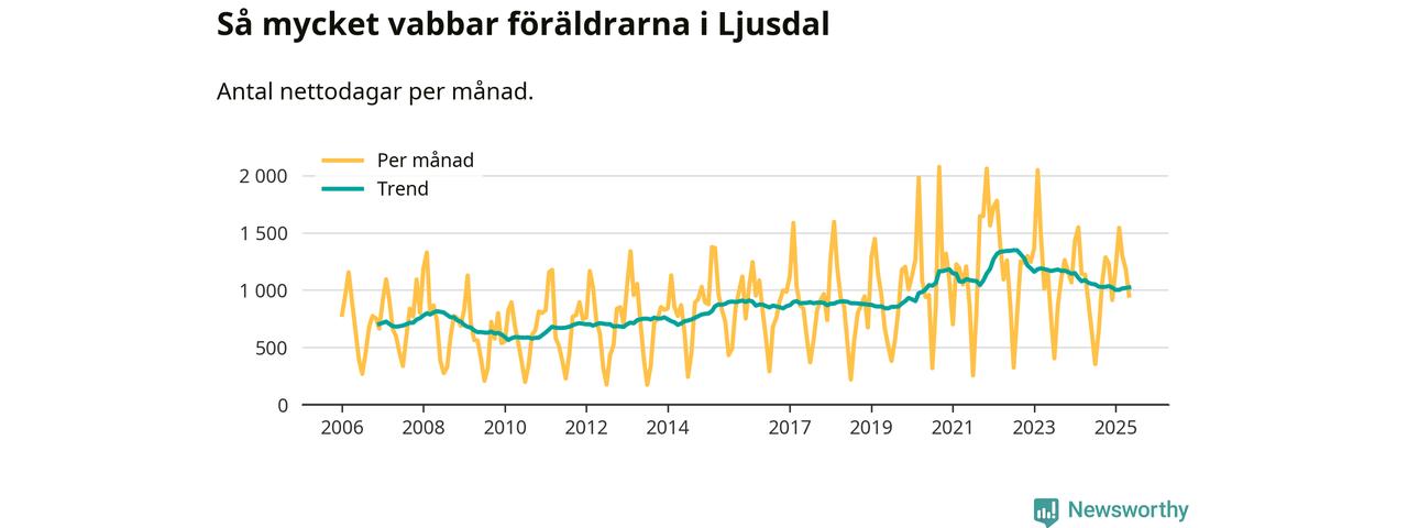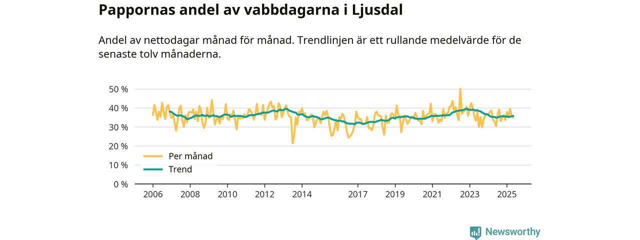 Ljusdal ligger en bit från ett jämställt uttag. Under de senaste tolv månaderna har männen stått för 36 procent av all vabb i kommunen. Pappornas uttag peakade hösten 2022 då kommunens fäder var uppe i 40 procent av vabbdagarna 1.