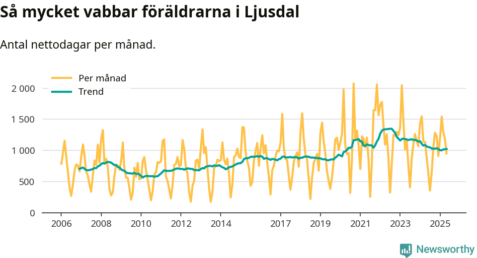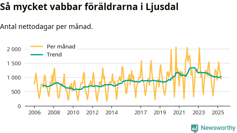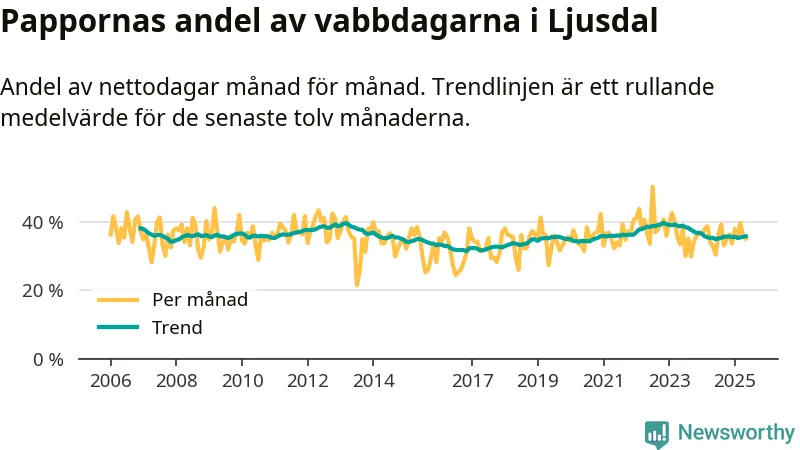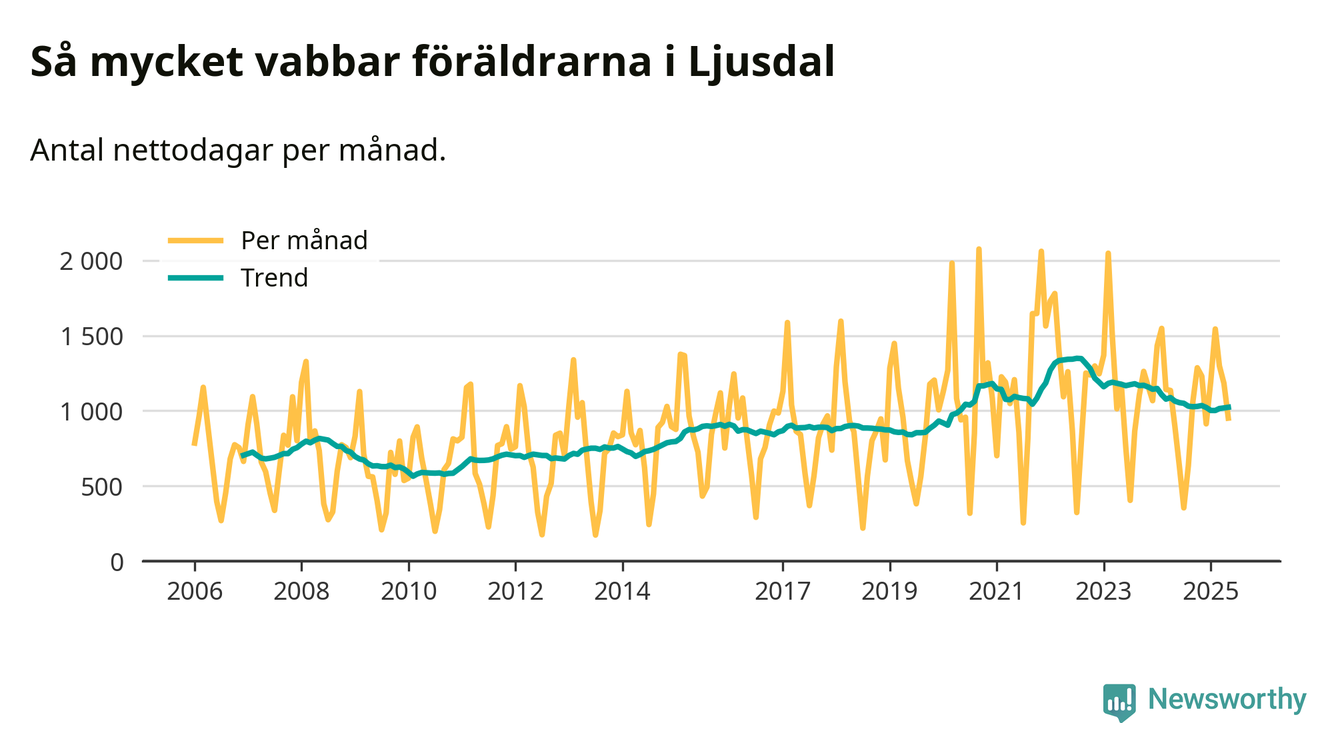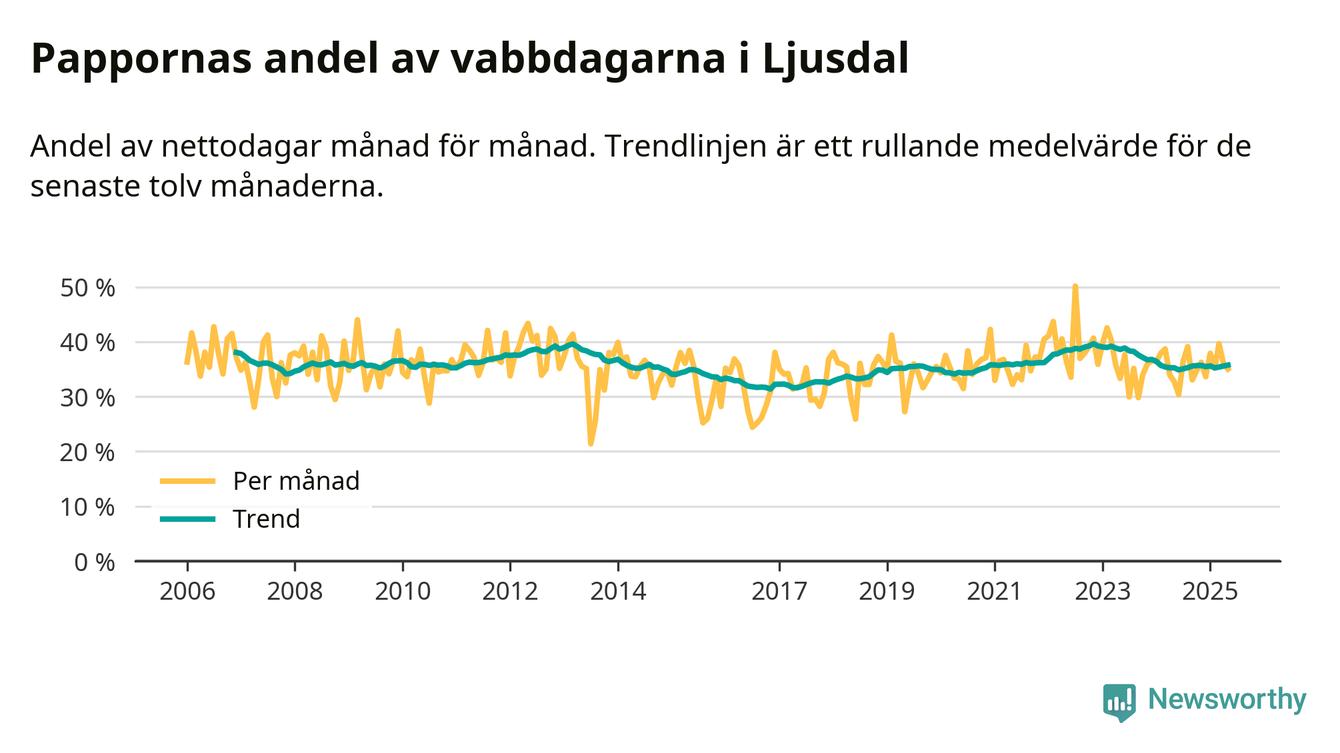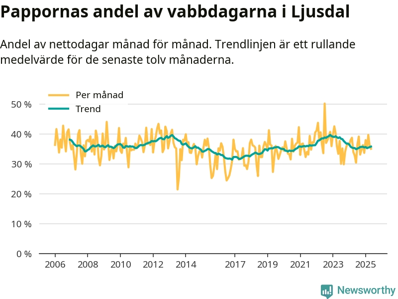 Ljusdal ligger en bit från ett jämställt uttag. Under de senaste tolv månaderna har männen stått för 36 procent av all vabb i kommunen. Pappornas uttag peakade hösten 2022 då kommunens fäder var uppe i 40 procent av vabbdagarna 1.