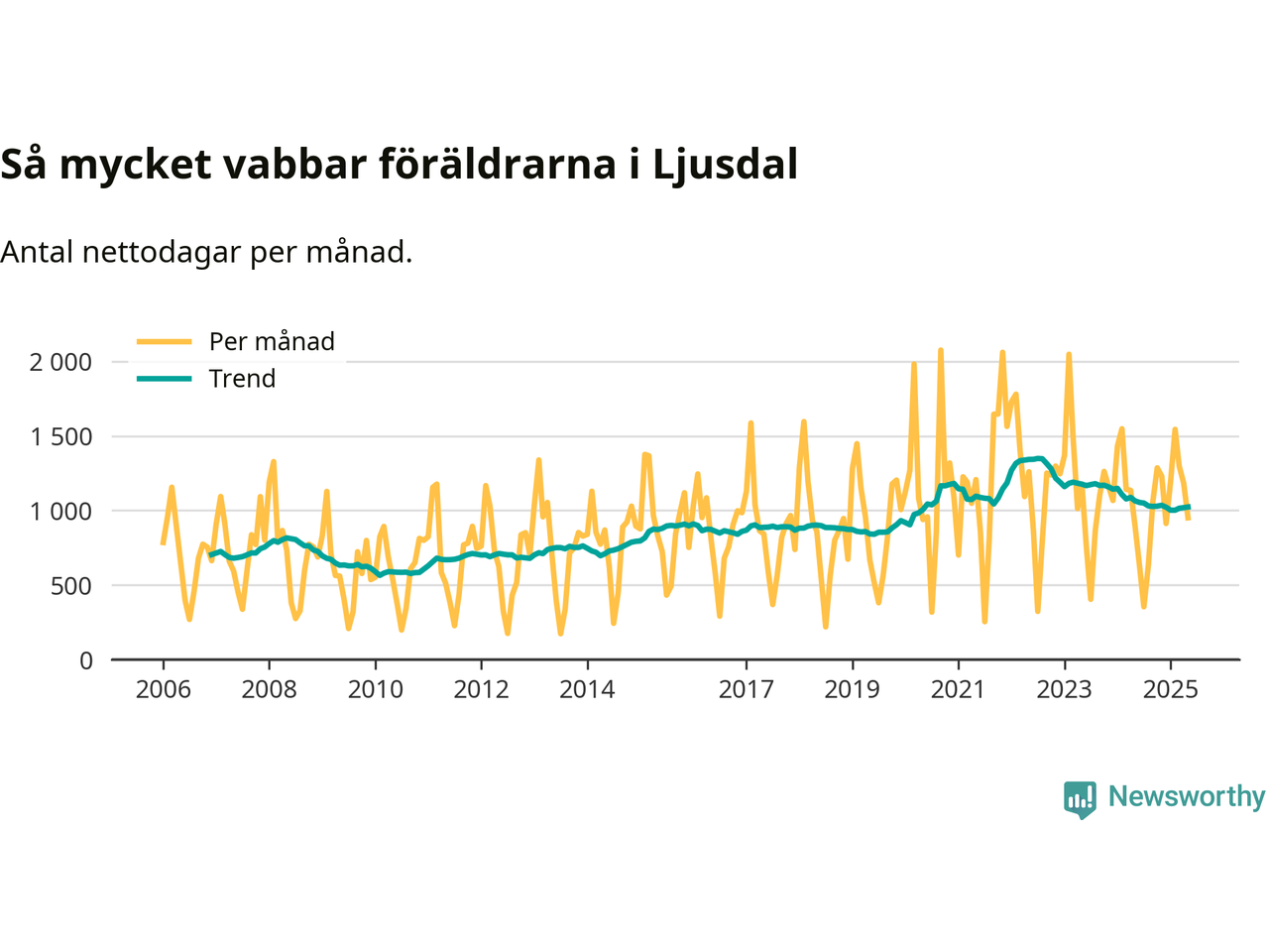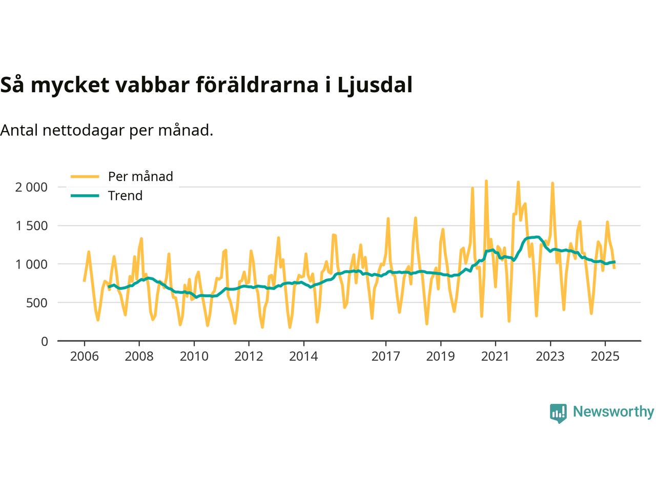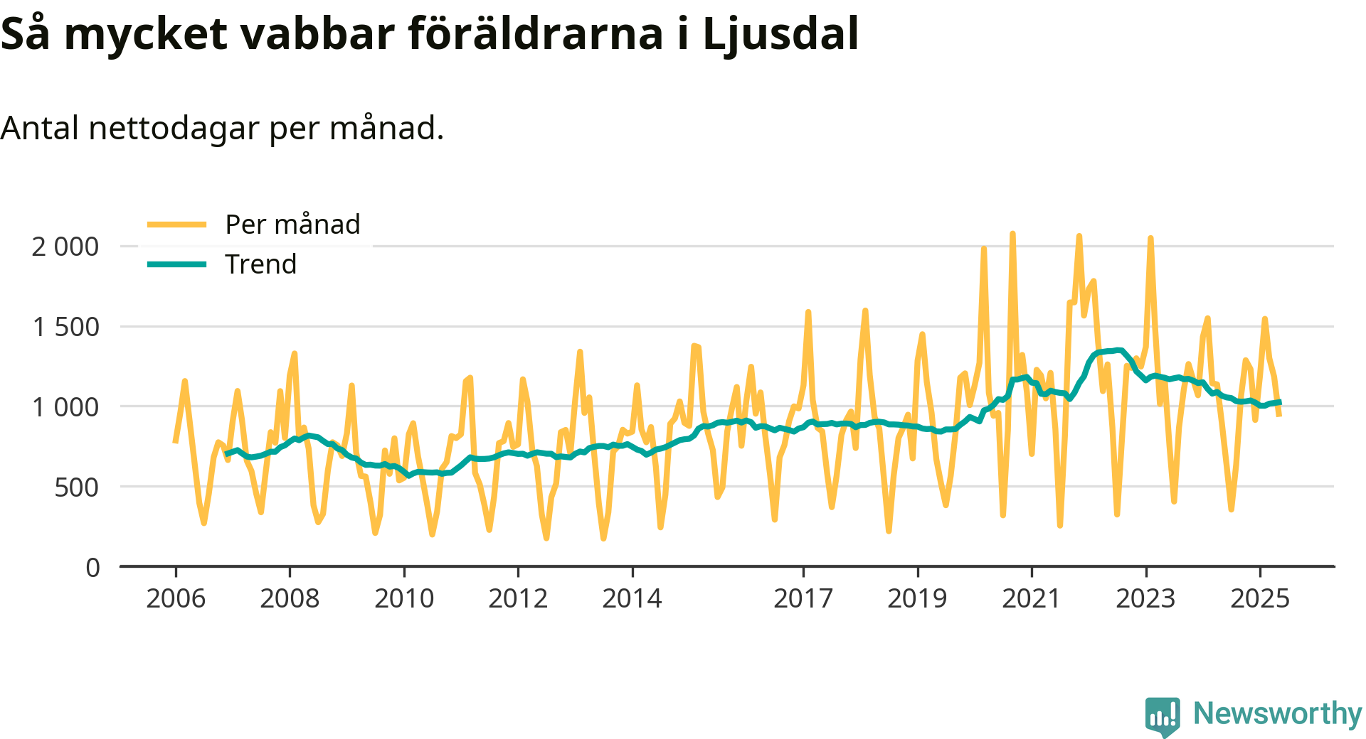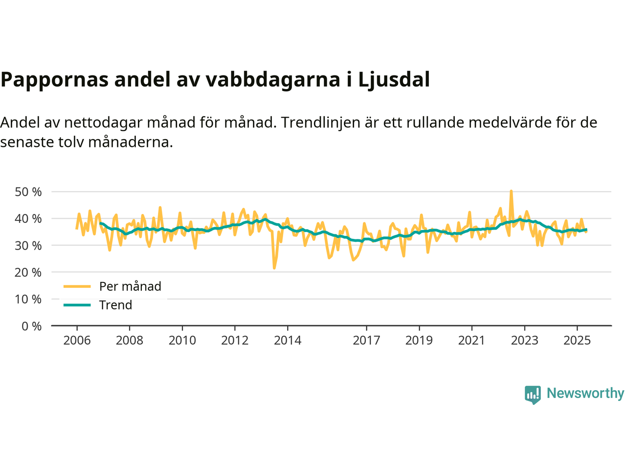 Ljusdal ligger en bit från ett jämställt uttag. Under de senaste tolv månaderna har männen stått för 36 procent av all vabb i kommunen. Pappornas uttag peakade hösten 2022 då kommunens fäder var uppe i 40 procent av vabbdagarna 1.