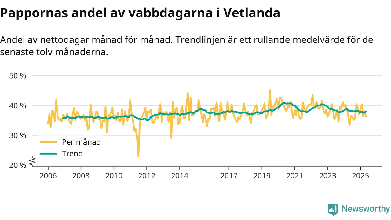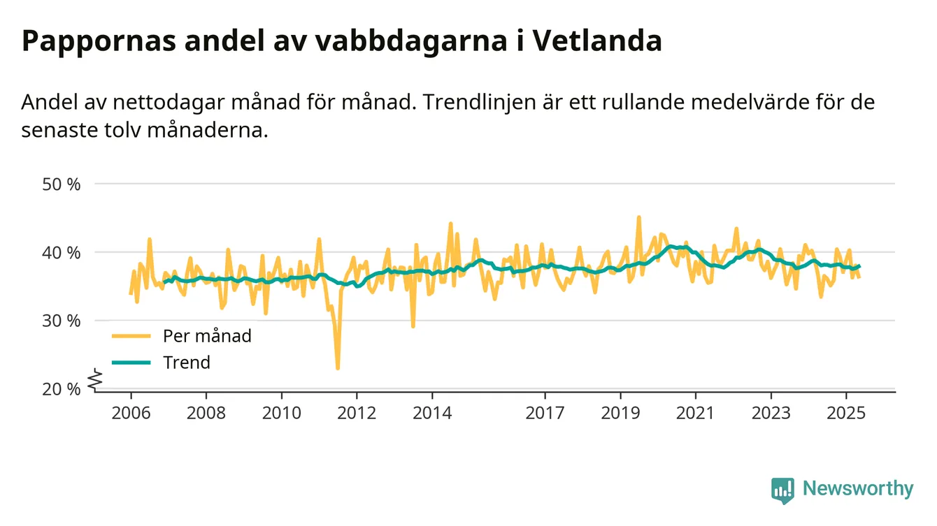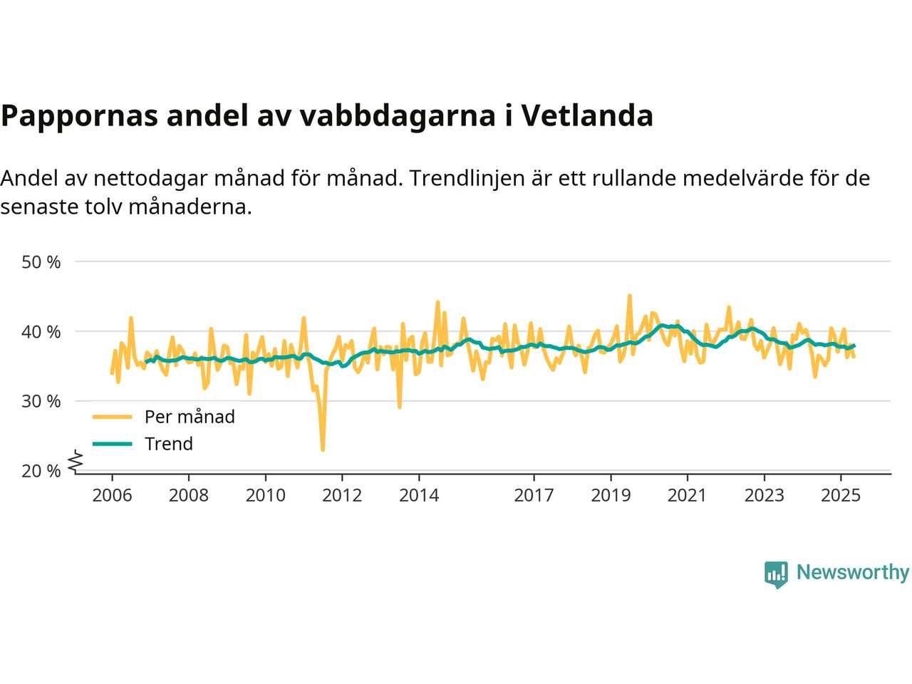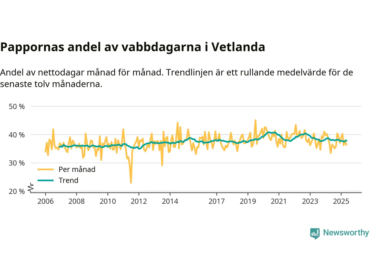 Vetlanda ligger en bit från ett jämställt uttag. Under de senaste tolv månaderna har männen stått för 38 procent av all vabb i kommunen. Pappornas uttag peakade våren 2020 då kommunens fäder var uppe i 41 procent av vabbdagarna 1.