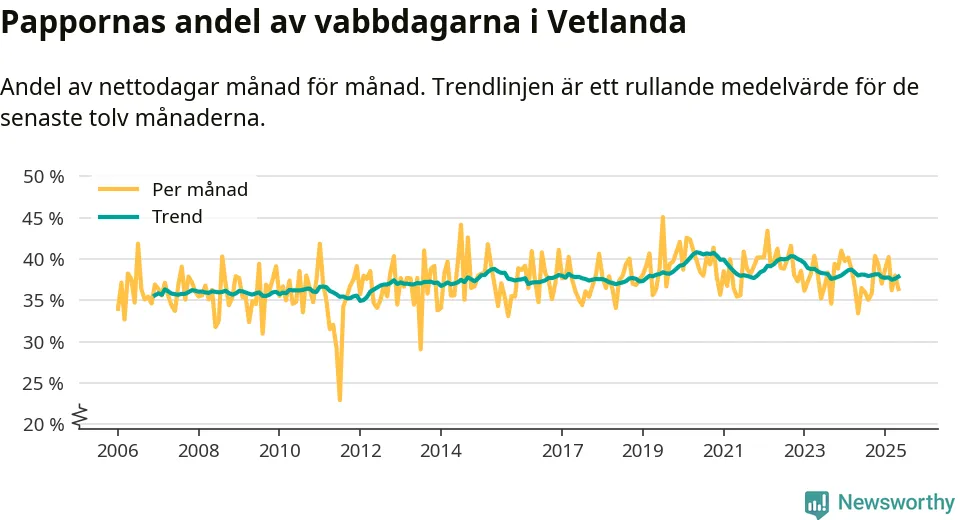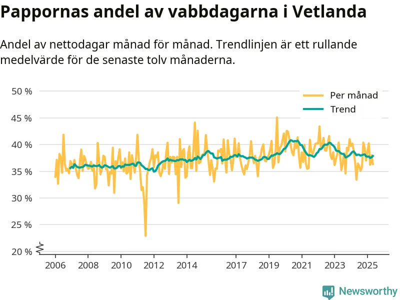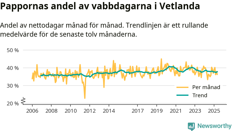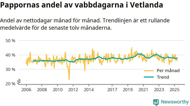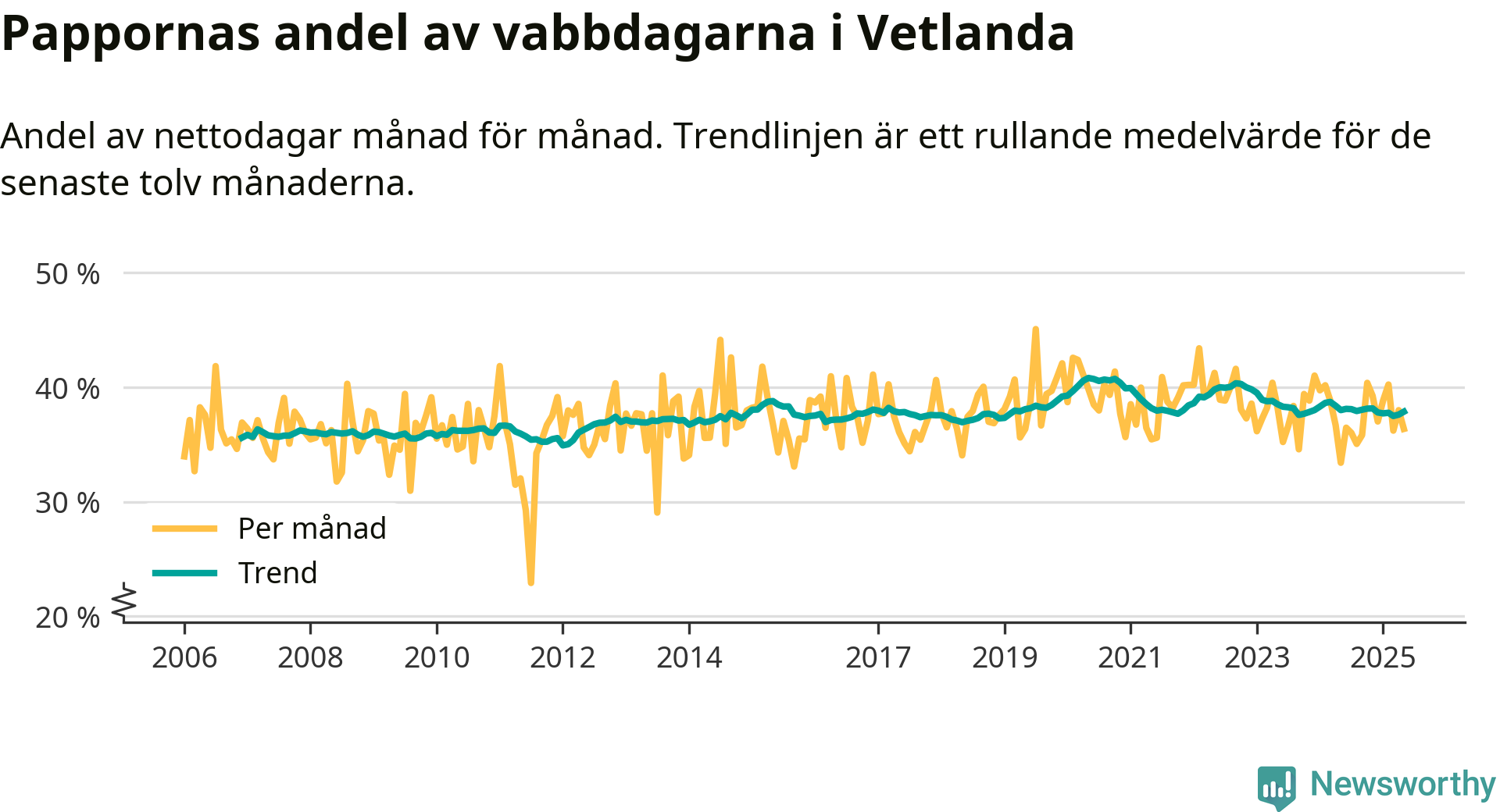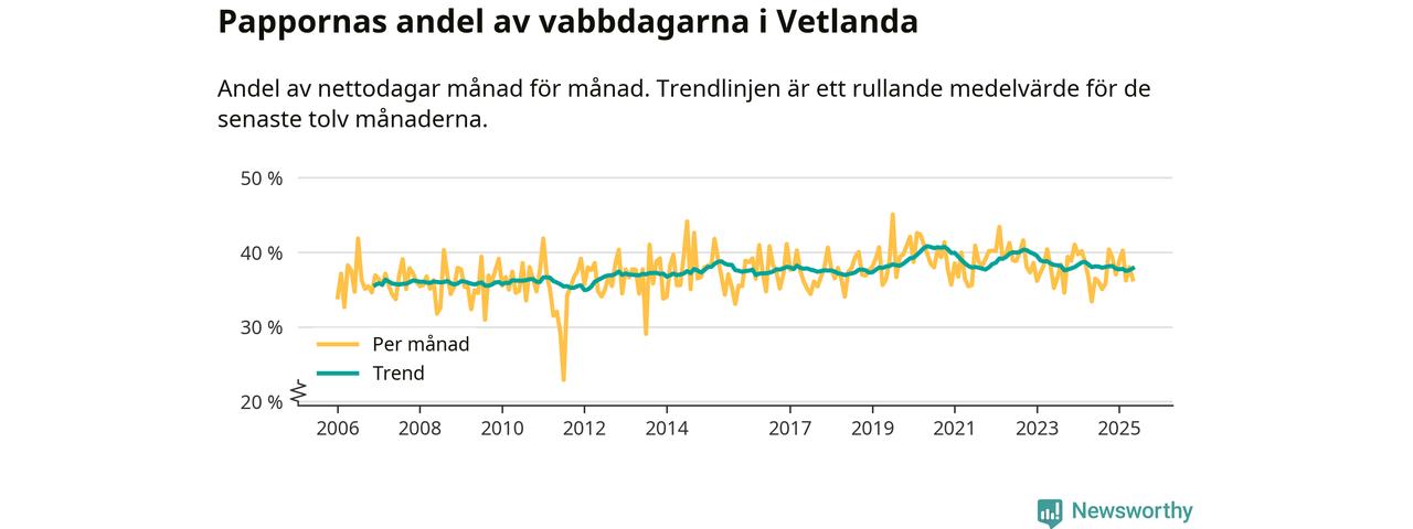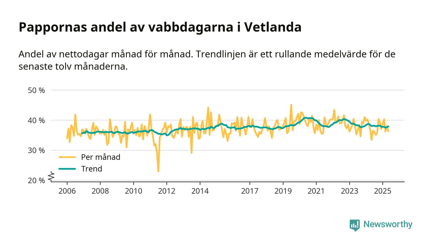 Vetlanda ligger en bit från ett jämställt uttag. Under de senaste tolv månaderna har männen stått för 38 procent av all vabb i kommunen. Pappornas uttag peakade våren 2020 då kommunens fäder var uppe i 41 procent av vabbdagarna 1.