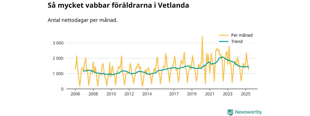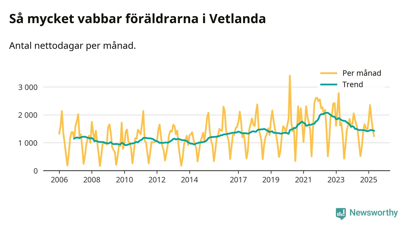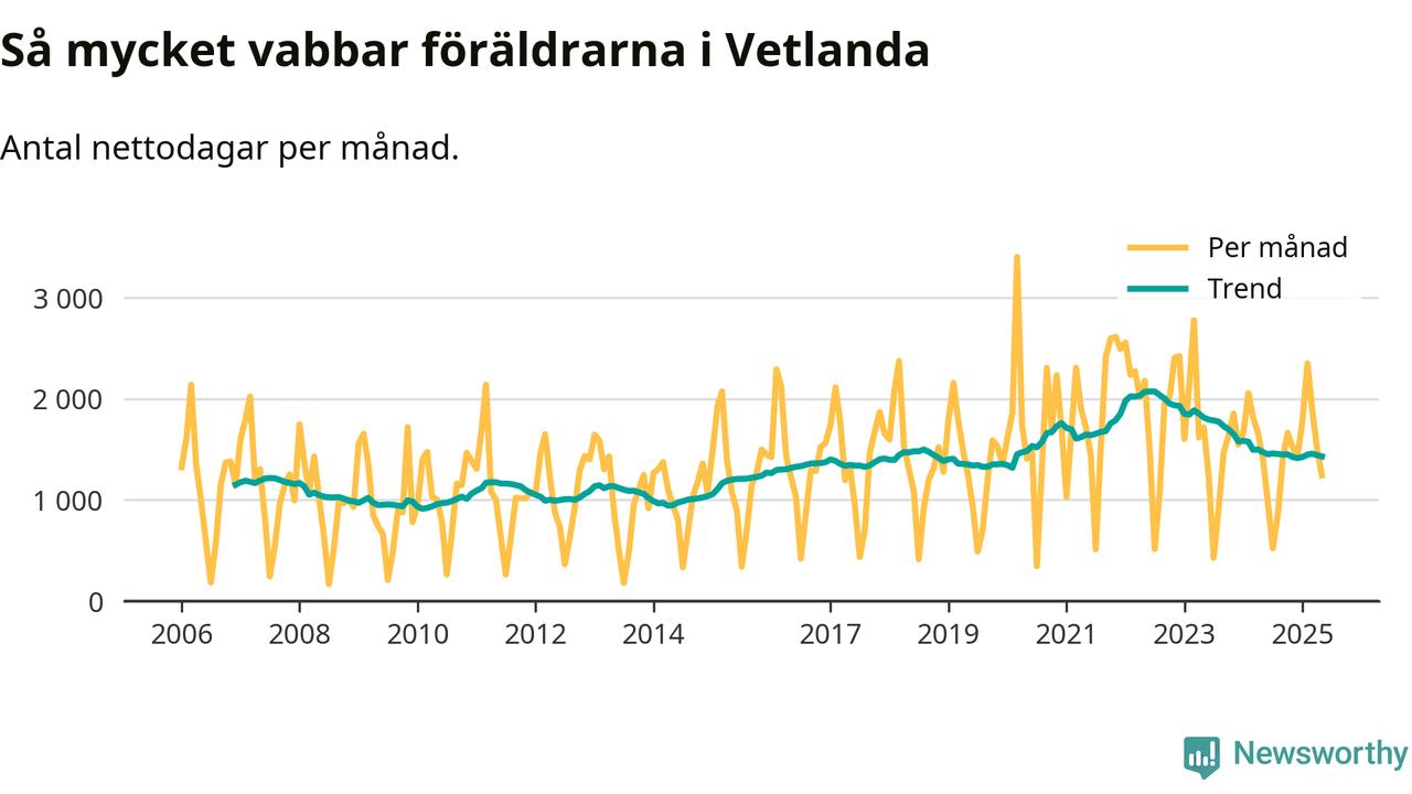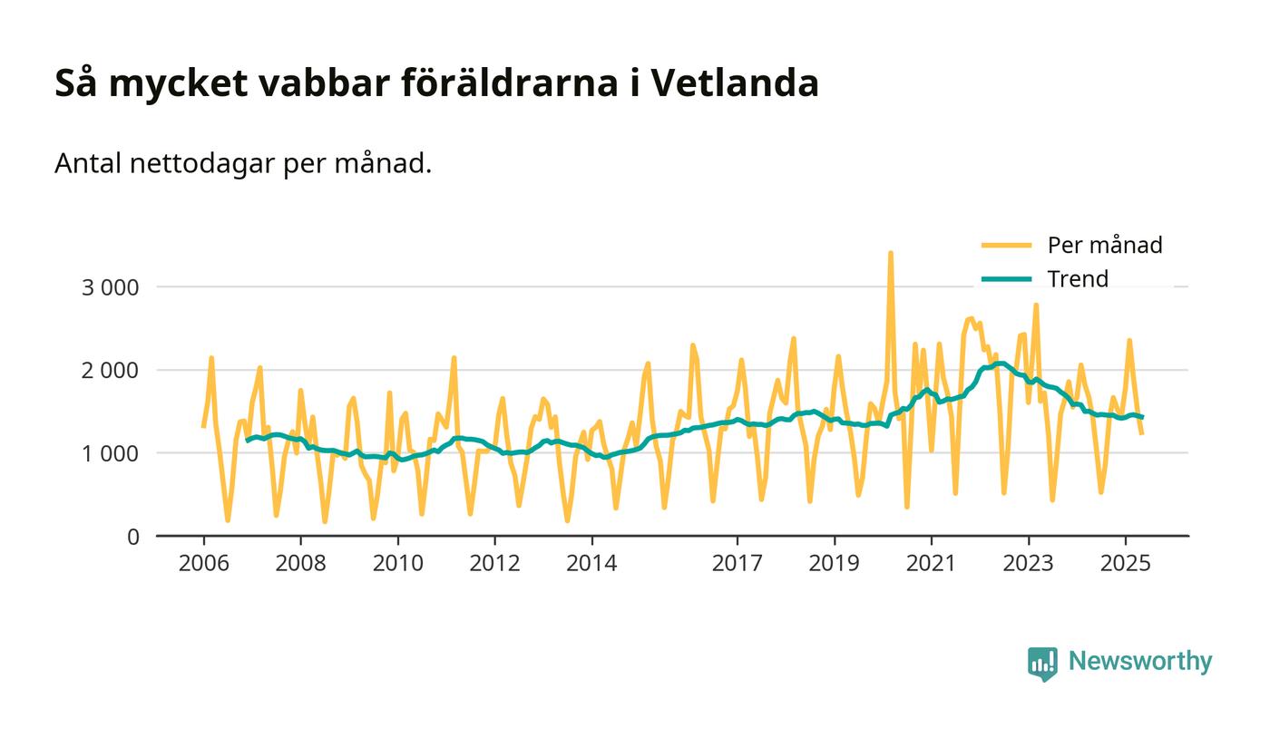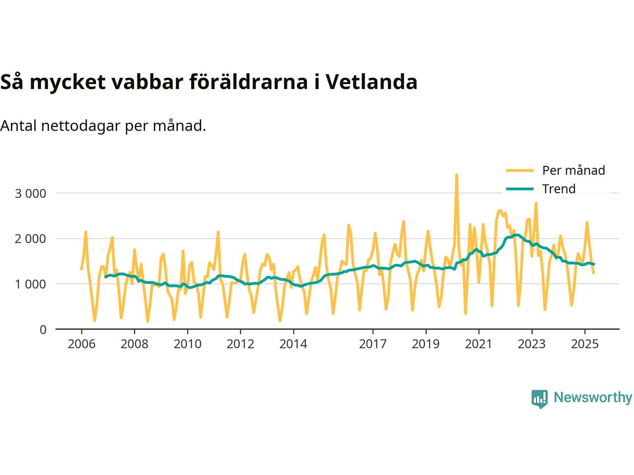 När coronapandemin drog in i mars 2020 peakade antalet vabbdagar både i Vetlanda kommun och i riket som helhet. Under de senaste två åren har vabbuttaget börjat minska igen.