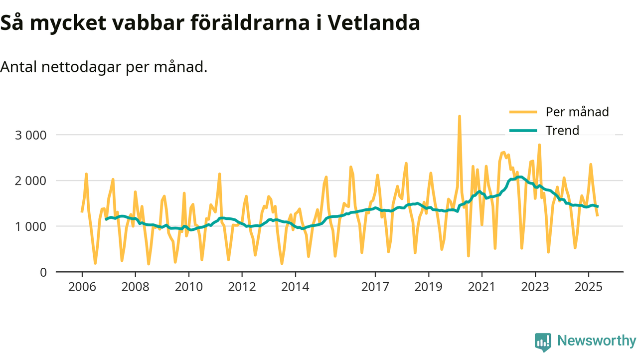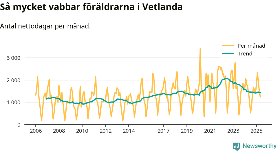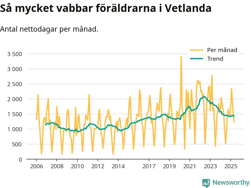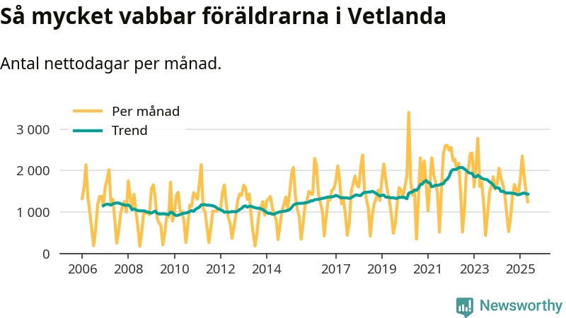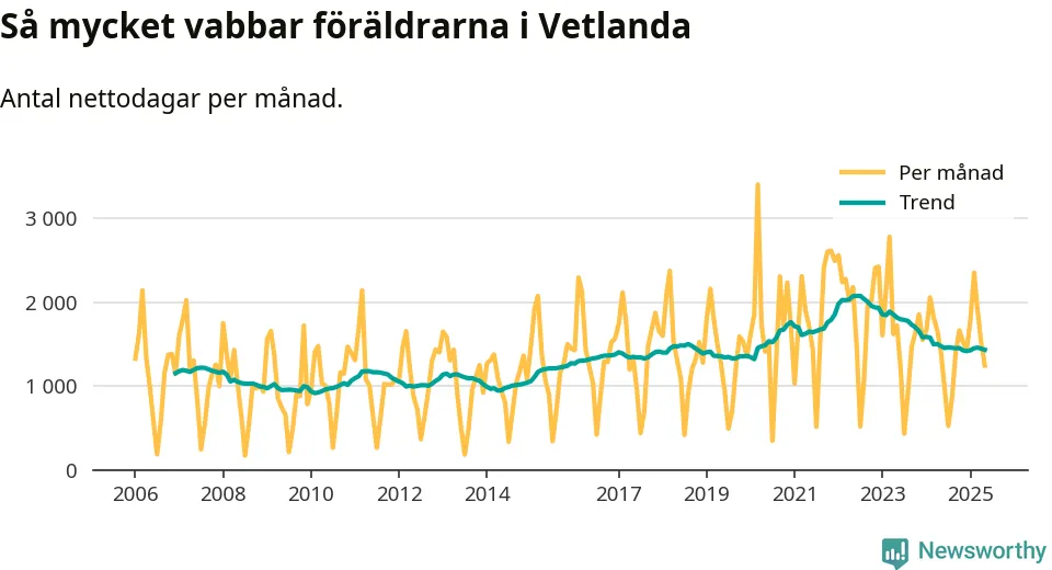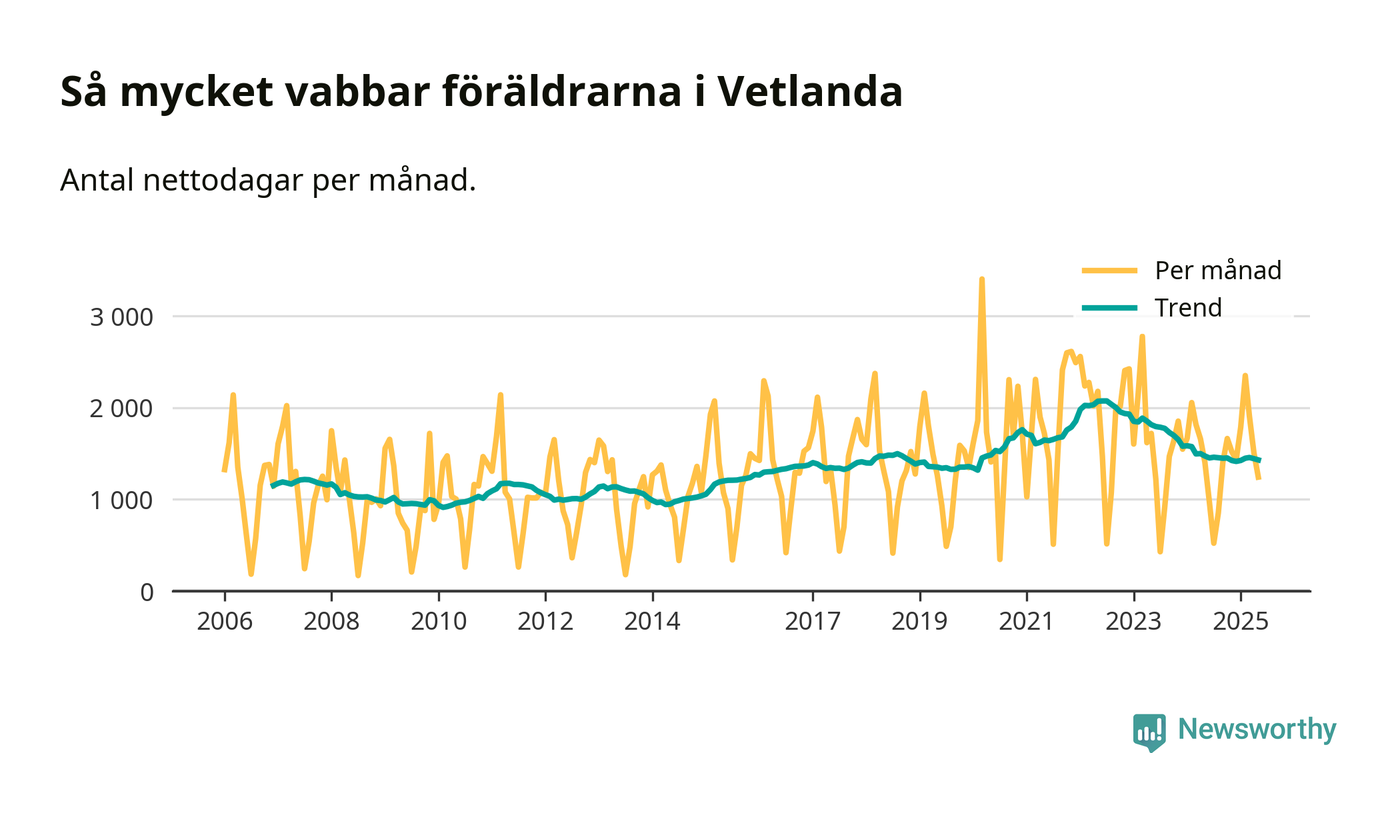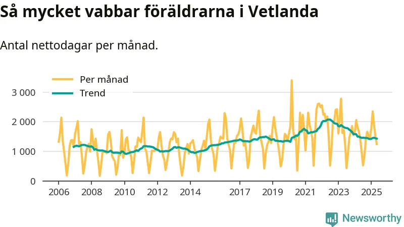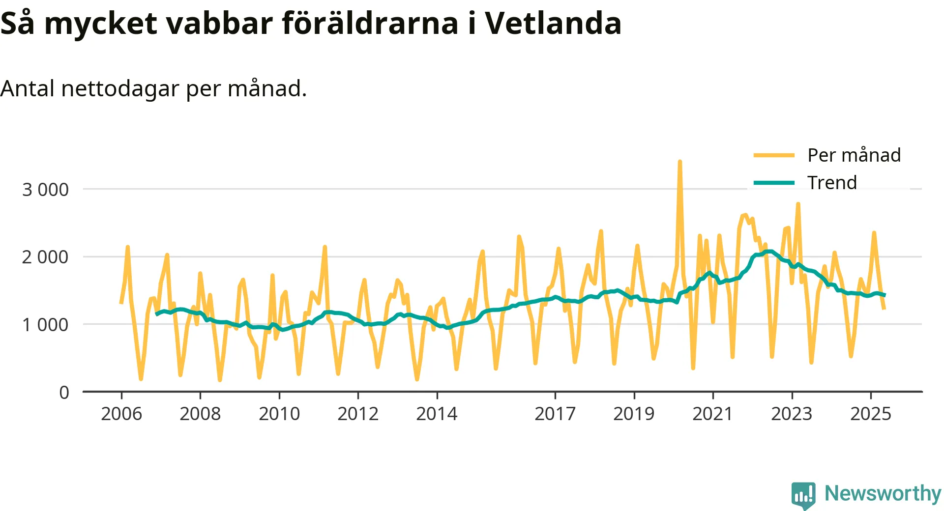 När coronapandemin drog in i mars 2020 peakade antalet vabbdagar både i Vetlanda kommun och i riket som helhet. Under de senaste två åren har vabbuttaget börjat minska igen.