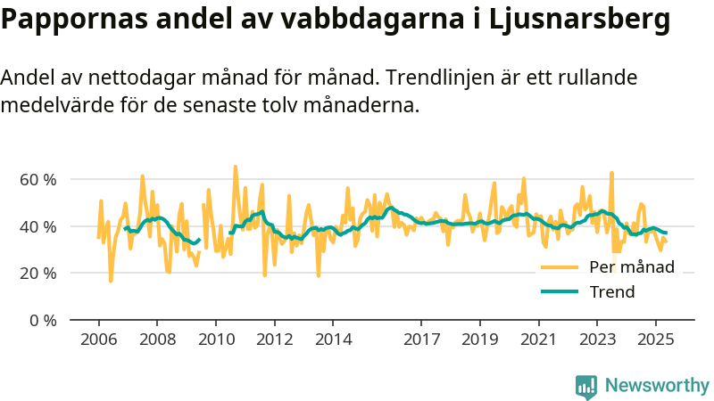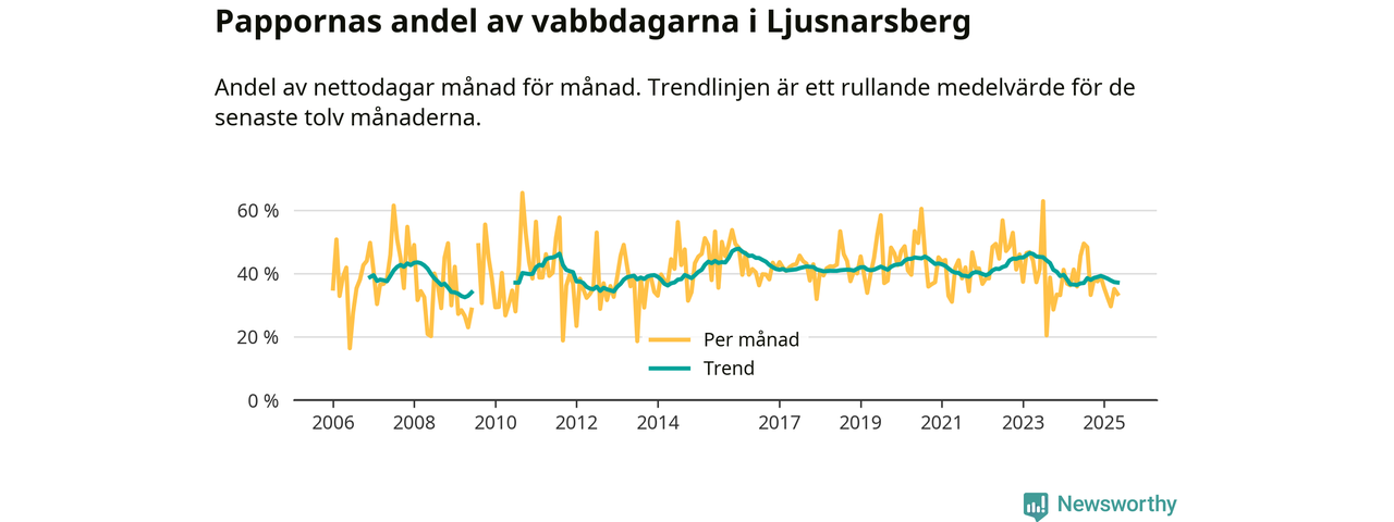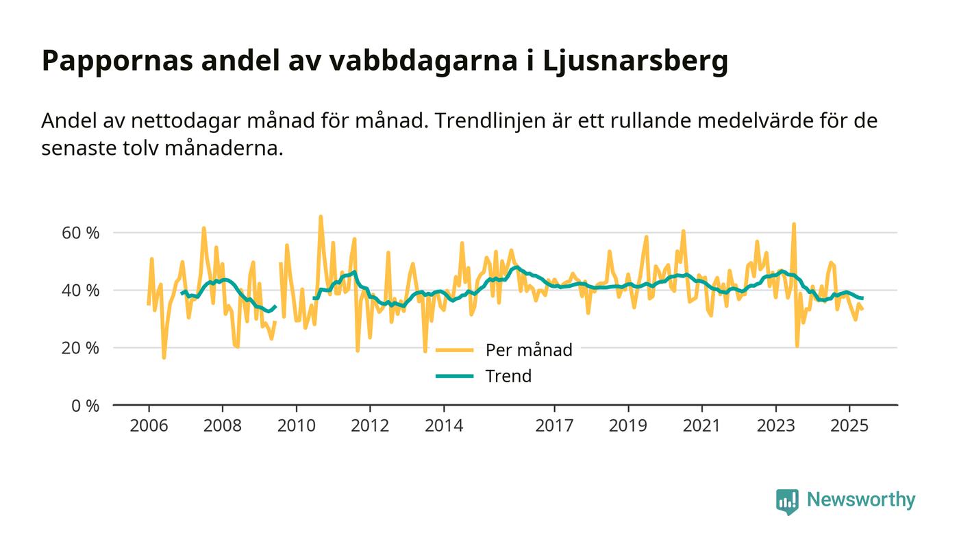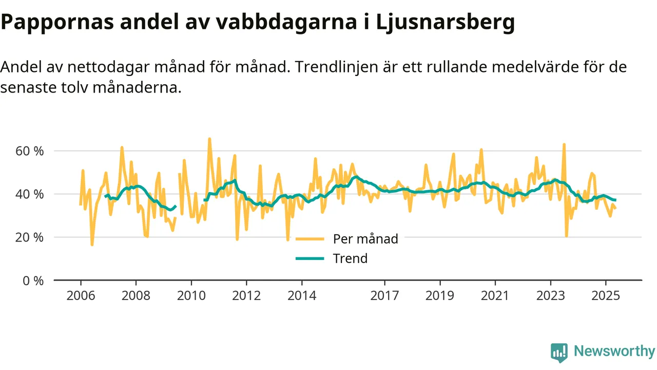 Ljusnarsberg ligger en bit från ett jämställt uttag. Under de senaste tolv månaderna har männen stått för 37 procent av all vabb i kommunen. Pappornas uttag peakade vintern 2016 då kommunens fäder var uppe i 48 procent av vabbdagarna 1.