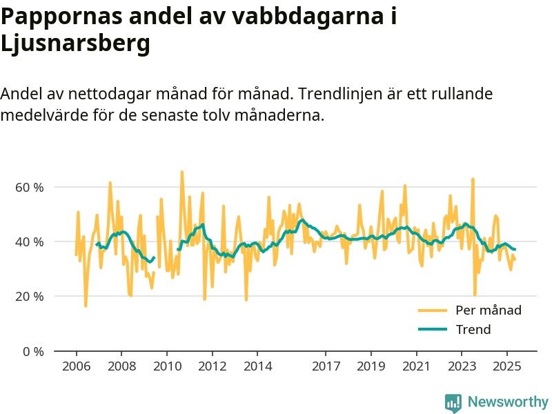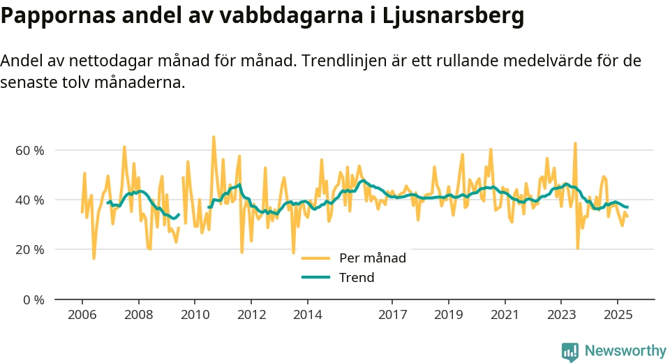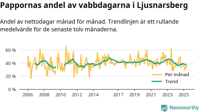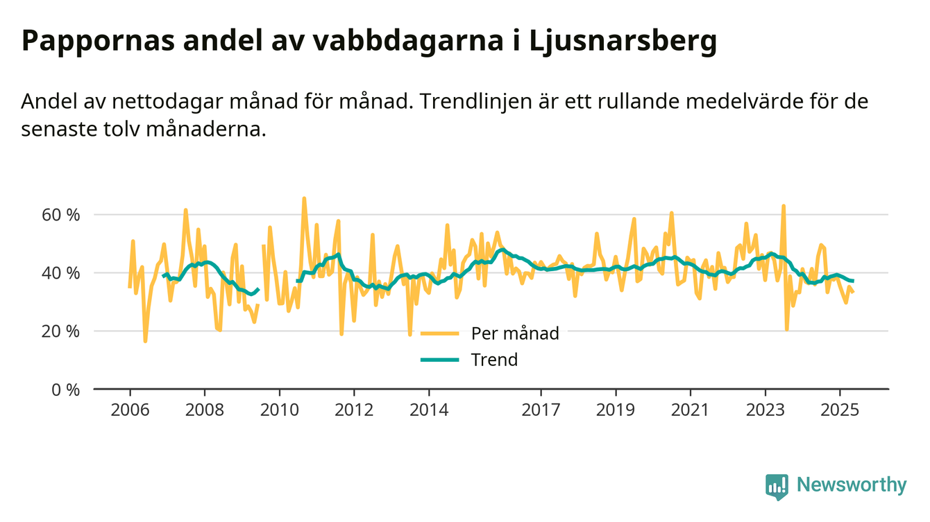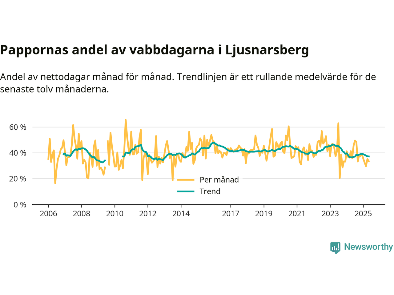 Ljusnarsberg ligger en bit från ett jämställt uttag. Under de senaste tolv månaderna har männen stått för 37 procent av all vabb i kommunen. Pappornas uttag peakade vintern 2016 då kommunens fäder var uppe i 48 procent av vabbdagarna 1.