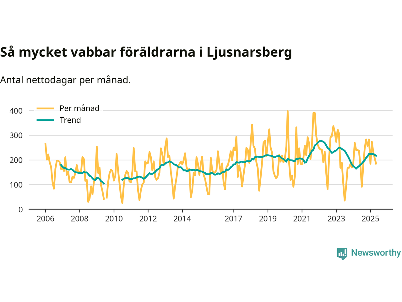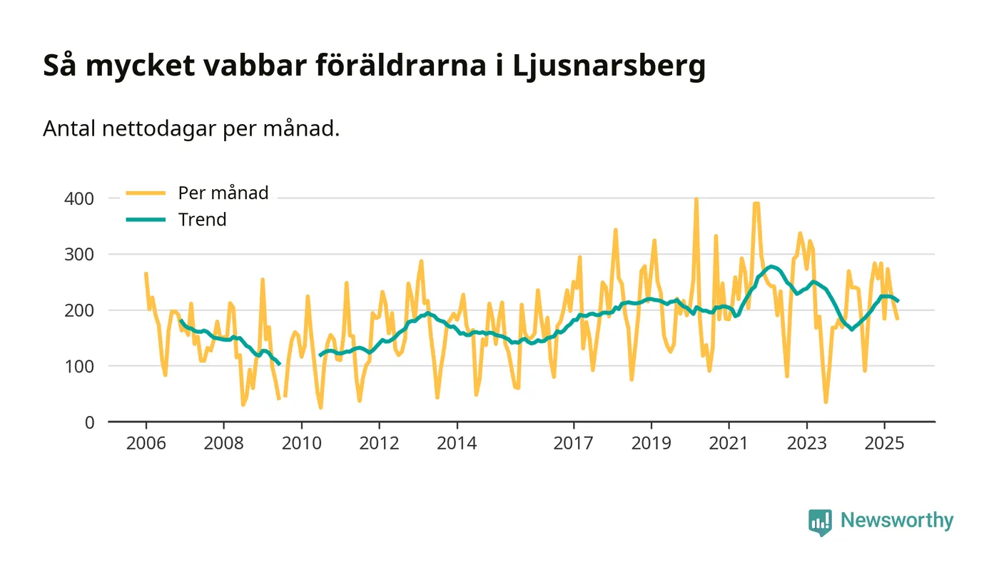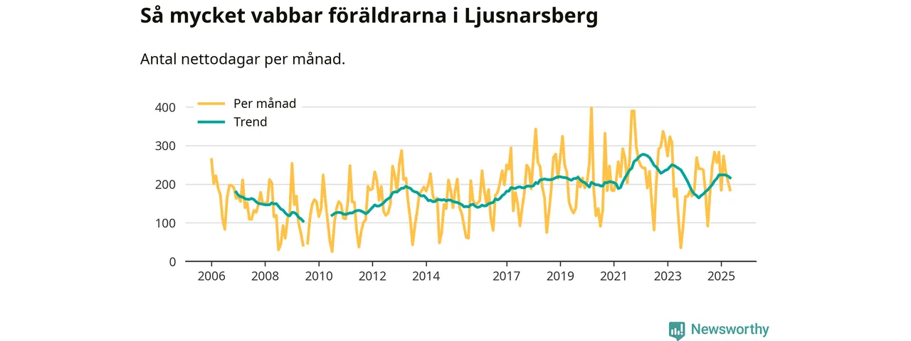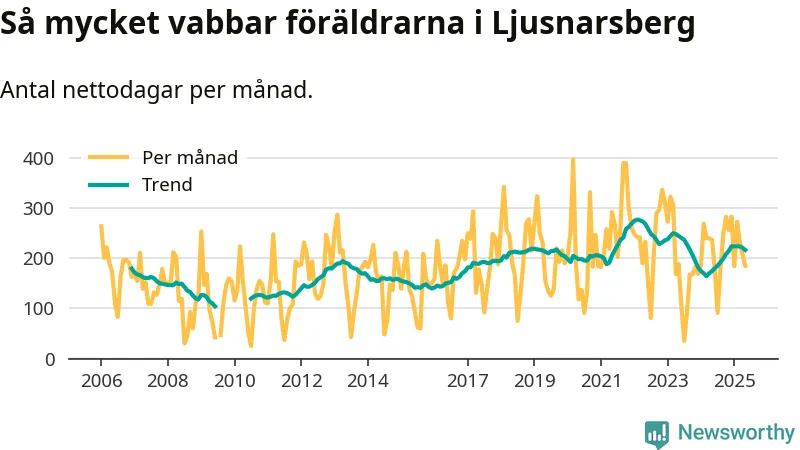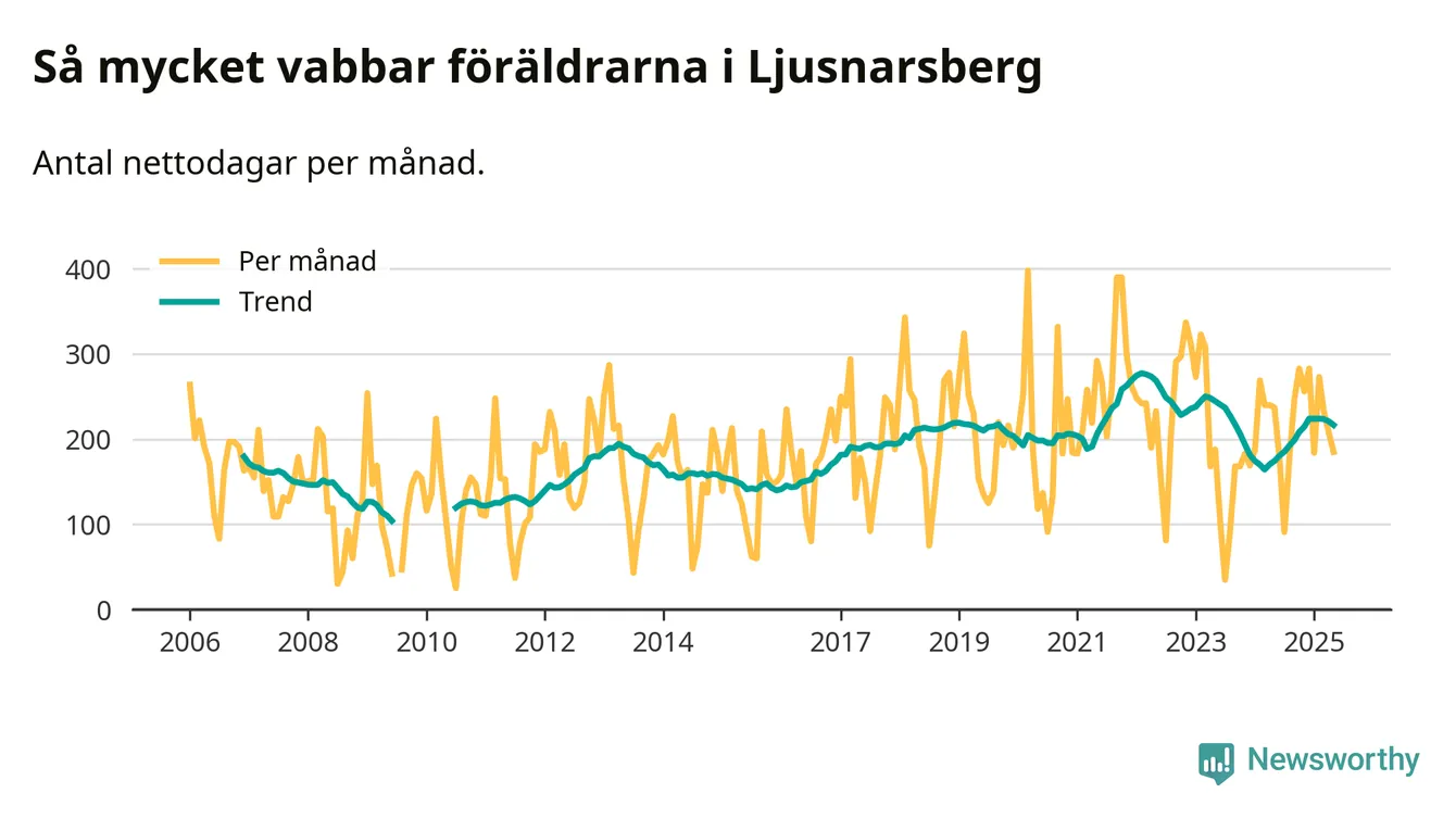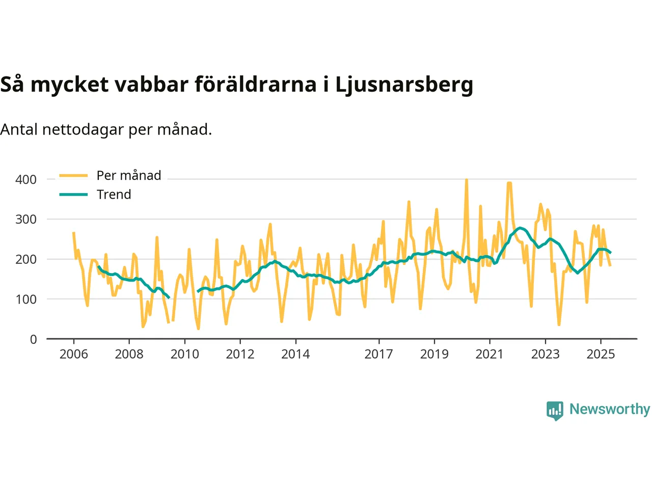 När coronapandemin drog in i mars 2020 peakade antalet vabbdagar både i Ljusnarsbergs kommun och i riket som helhet. Under de senaste två åren har vabbuttaget börjat minska igen.